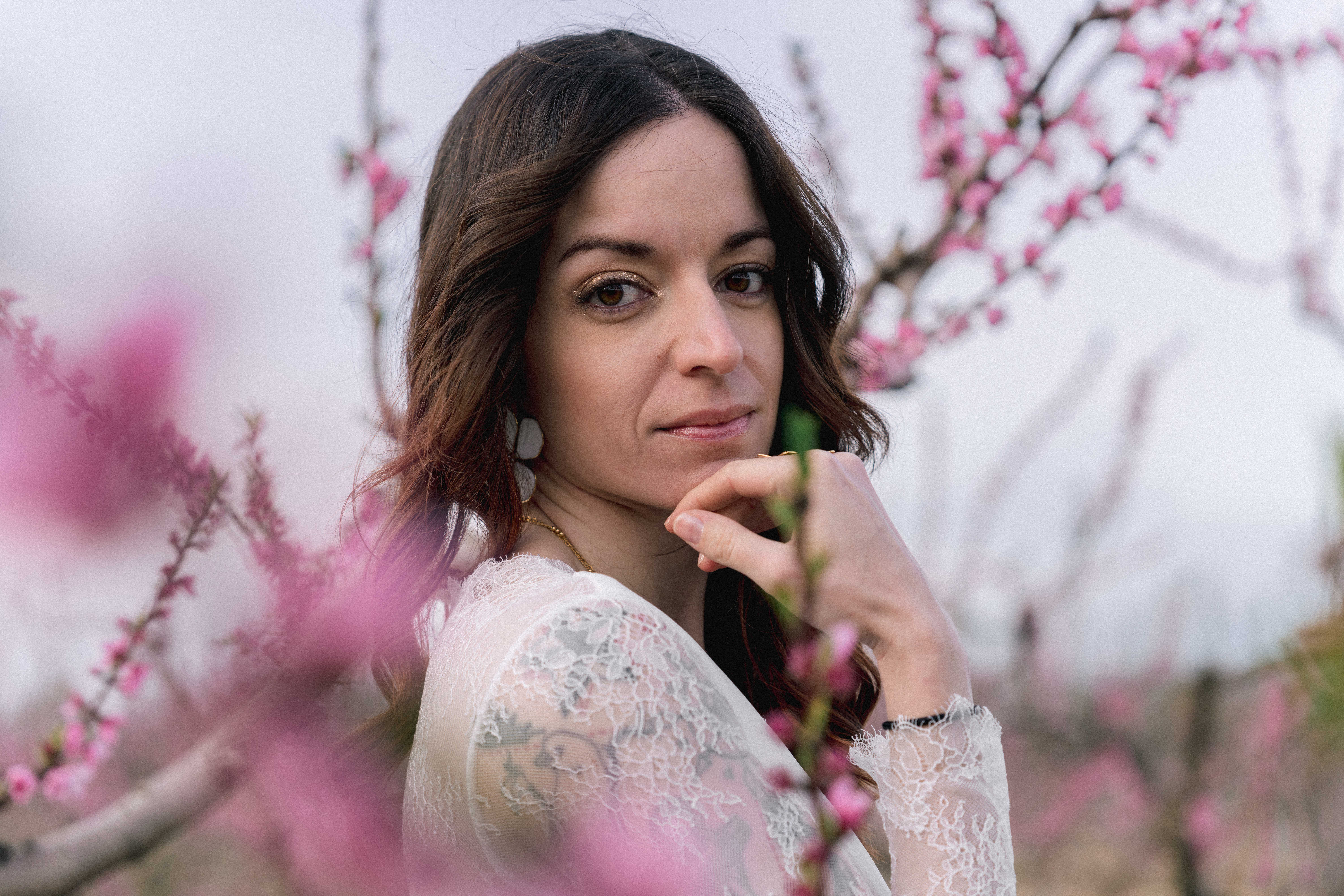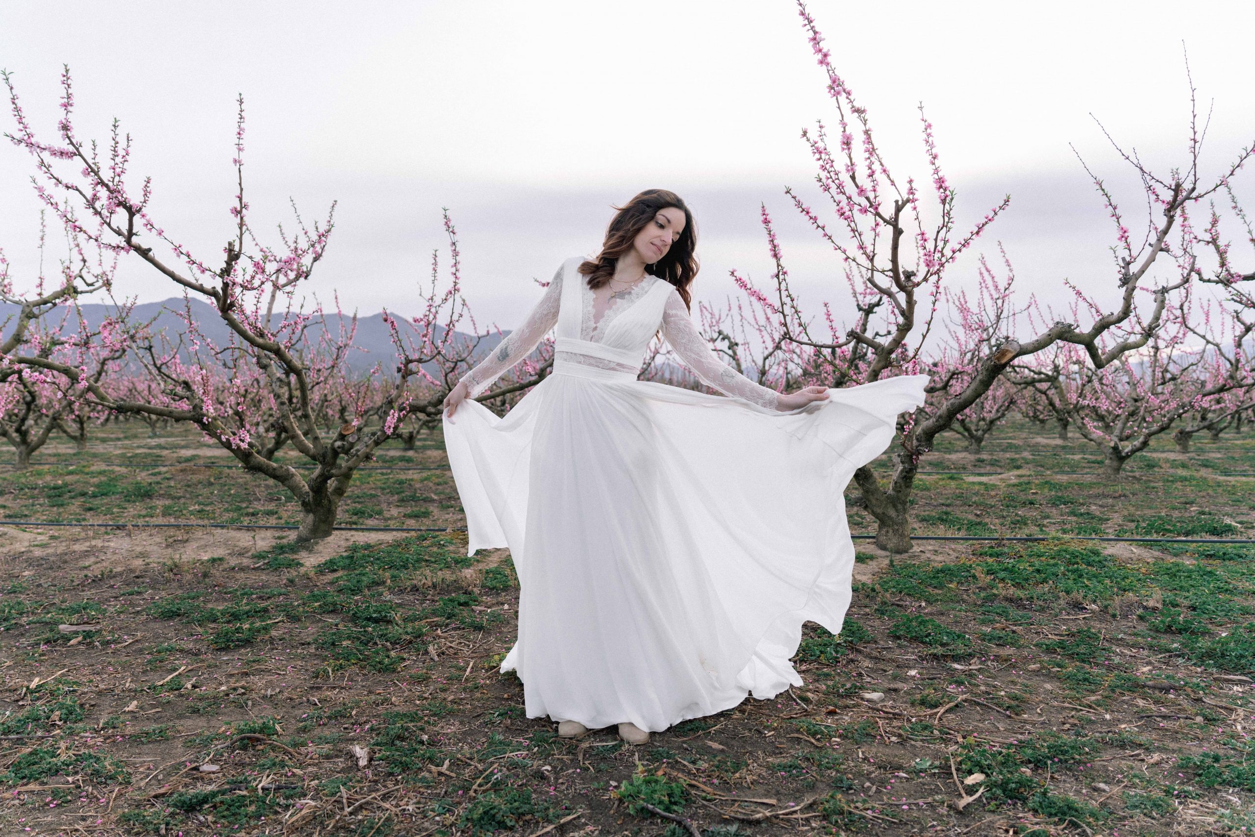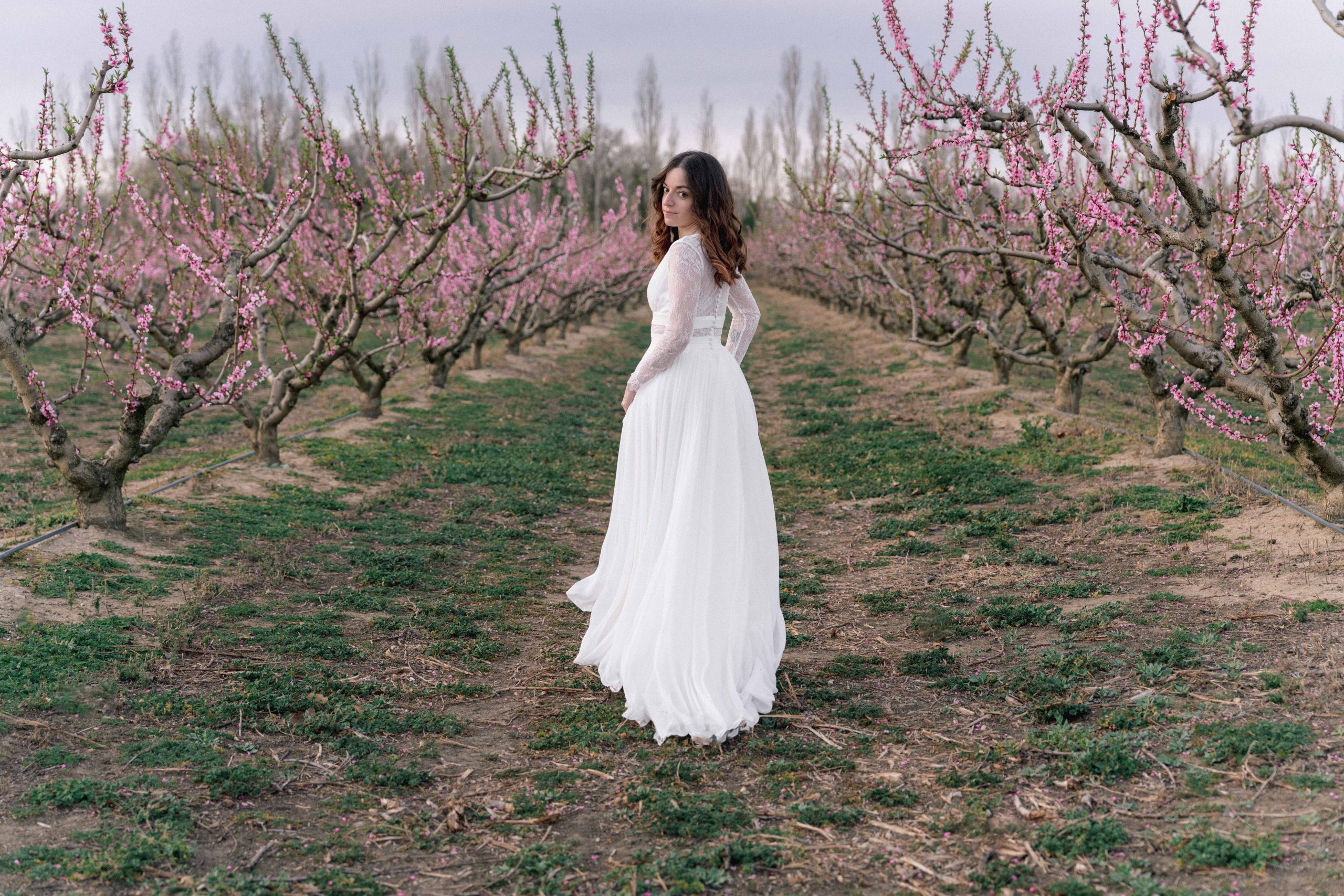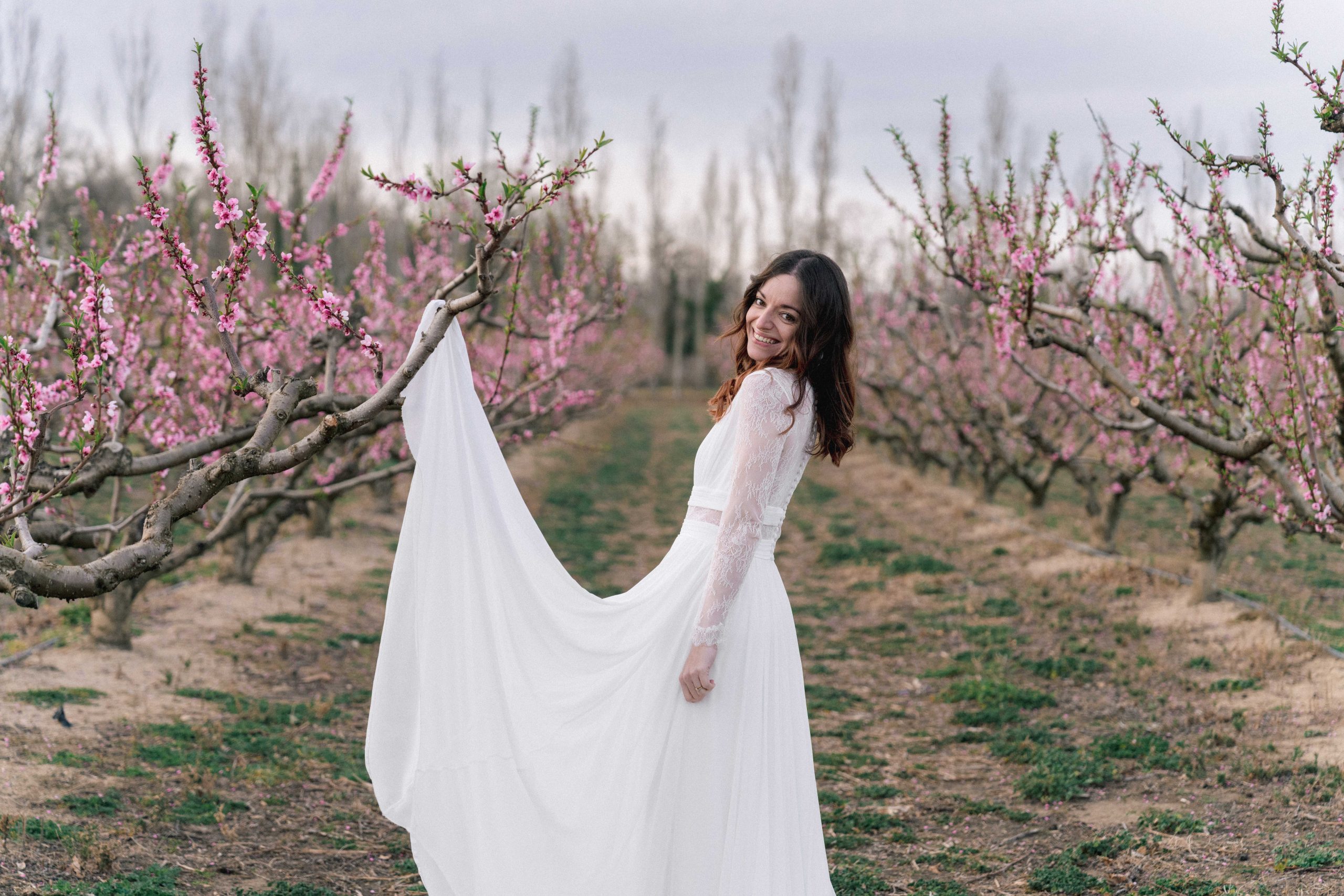 En fin d’après-midi, Nelly, sublime en robe de mariée, s’est laissée envelopper par la magie de la forêt de Lavail. Sous les derniers rayons du soleil, chaque fleur de pêcher à Palau-del-Vidre a doucement célébré son passage.