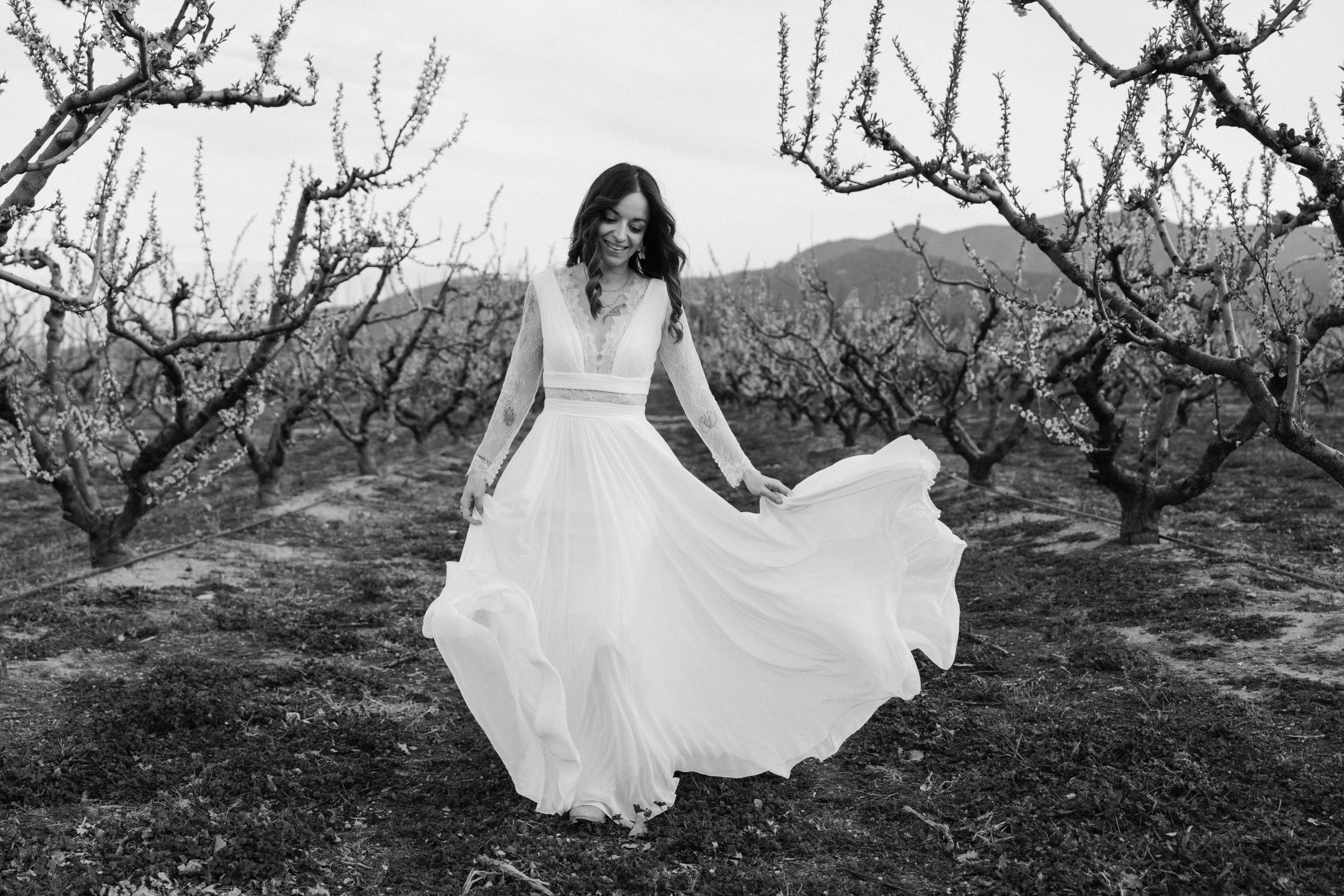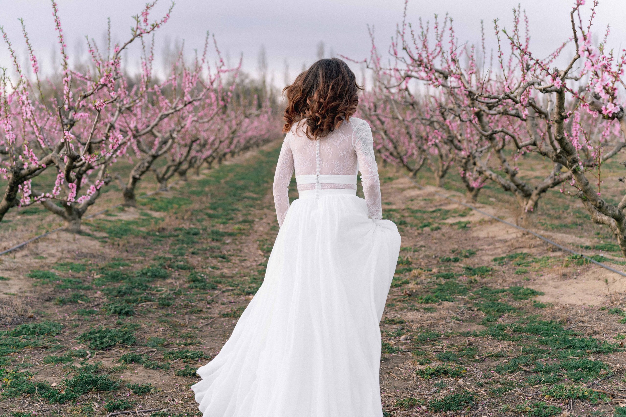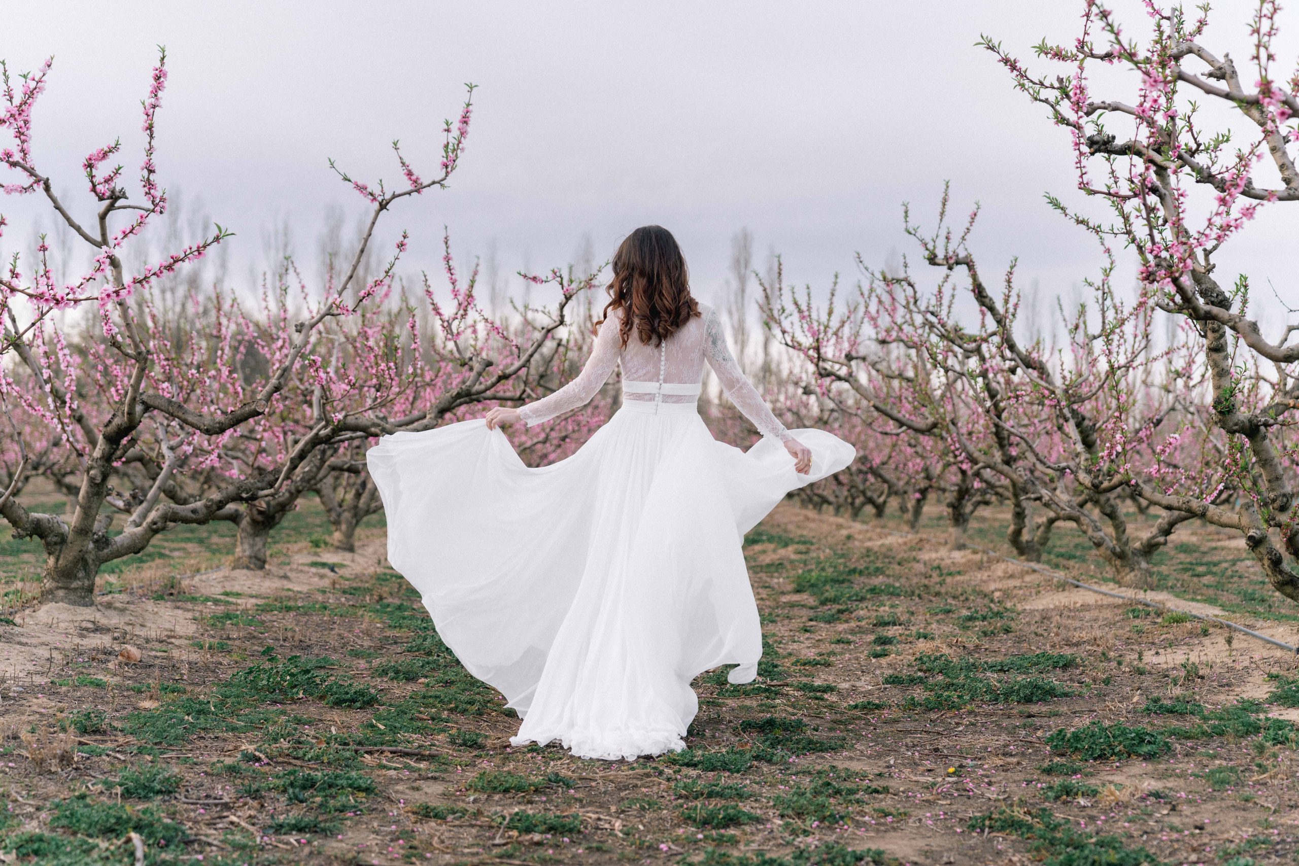 En fin d’après-midi, Nelly, sublime en robe de mariée, s’est laissée envelopper par la magie de la forêt de Lavail. Sous les derniers rayons du soleil, chaque fleur de pêcher à Palau-del-Vidre a doucement célébré son passage.