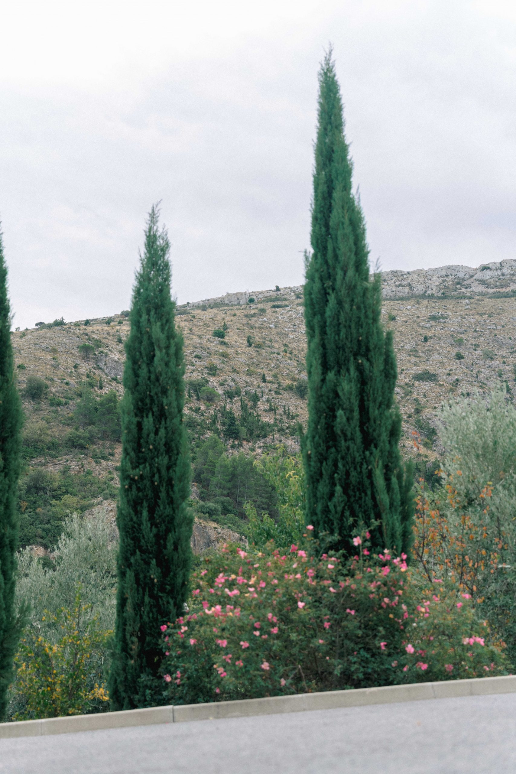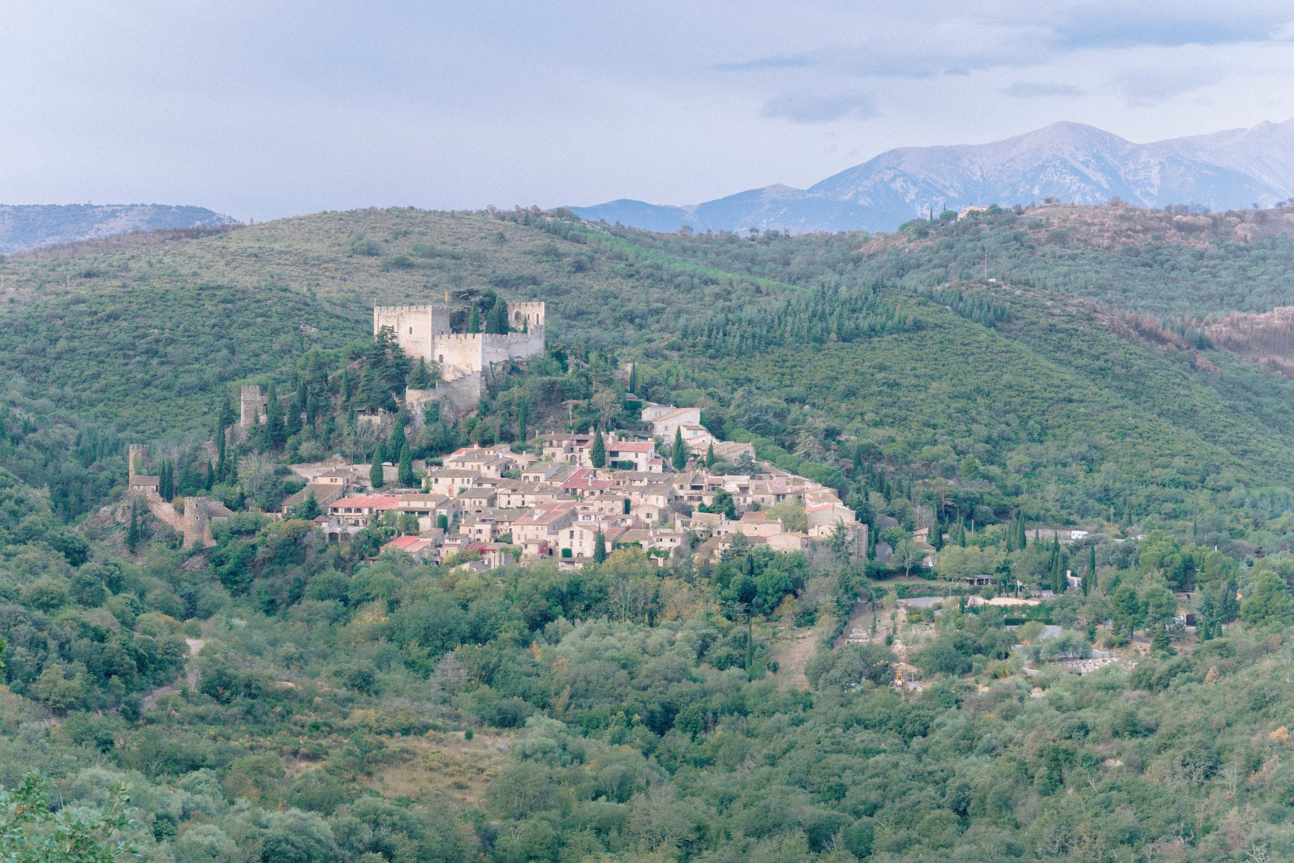 Vue panoramique du village de Castelnou, classé parmi les plus beaux villages de France, servant de décor à une séance photo de grossesse avec Marie-Ève, Philippe et Louna.
