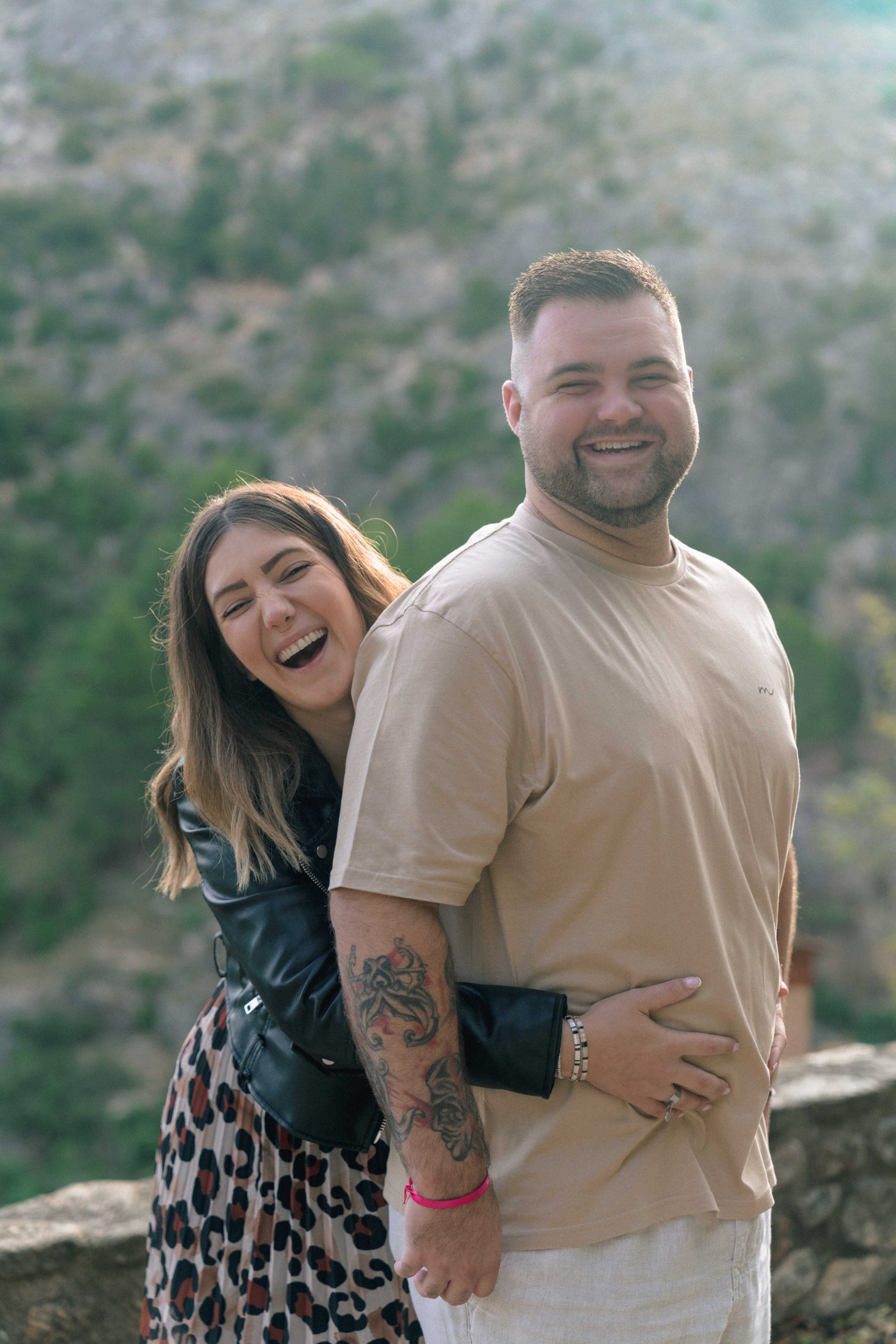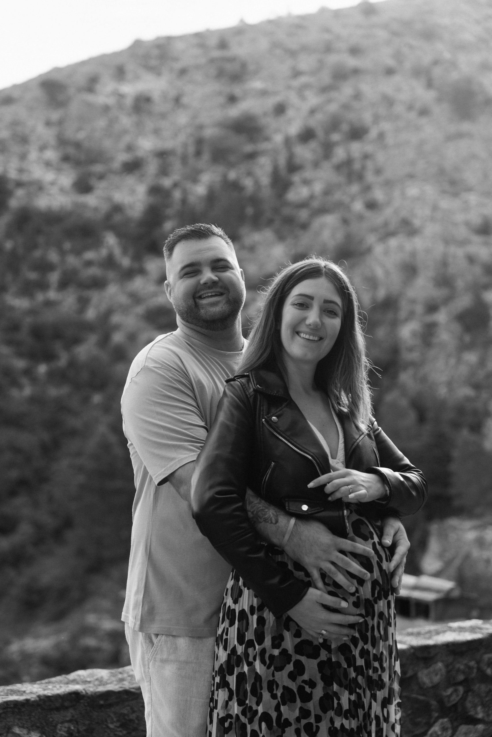 Marie-Ève, future maman, derrière Philippe, lui tenant le ventre avec un rire joyeux, un instant de tendresse et de complicité capturé lors de leur séance photo de grossesse à Castelnou (66).