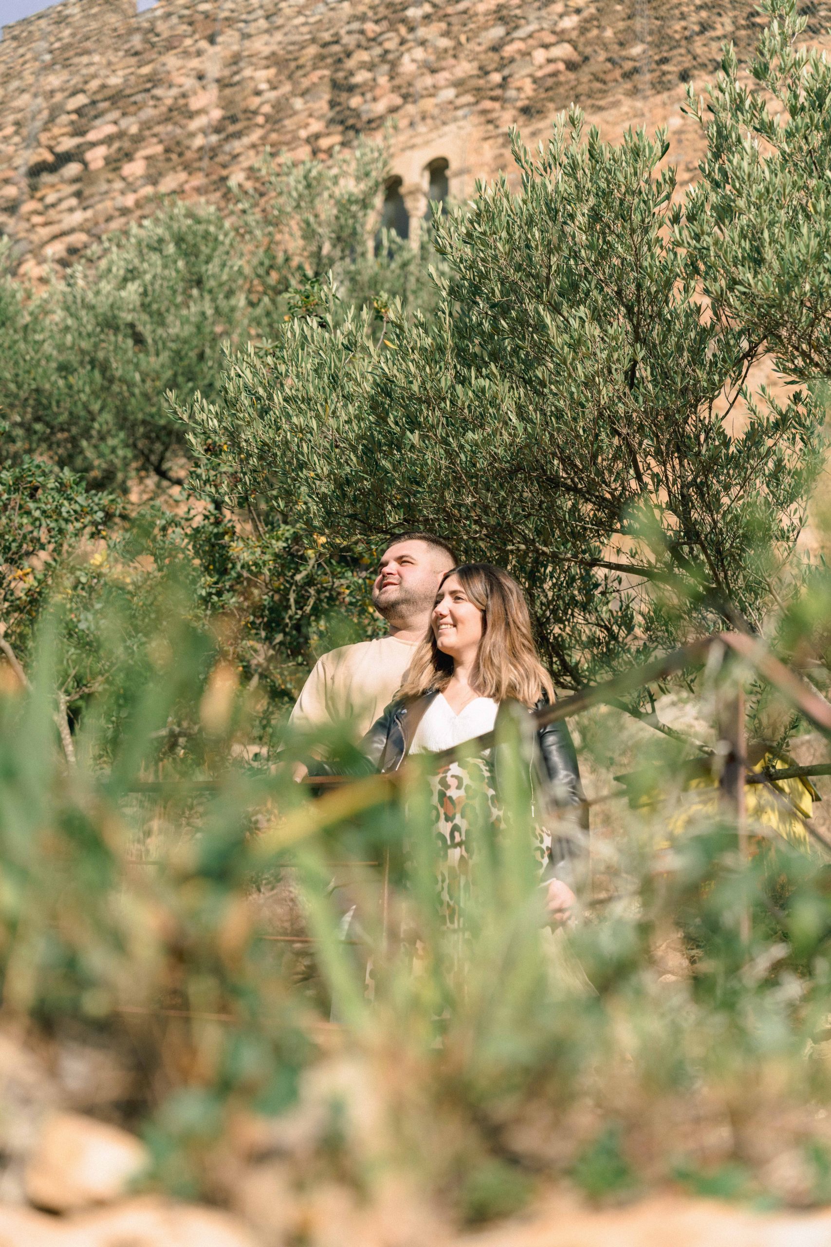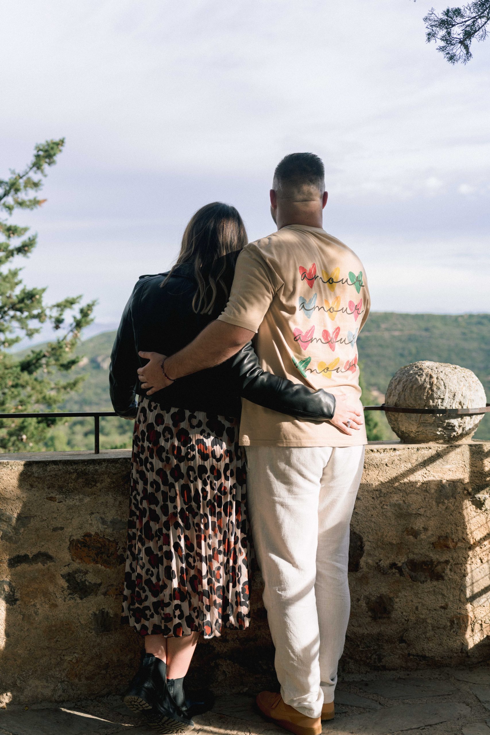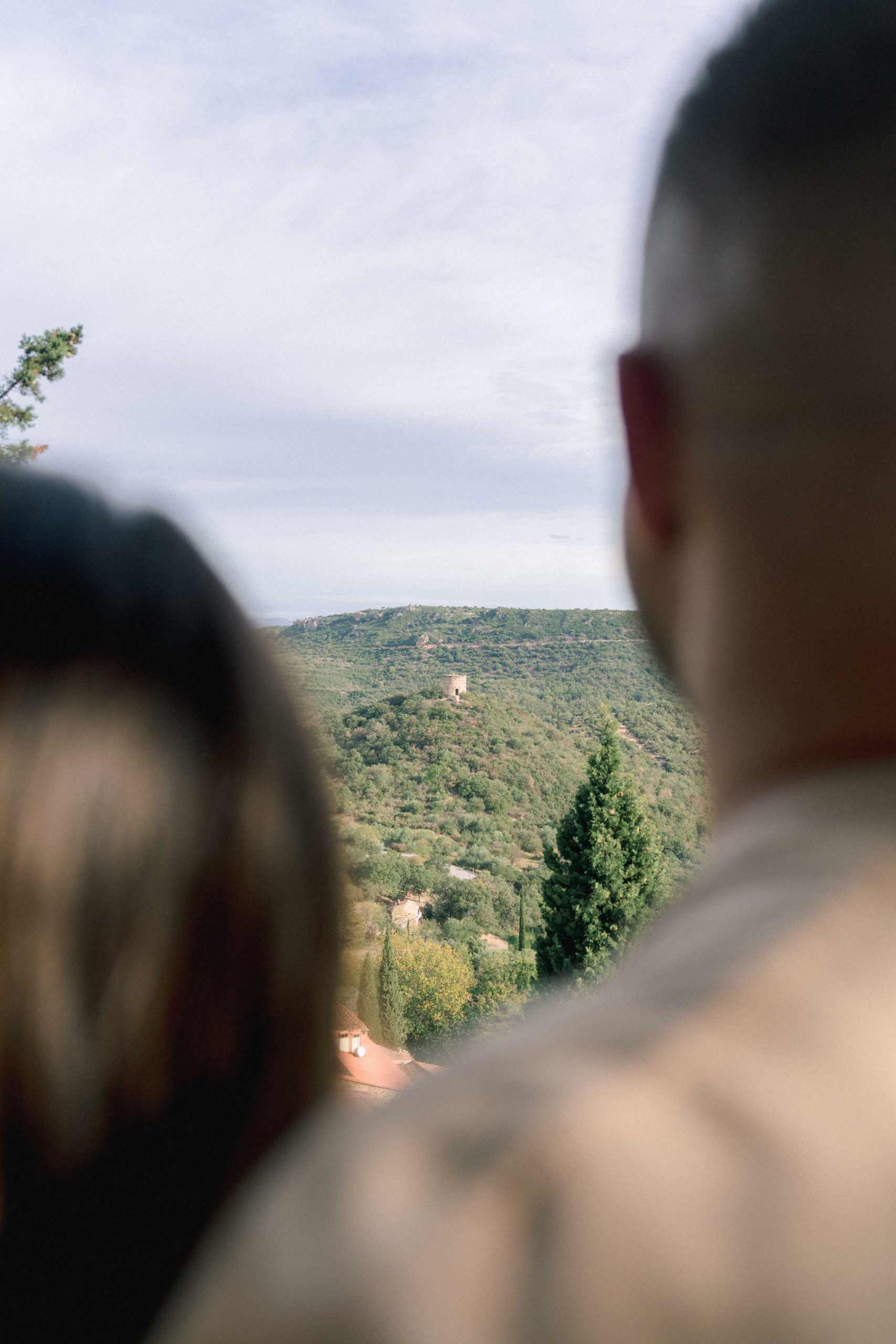 Marie-Ève et Philippe regardant au loin depuis une vue en contrebas à Castelnou (66), Philippe chuchotant tendrement des mots d'amour à l'oreille de Marie-Ève, un instant d'intimité et de complicité profonde.
