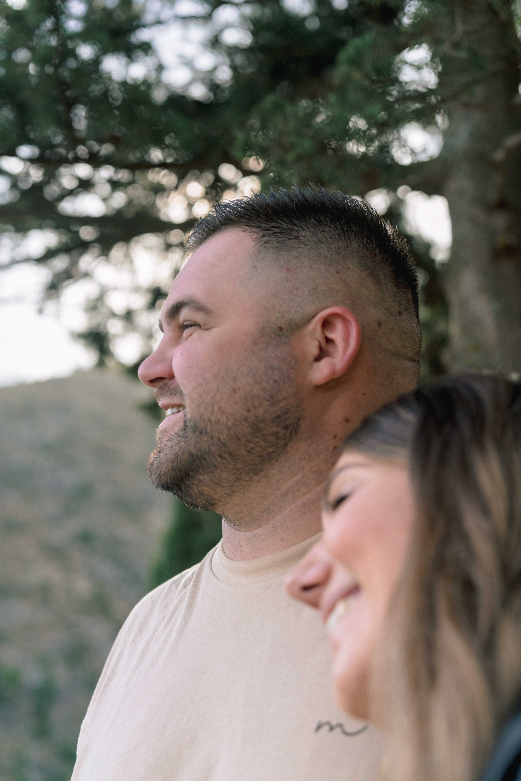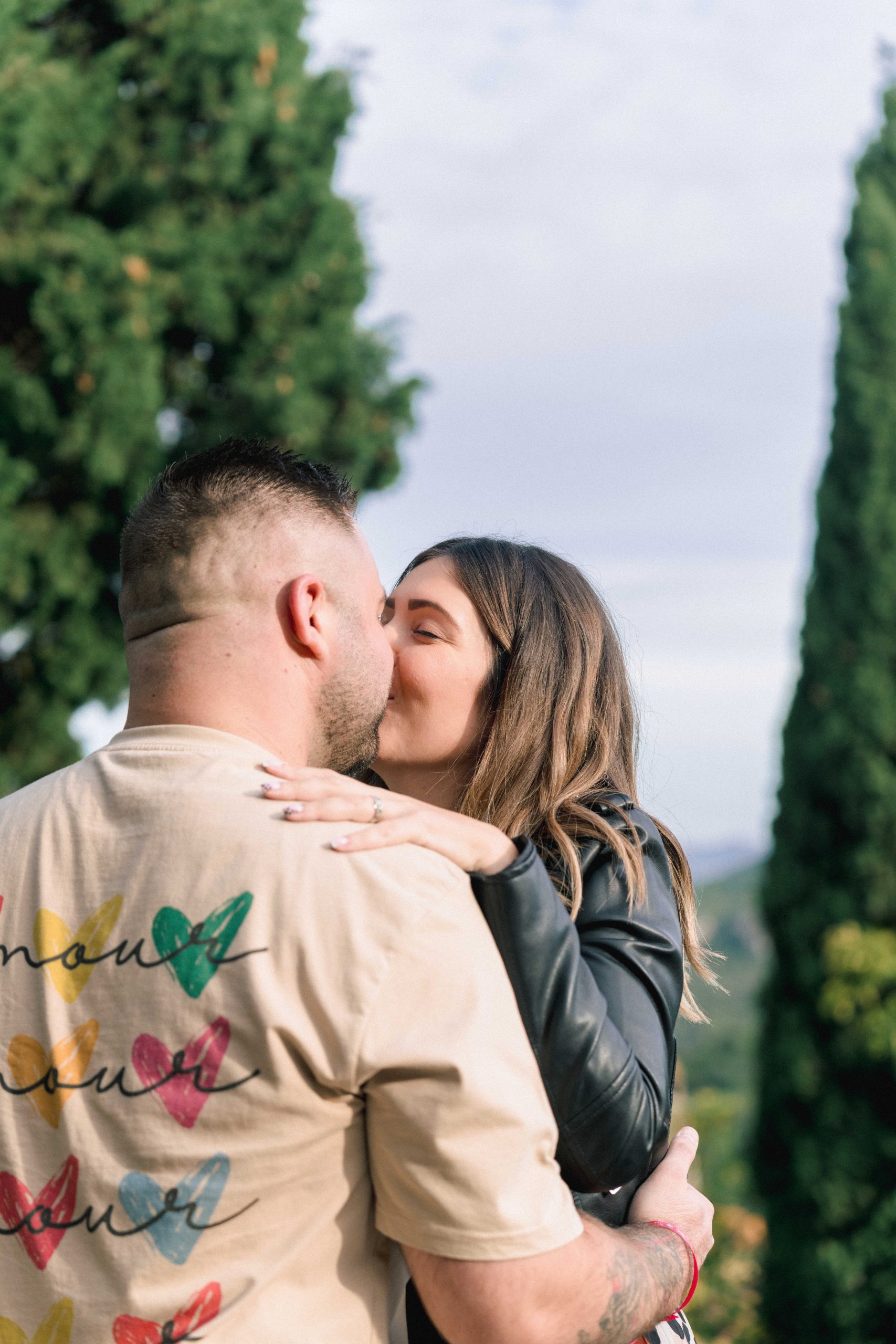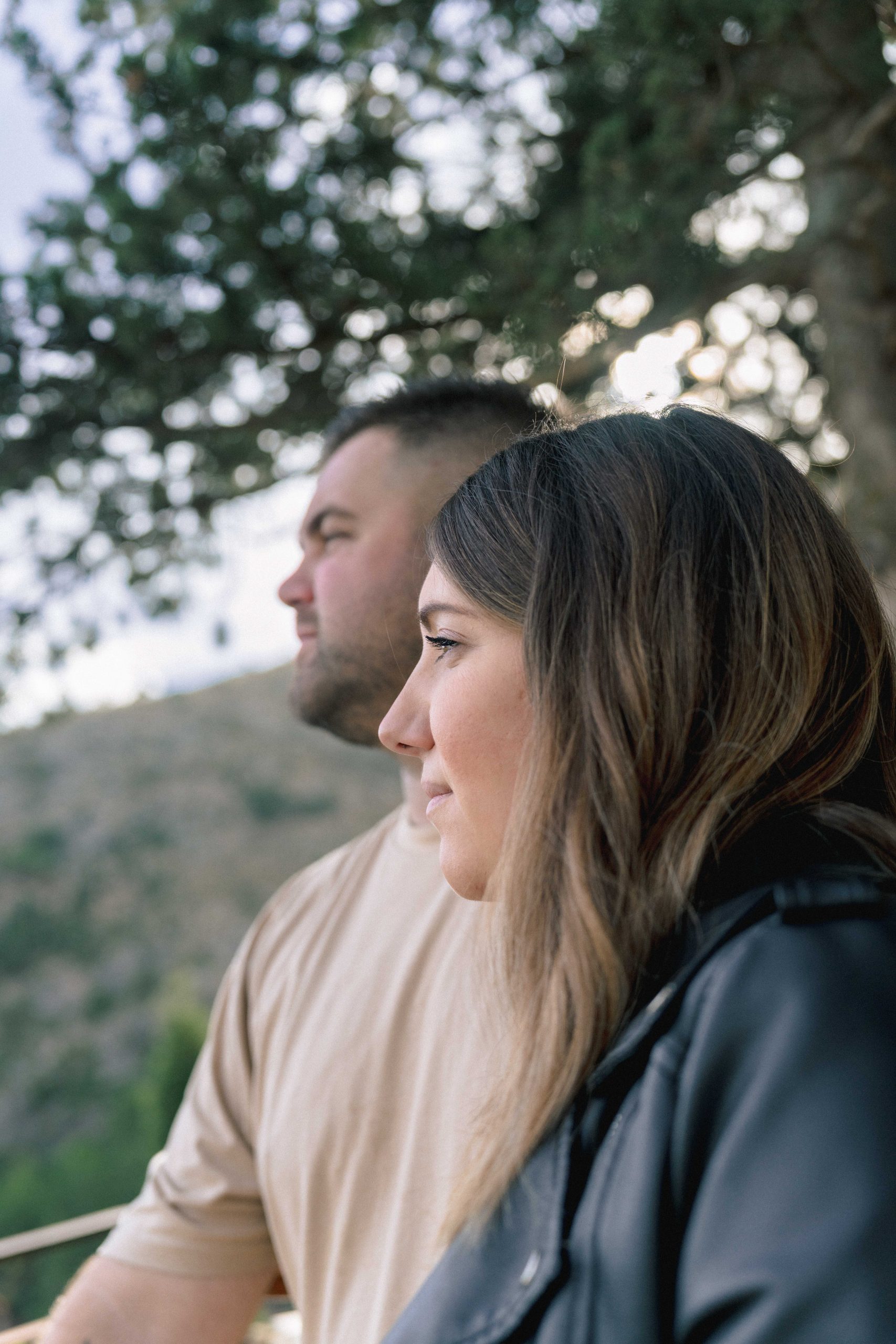 Marie-Ève et Philippe regardant au loin depuis une vue en contrebas à Castelnou (66), Philippe chuchotant tendrement des mots d'amour à l'oreille de Marie-Ève, un instant d'intimité et de complicité profonde.