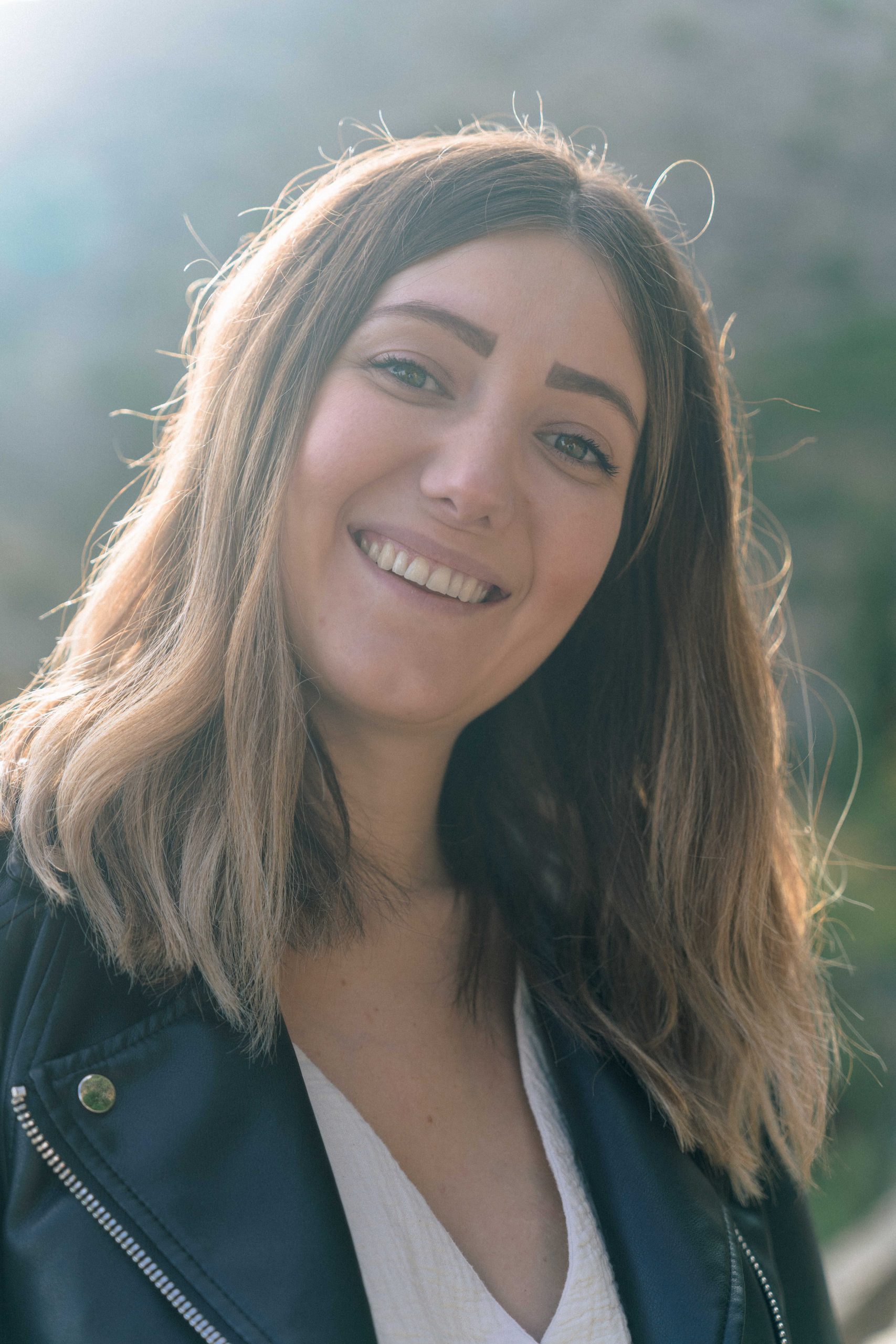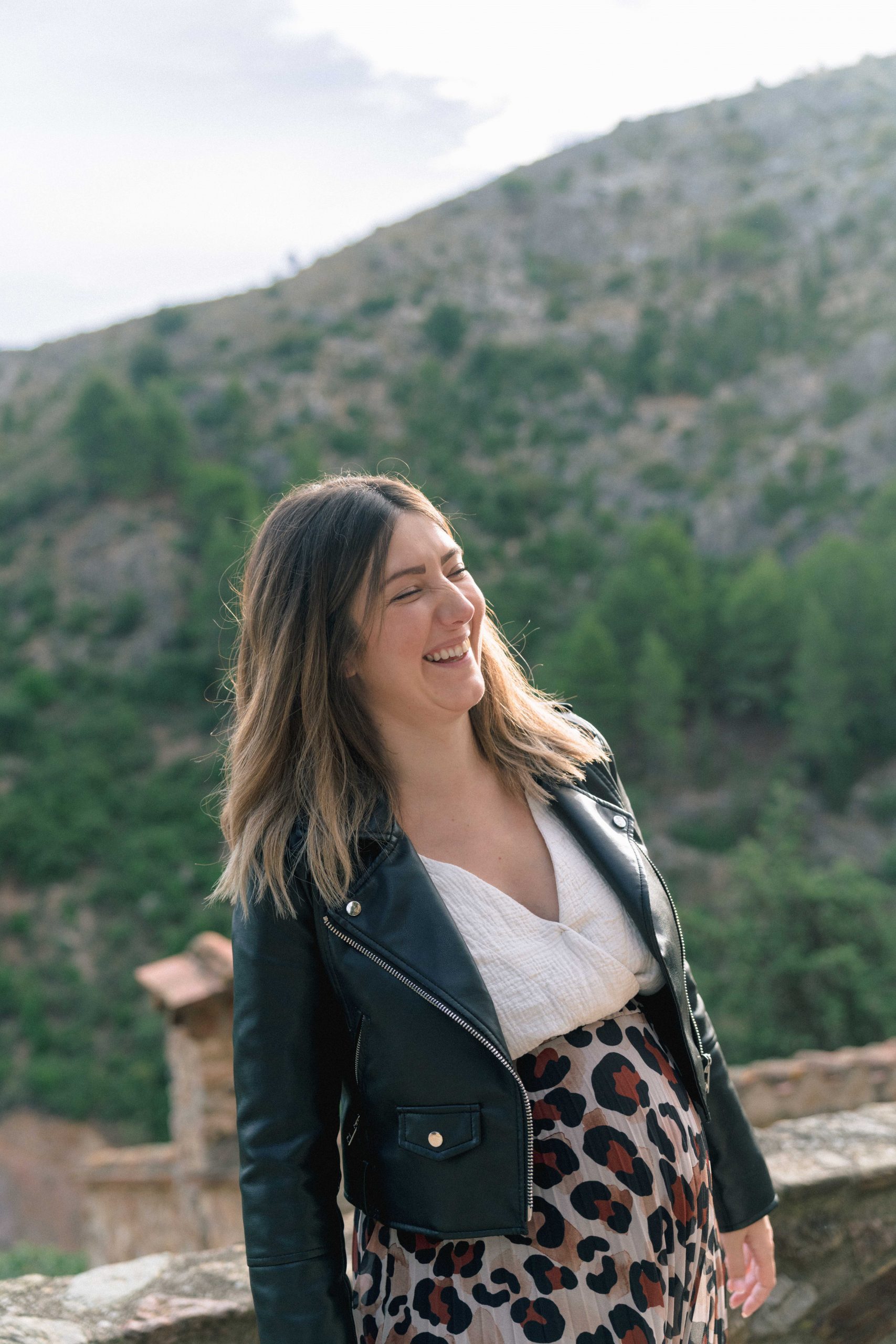 Portrait spontané de Marie-Ève, future maman, riant joyeusement lors de sa séance photo de grossesse à Castelnou (66), illustrant son bonheur et sa légèreté.