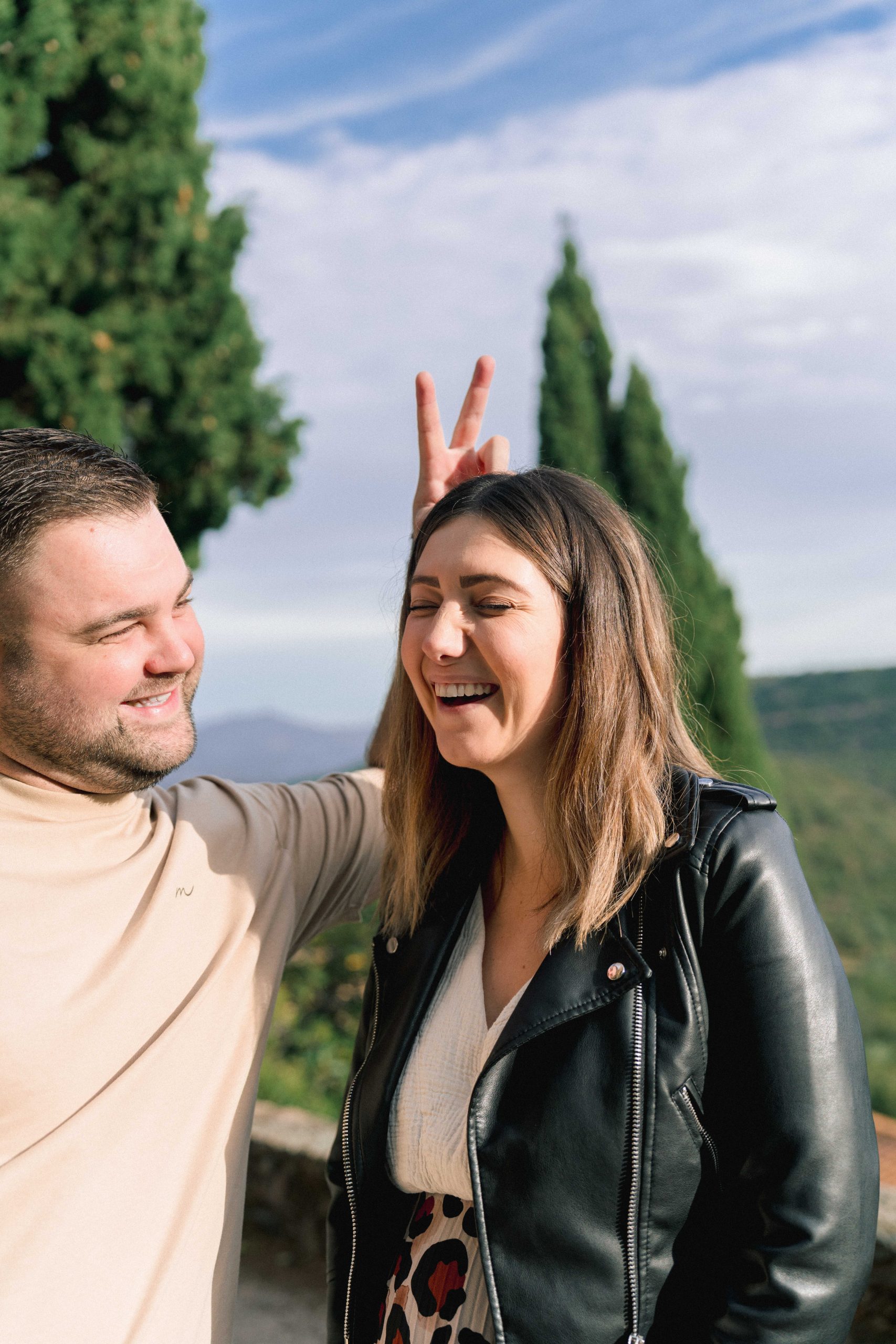 Philippe, futur papa, faisant des oreilles de lapin avec ses doigts à Marie-Ève, future maman, un geste amusant et affectueux capturé lors de leur séance photo de grossesse à Castelnou (66).