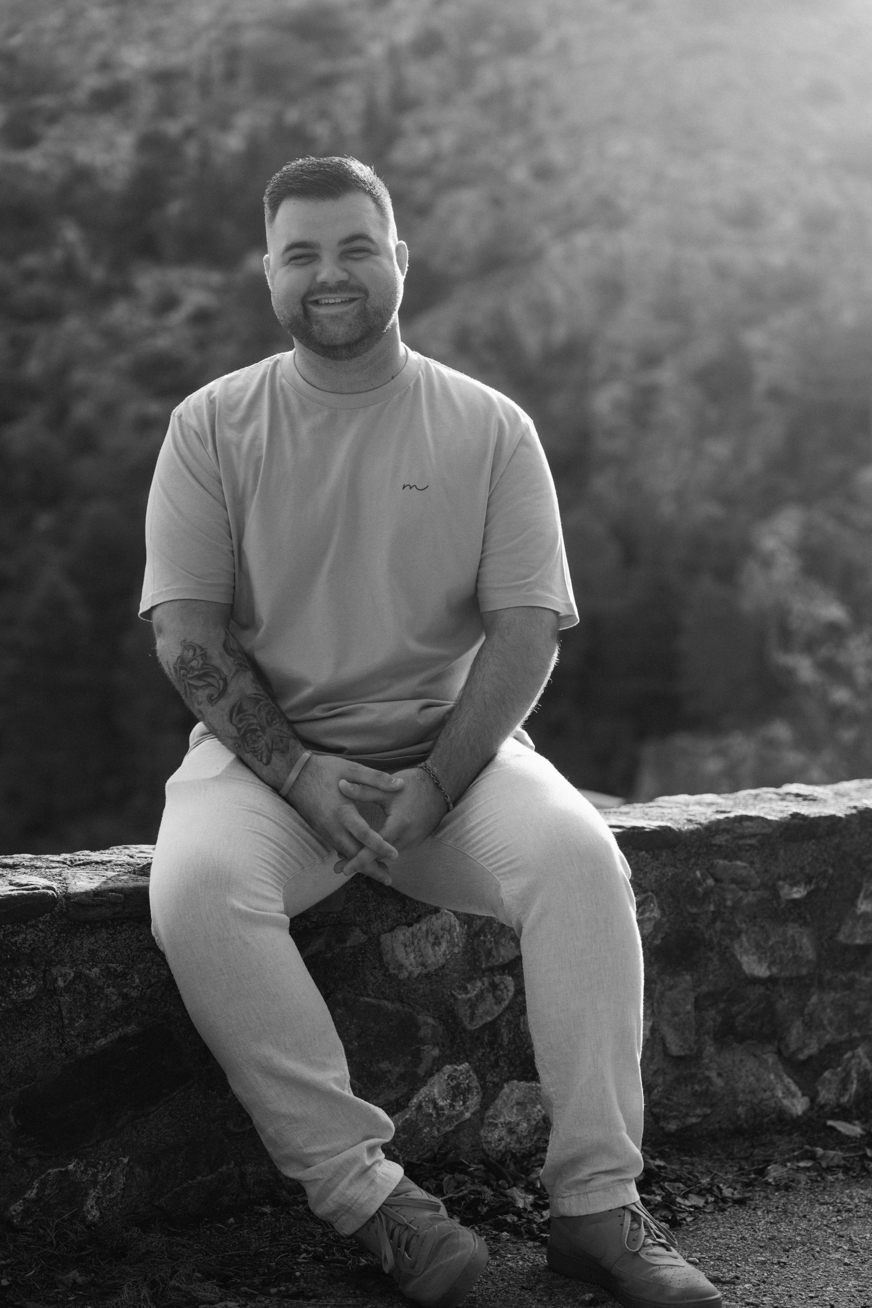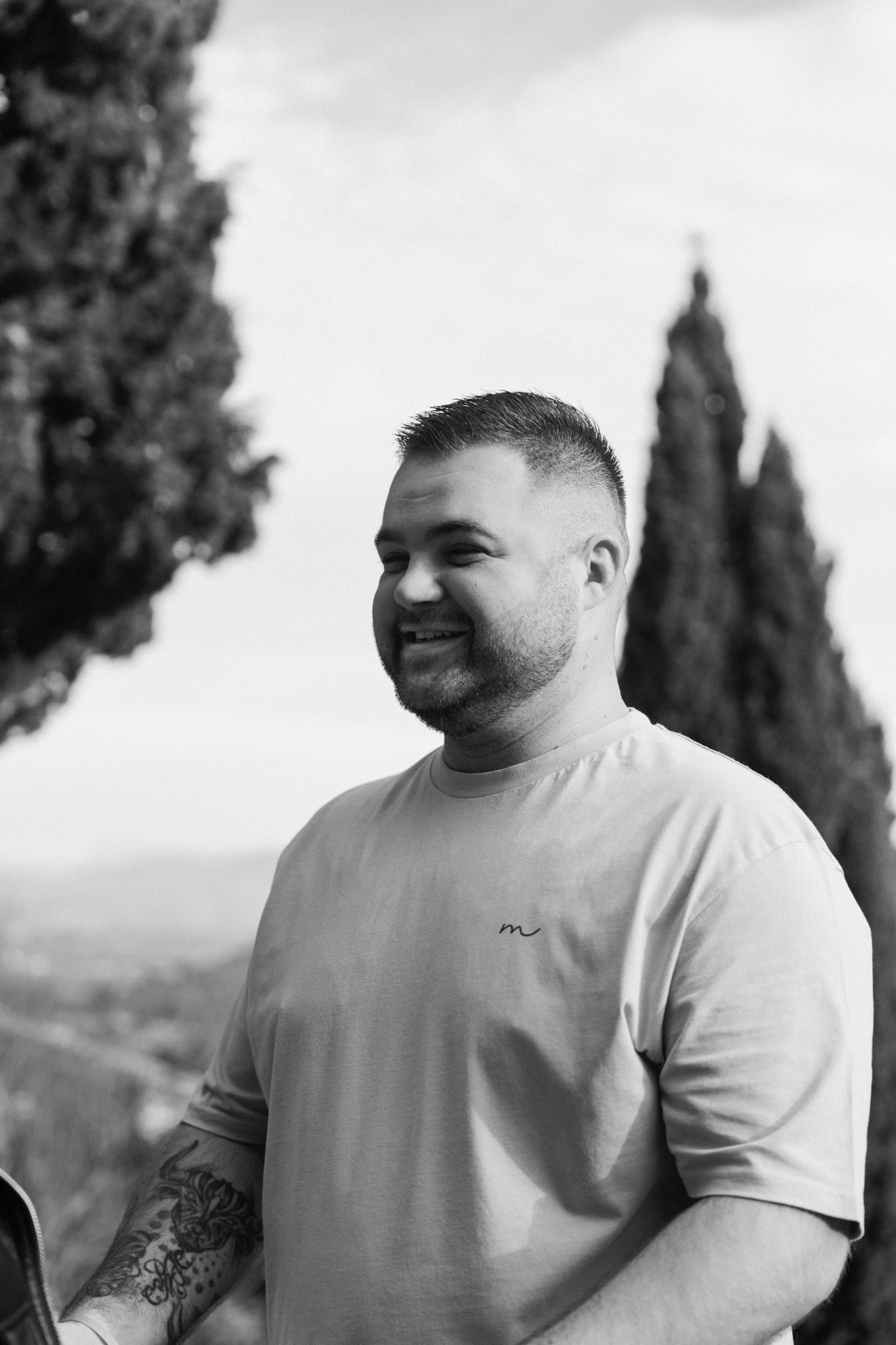 Second portrait en noir et blanc de Philippe, futur papa, affichant un sourire sincère lors de sa séance photo de grossesse à Castelnou (66), reflétant sa joie d'attendre bébé Léon.