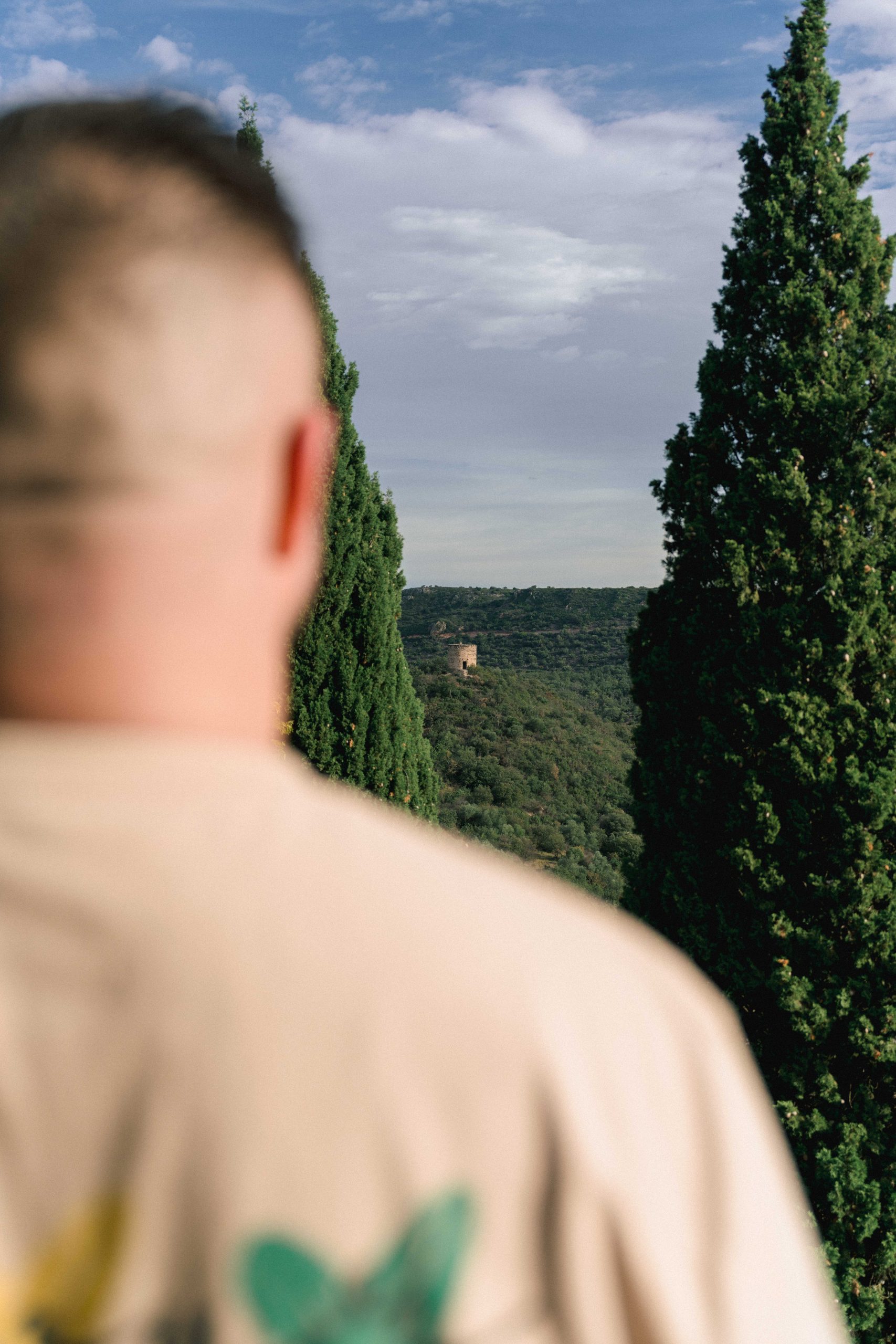 Plan large du paysage de Castelnou (66) avec une petite tour médiévale, vue par-dessus l'épaule de Philippe, offrant une perspective unique du village lors de la séance photo de grossesse.