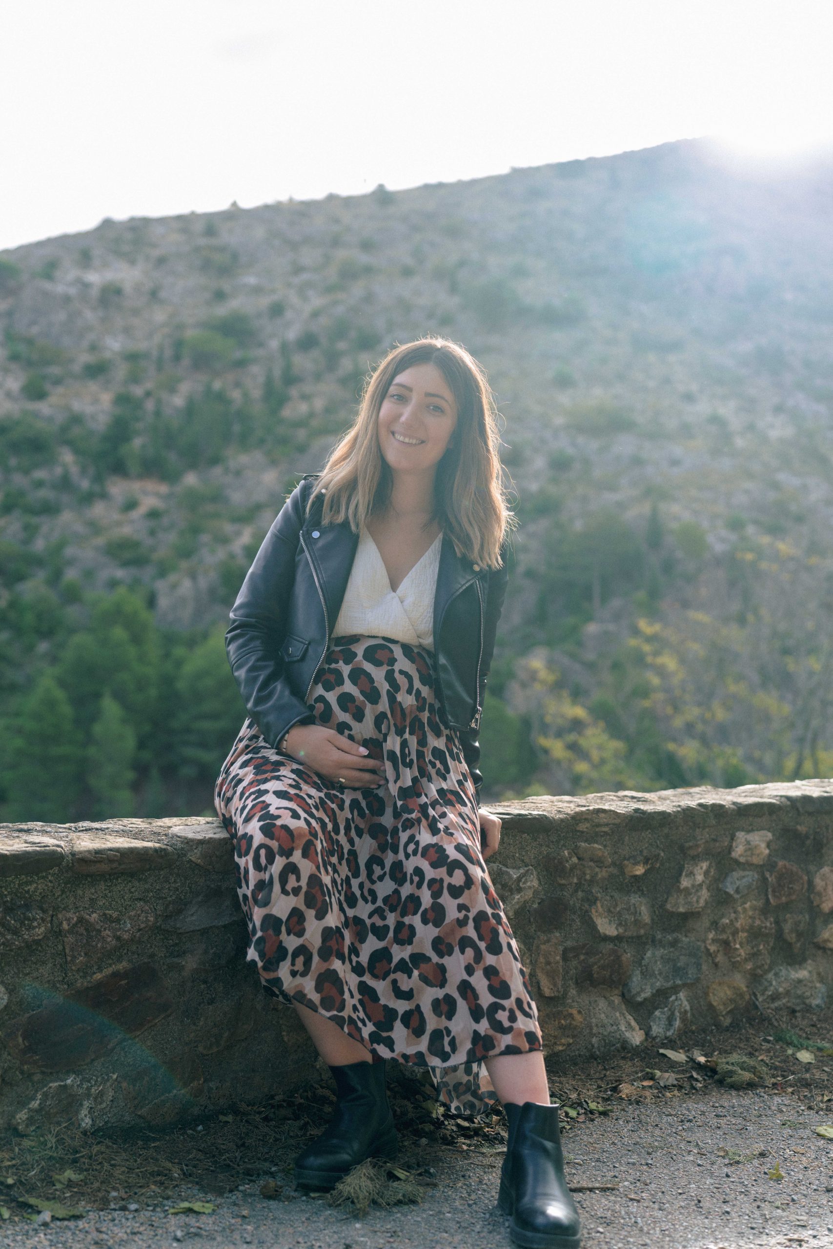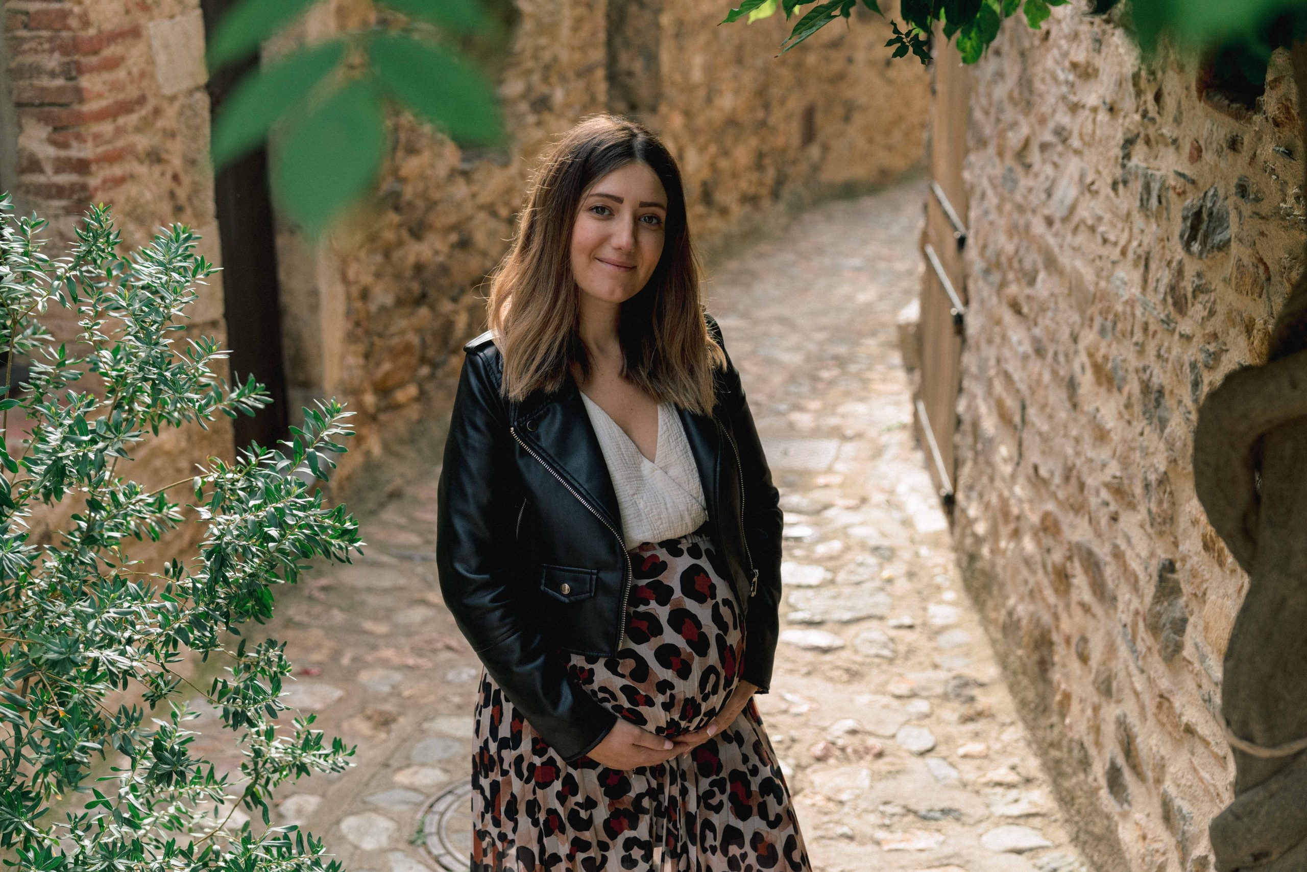 Portrait de Marie-Ève, future maman, tenant tendrement son ventre de grossesse, un geste qui symbolise la connexion avec son bébé, capturé à Castelnou (66).