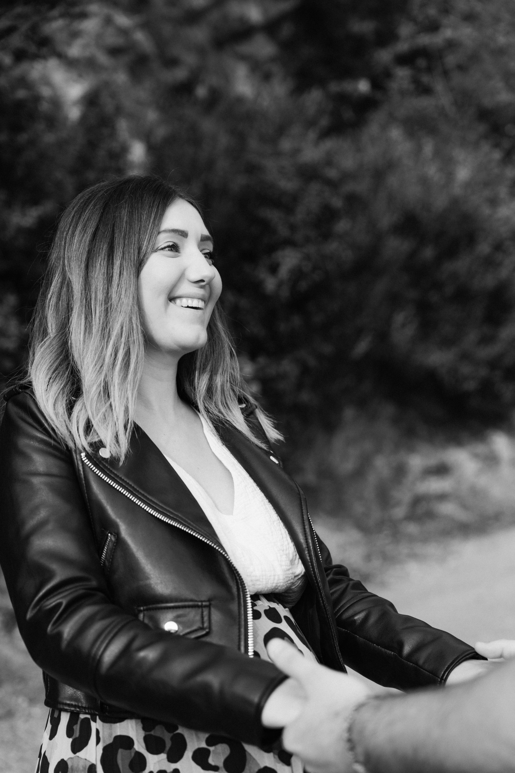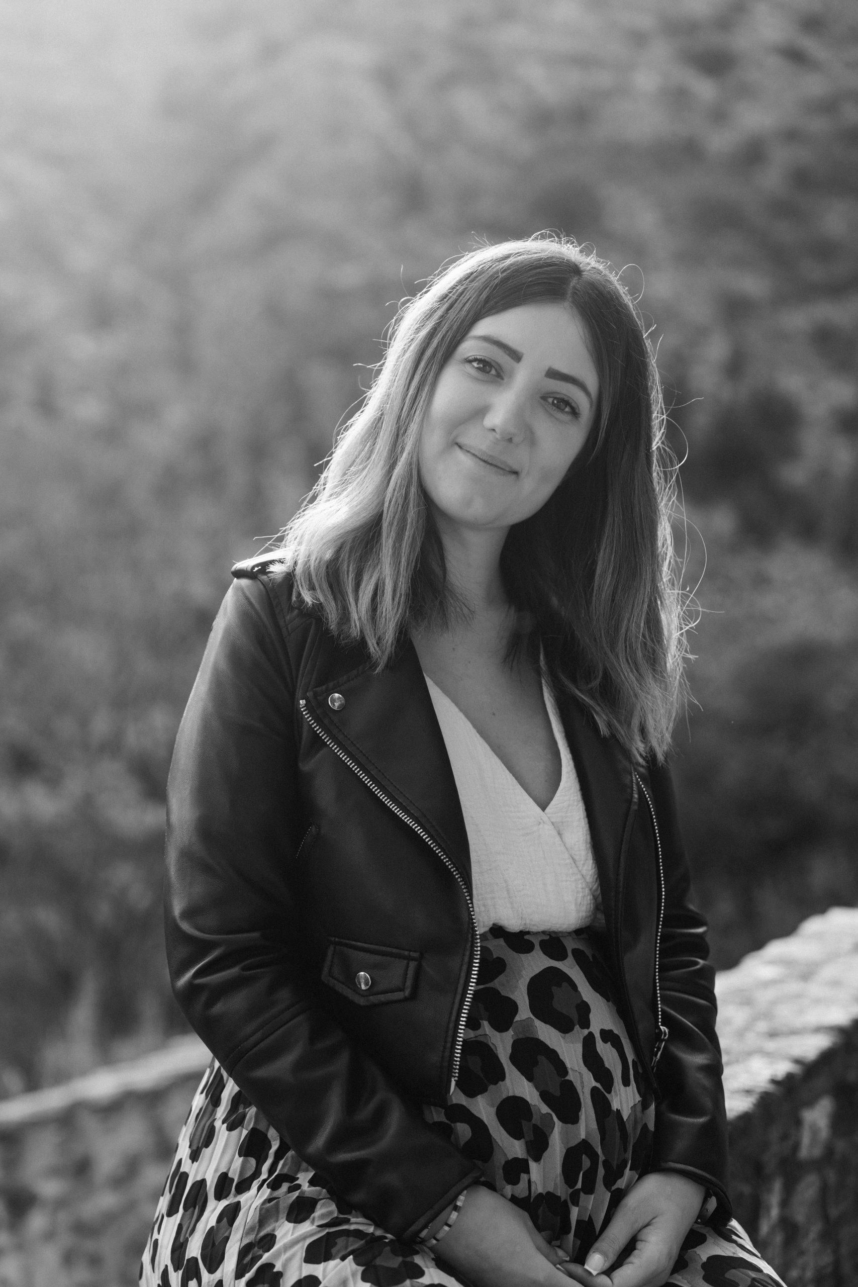 Portrait en noir et blanc de Marie-Ève, future maman, affichant un large sourire et la joie de sa grossesse, capturé à Castelnou (66).