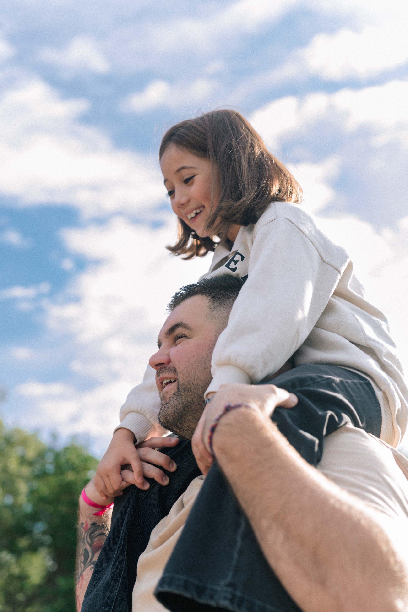 Philippe, futur papa, portant sa fille Louna sur ses épaules, un moment de jeu et de bonheur familial capturé lors de leur séance photo de grossesse à Castelnou (66).