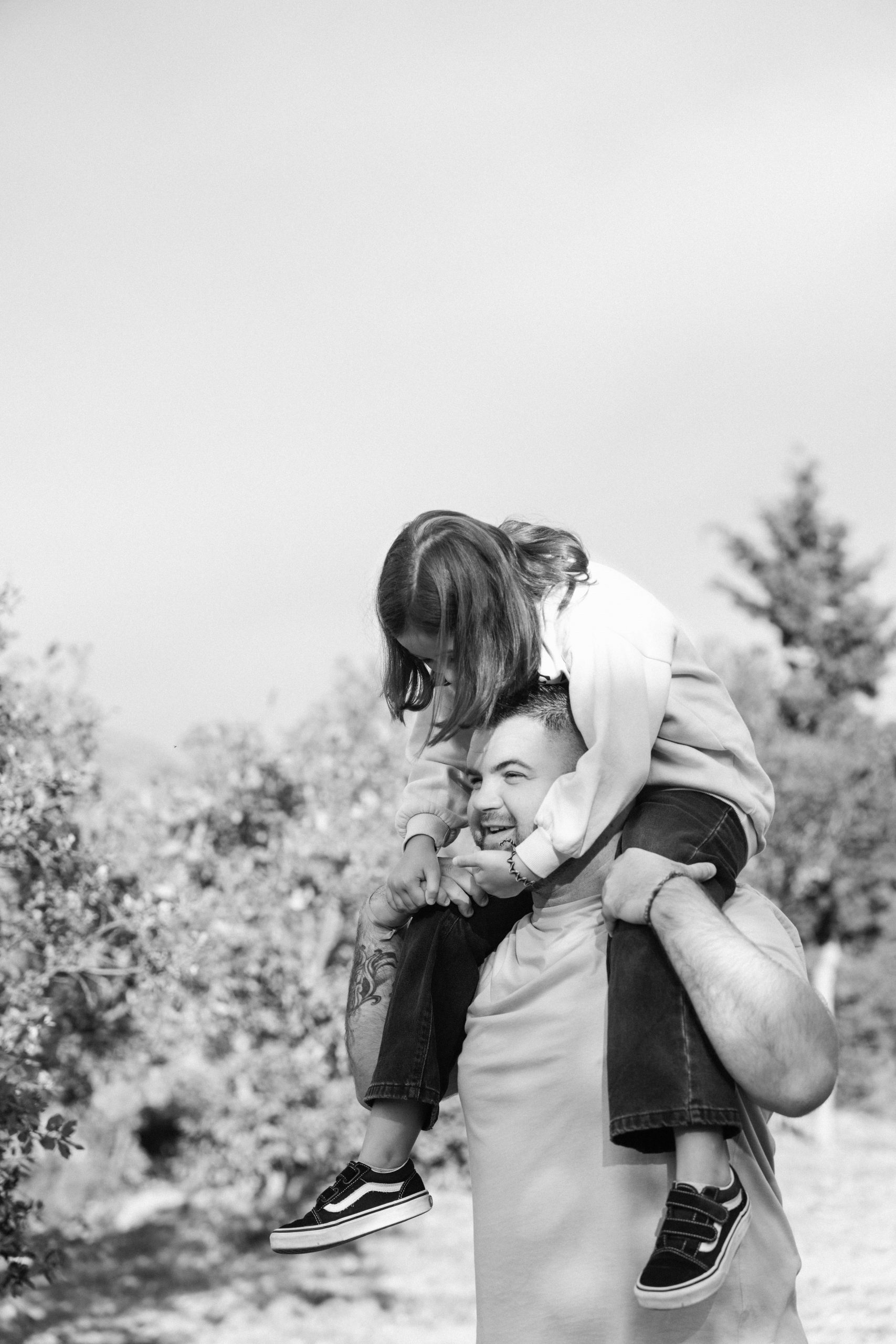 Philippe, futur papa, portant sa fille Louna sur ses épaules en noir et blanc, un moment de jeu et de bonheur familial capturé lors de leur séance photo de grossesse à Castelnou (66).