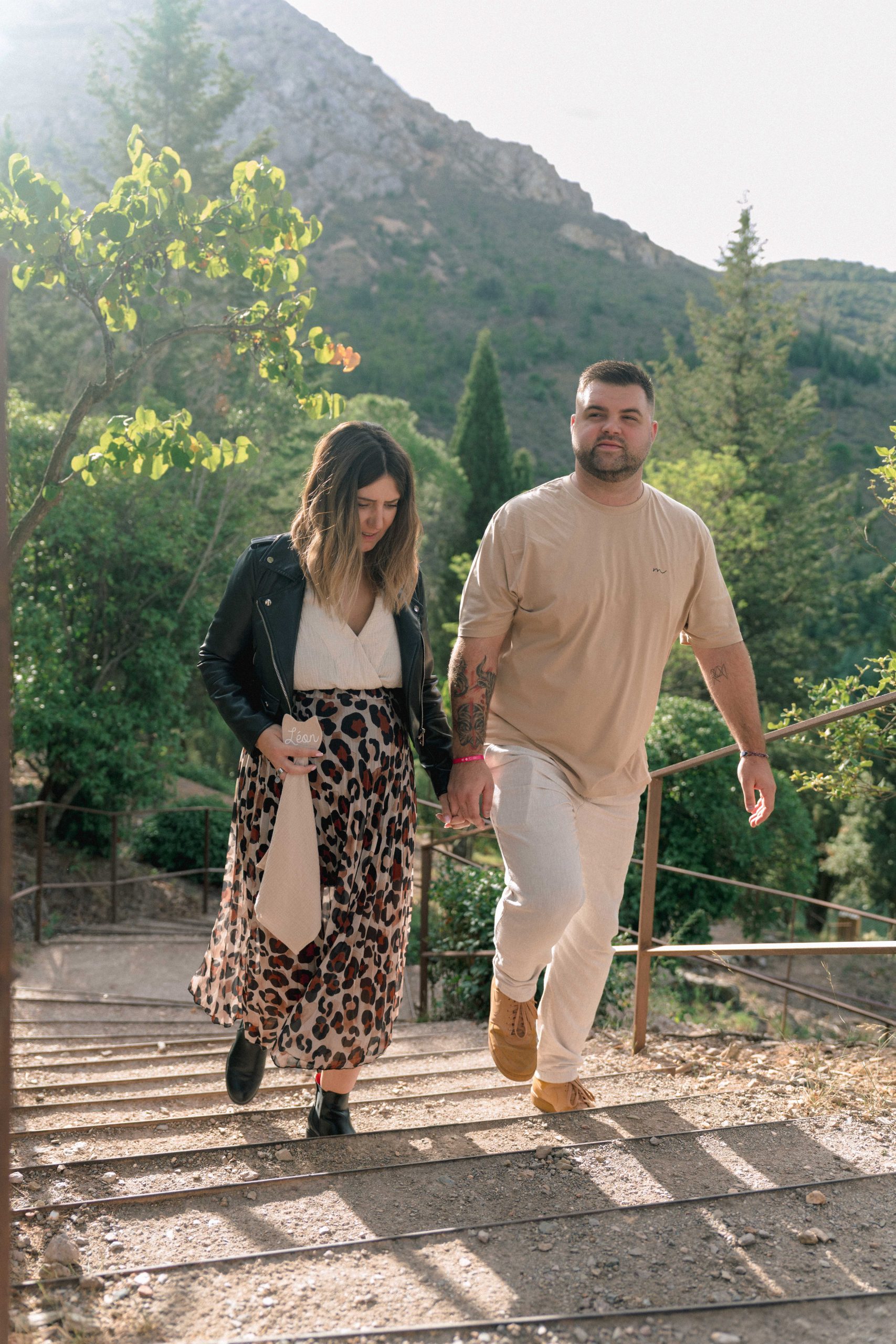 Marie-Ève et Philippe, futurs parents, avançant main dans la main dans une ruelle ensoleillée de Castelnou (66), symbolisant leur unité et le chemin qu'ils construisent pour leur famille.