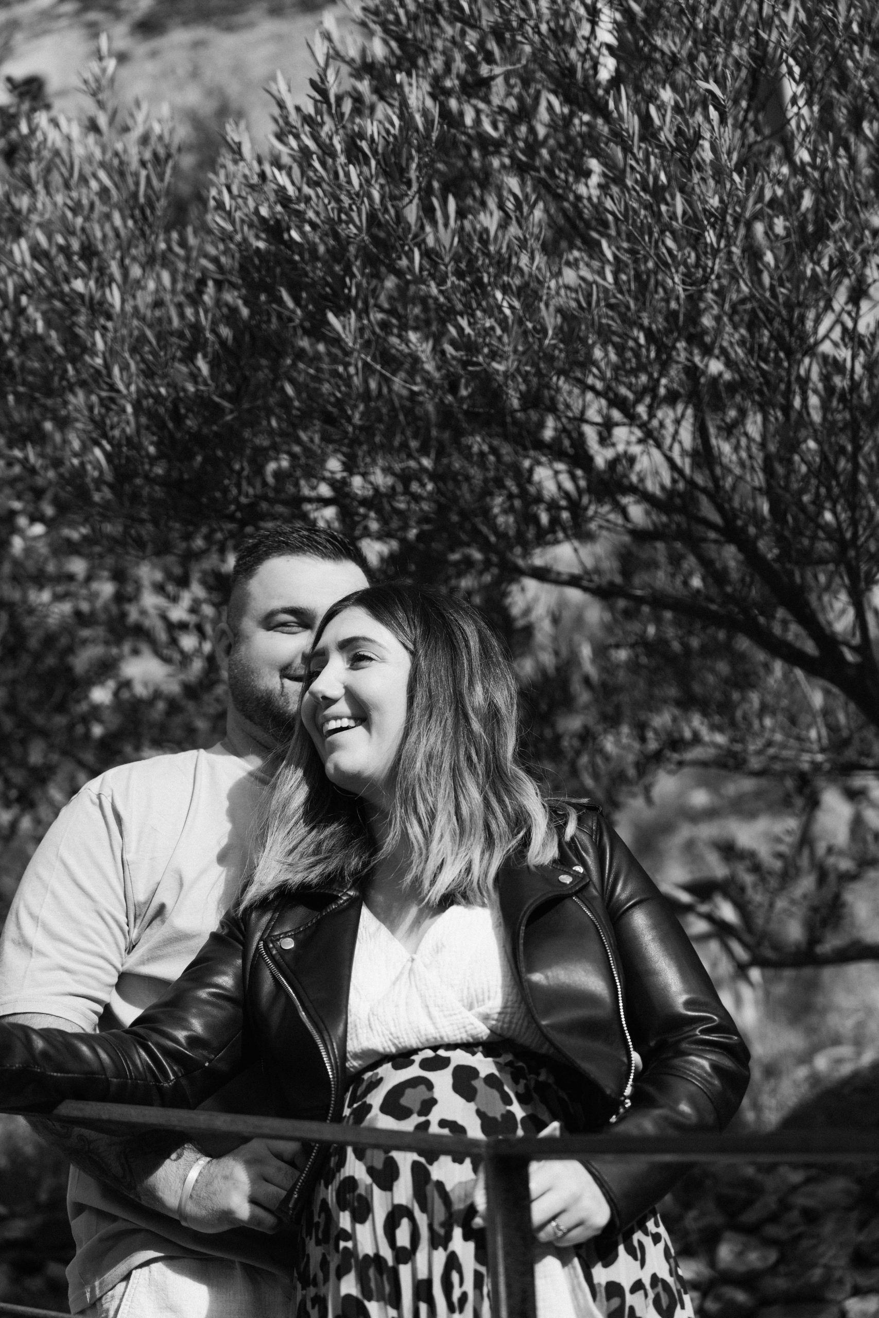 Marie-Ève et Philippe, futurs parents, regardant au loin depuis une vue en contrebas à Castelnou (66), Philippe chuchotant tendrement des mots d'amour à l'oreille de Marie-Ève en noir et blanc, un instant intime.
