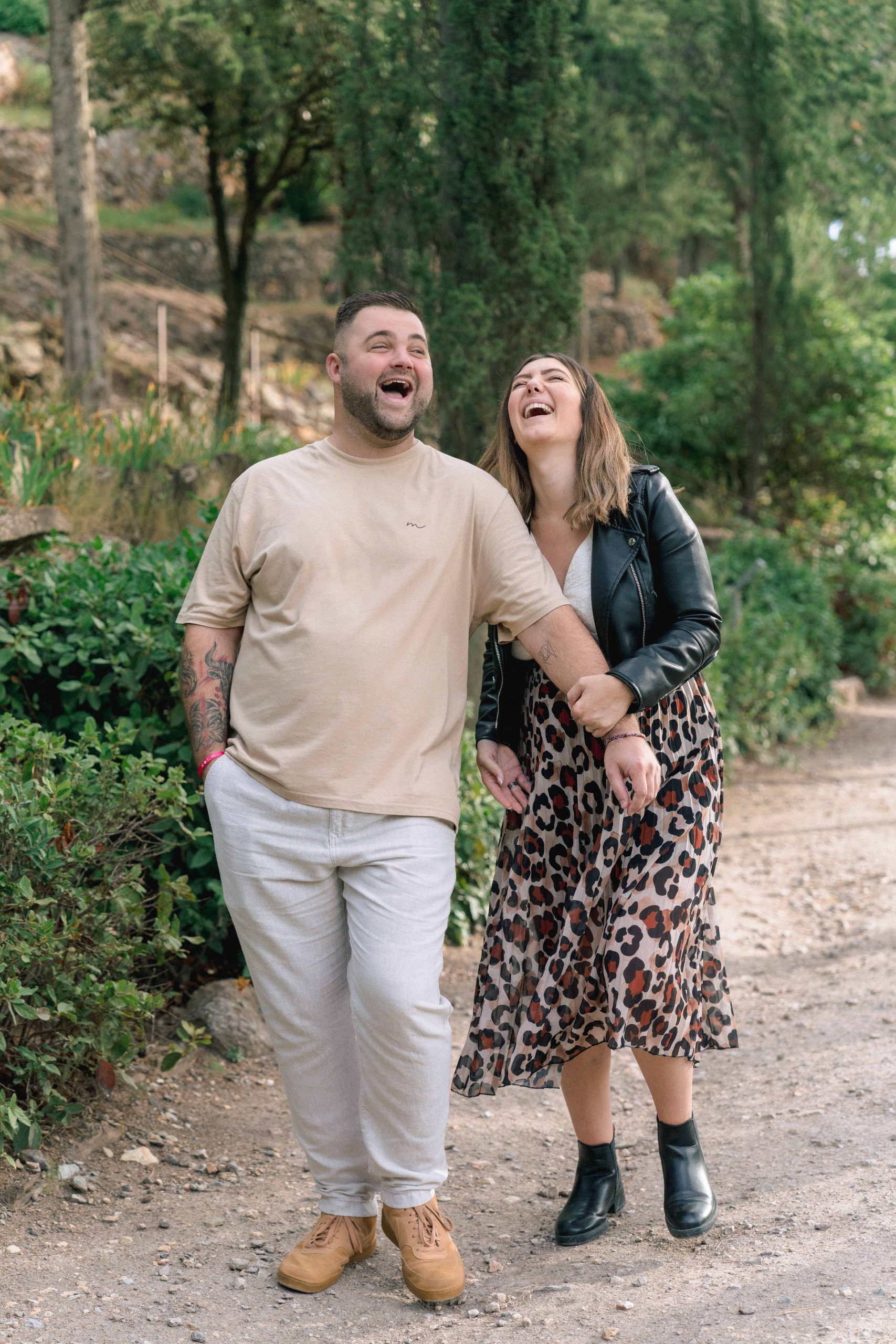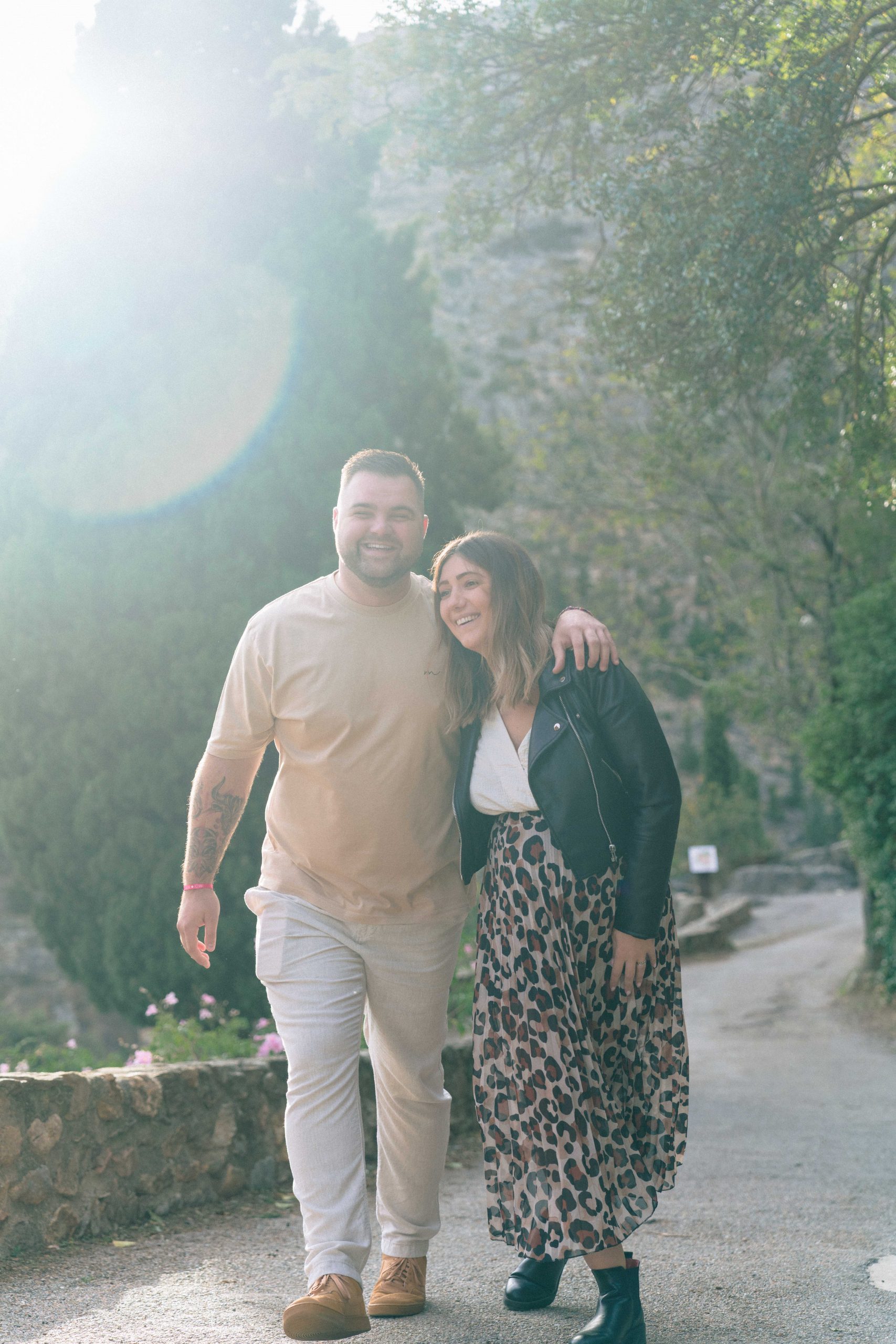 Marie-Ève et Philippe, futurs parents, marchant et riant ensemble dans les ruelles ensoleillées de Castelnou (66), un instant de bonheur pur capturé lors de leur séance photo de grossesse.