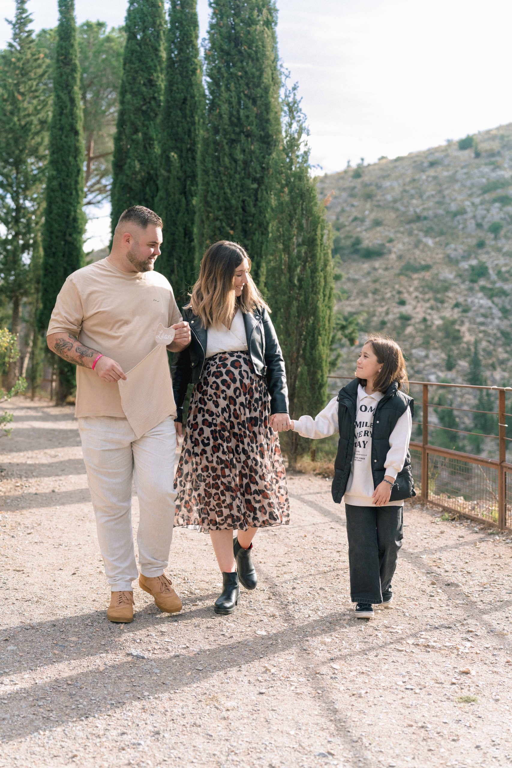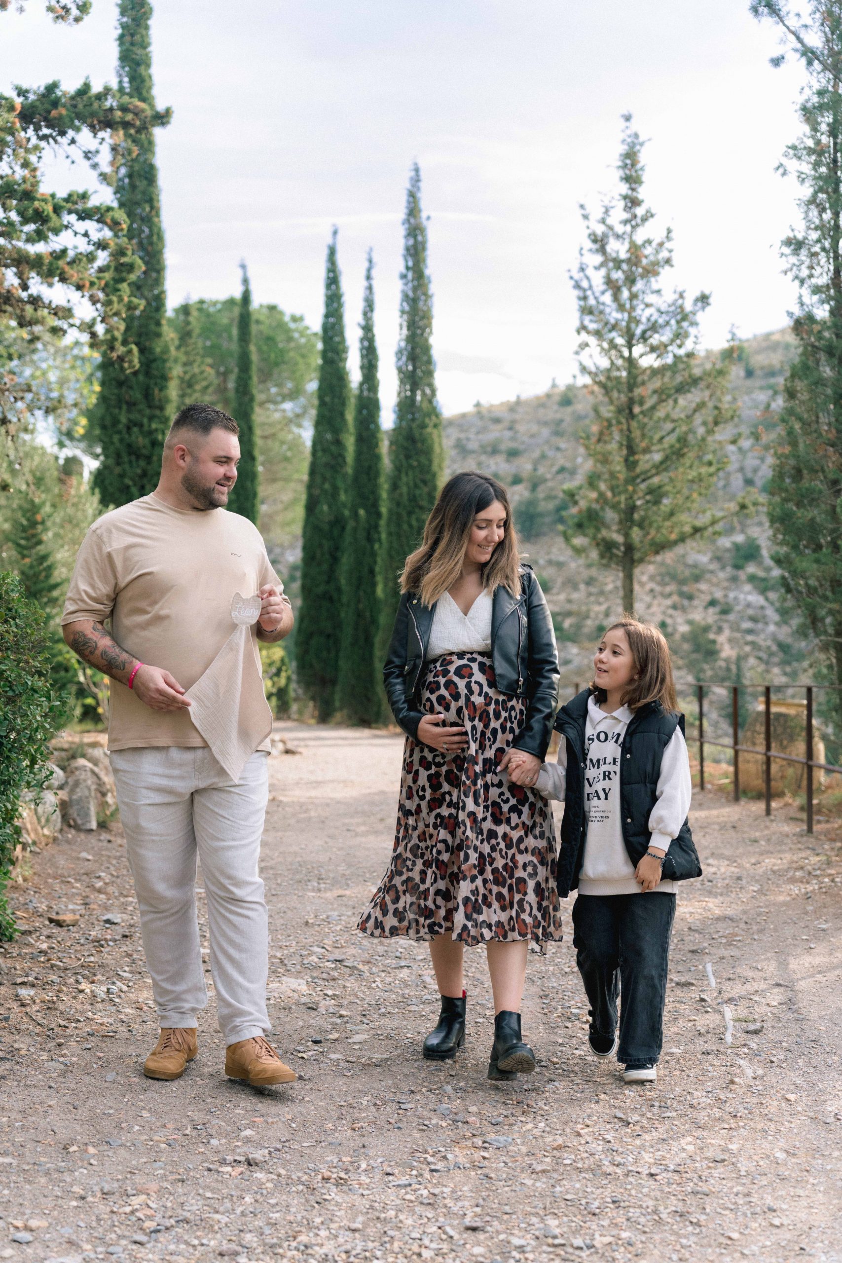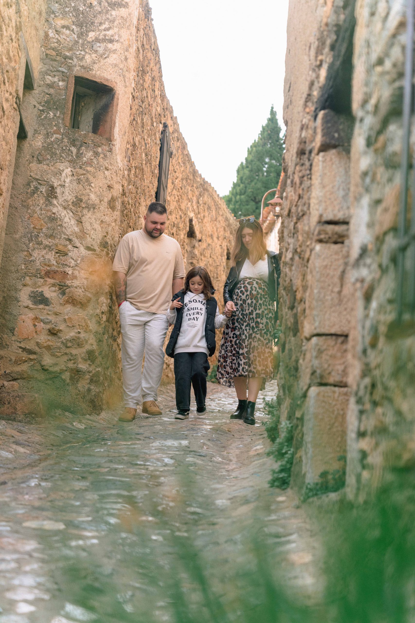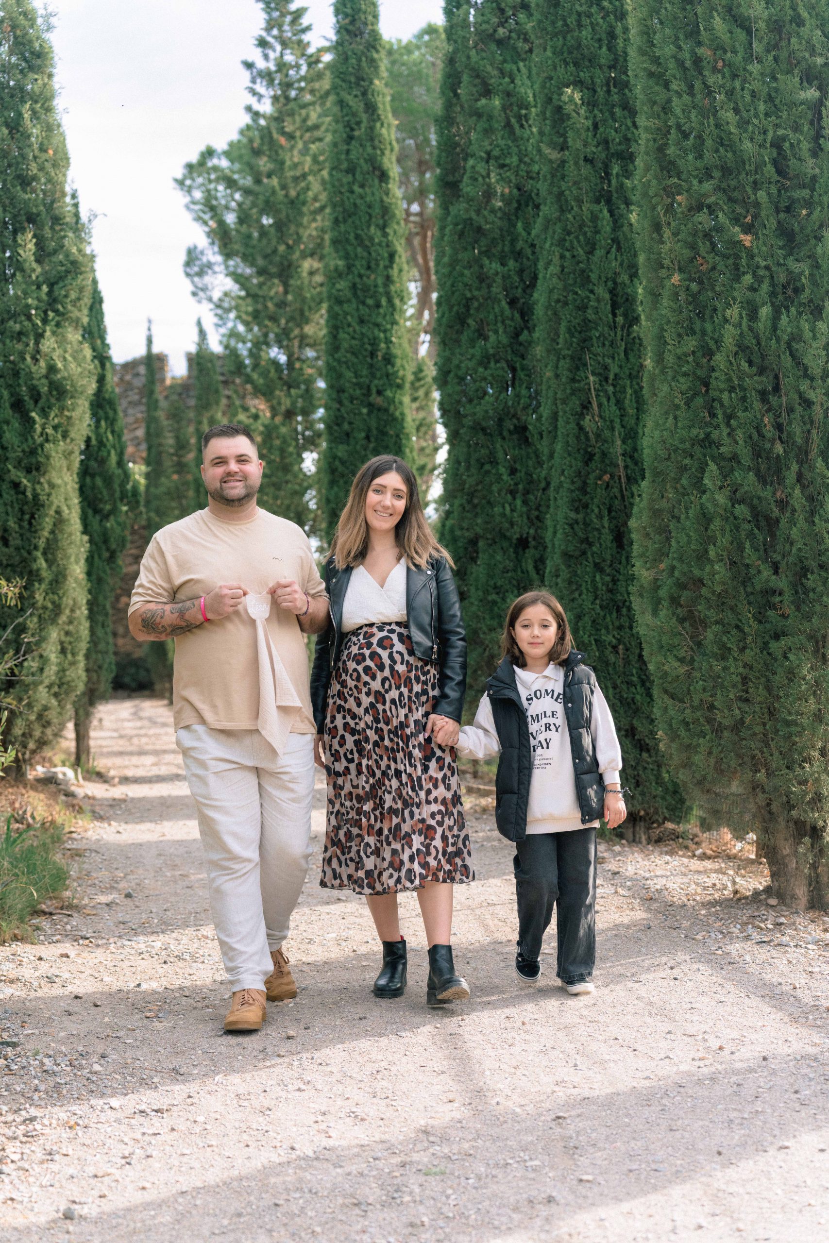 Marie-Ève, Philippe et Louna marchant dans une allée pittoresque de Castelnou (66), Philippe tenant un doudou, symbole de l'attente de leur futur bébé, Léon.