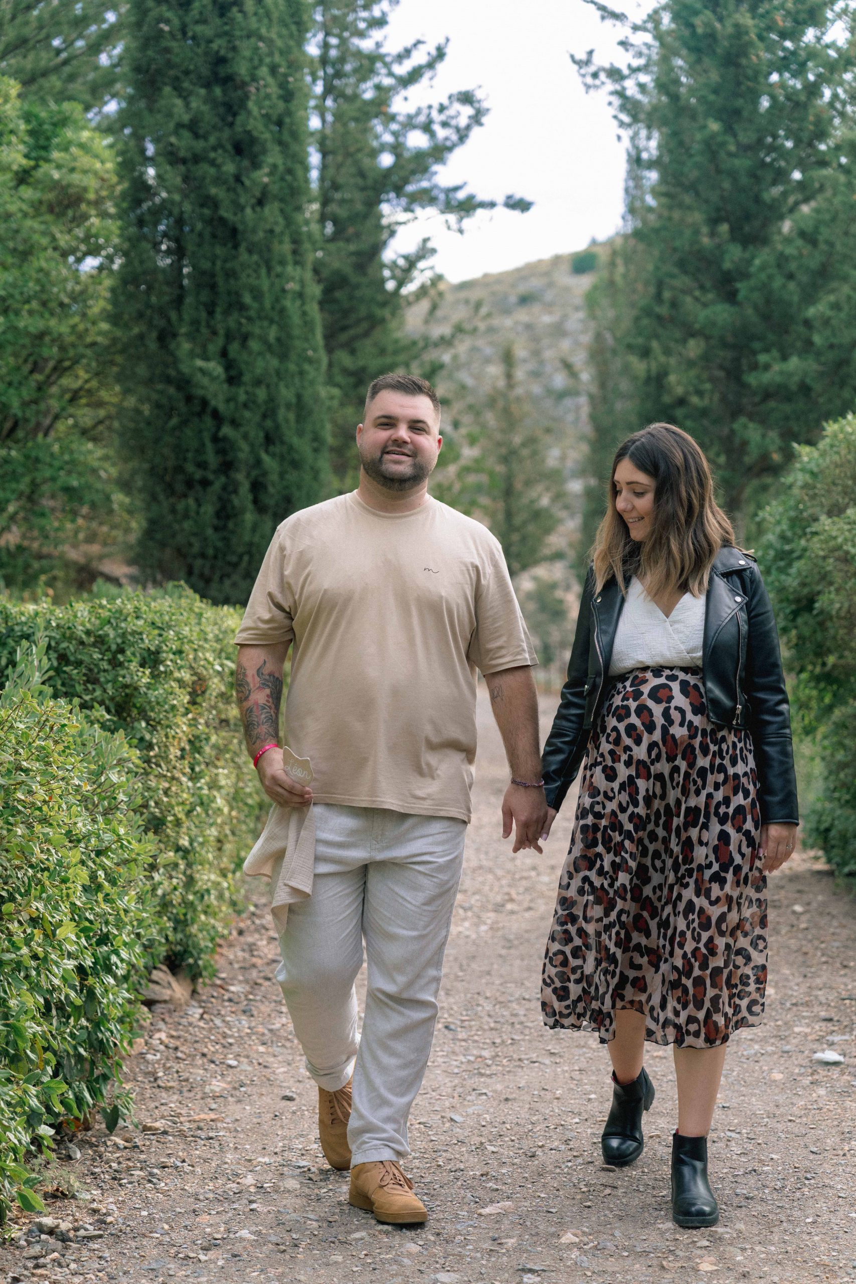 Marie-Ève et Philippe, main dans la main, se promenant dans les décors pittoresques de Castelnou (66) lors de leur séance photo de grossesse, capturant leur lien en mouvement.