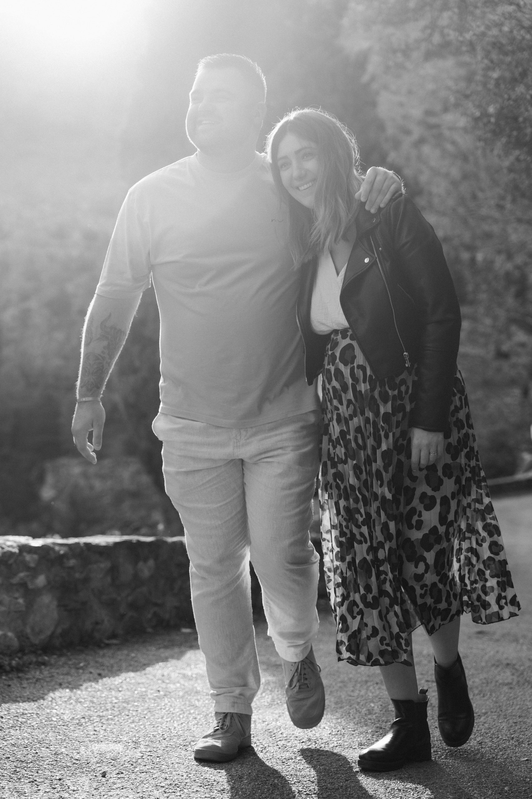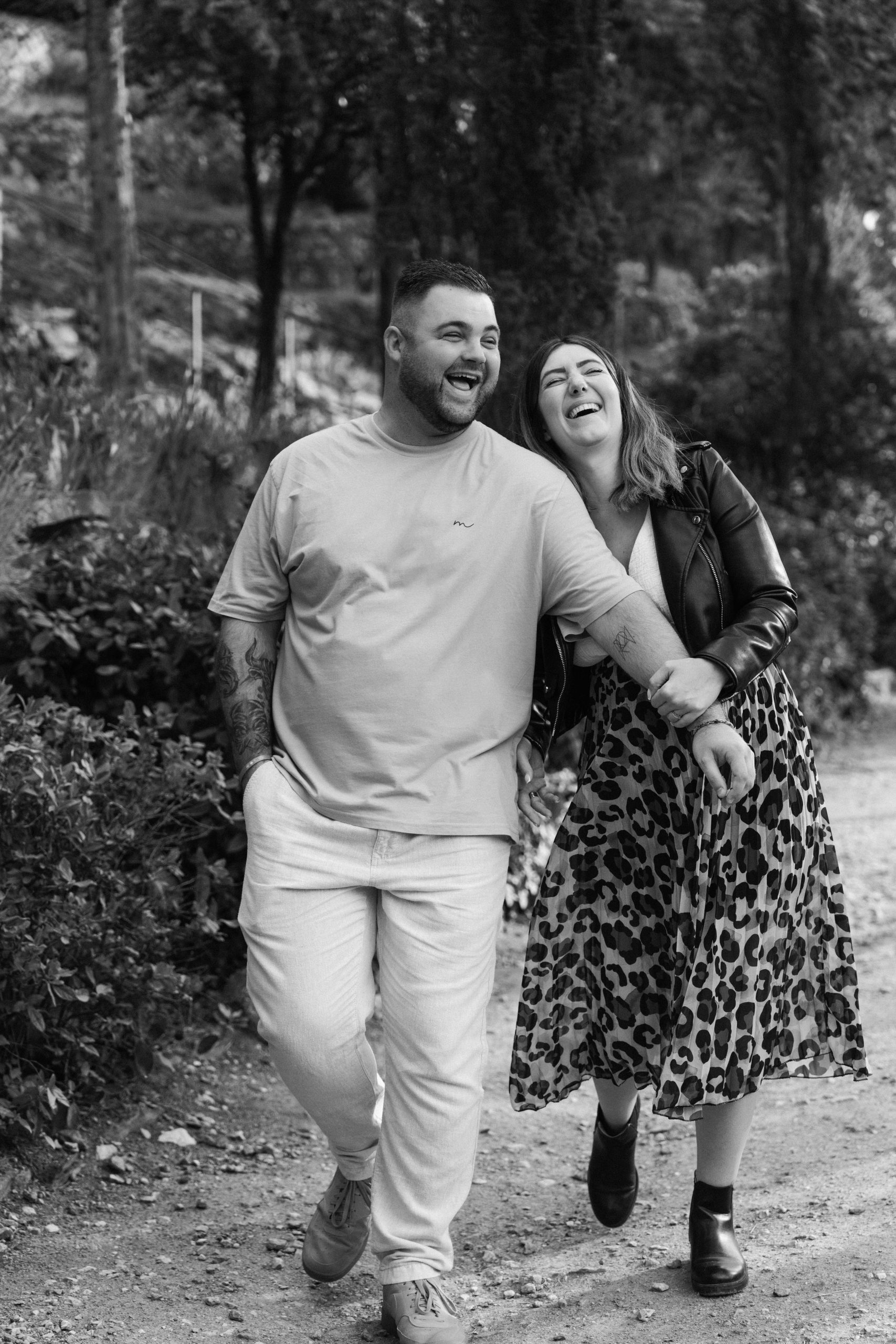 Marie-Ève et Philippe, futurs parents, marchant et riant ensemble en noir et blanc dans les ruelles de Castelnou (66), un instant intemporel de bonheur pur capturé lors de leur séance photo de grossesse.