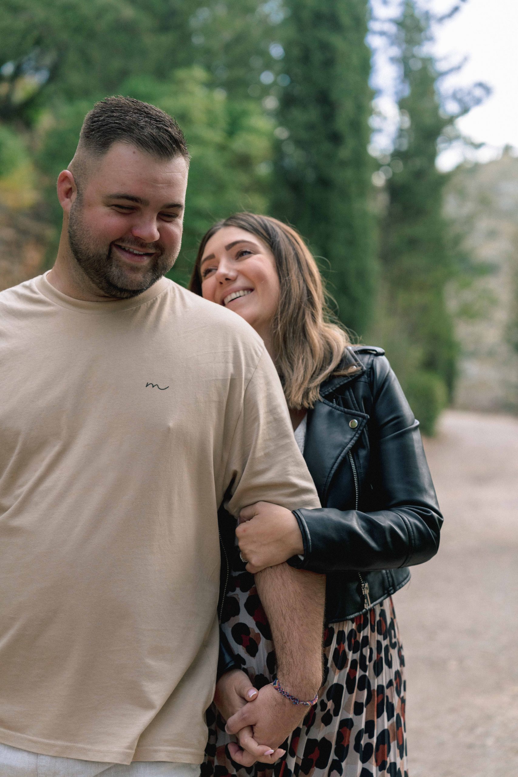 Marie-Ève et Philippe, futurs parents, marchant et riant ensemble dans le charmant village de Castelnou (66), capturant leur complicité et leur joie lors de leur séance photo de grossesse.