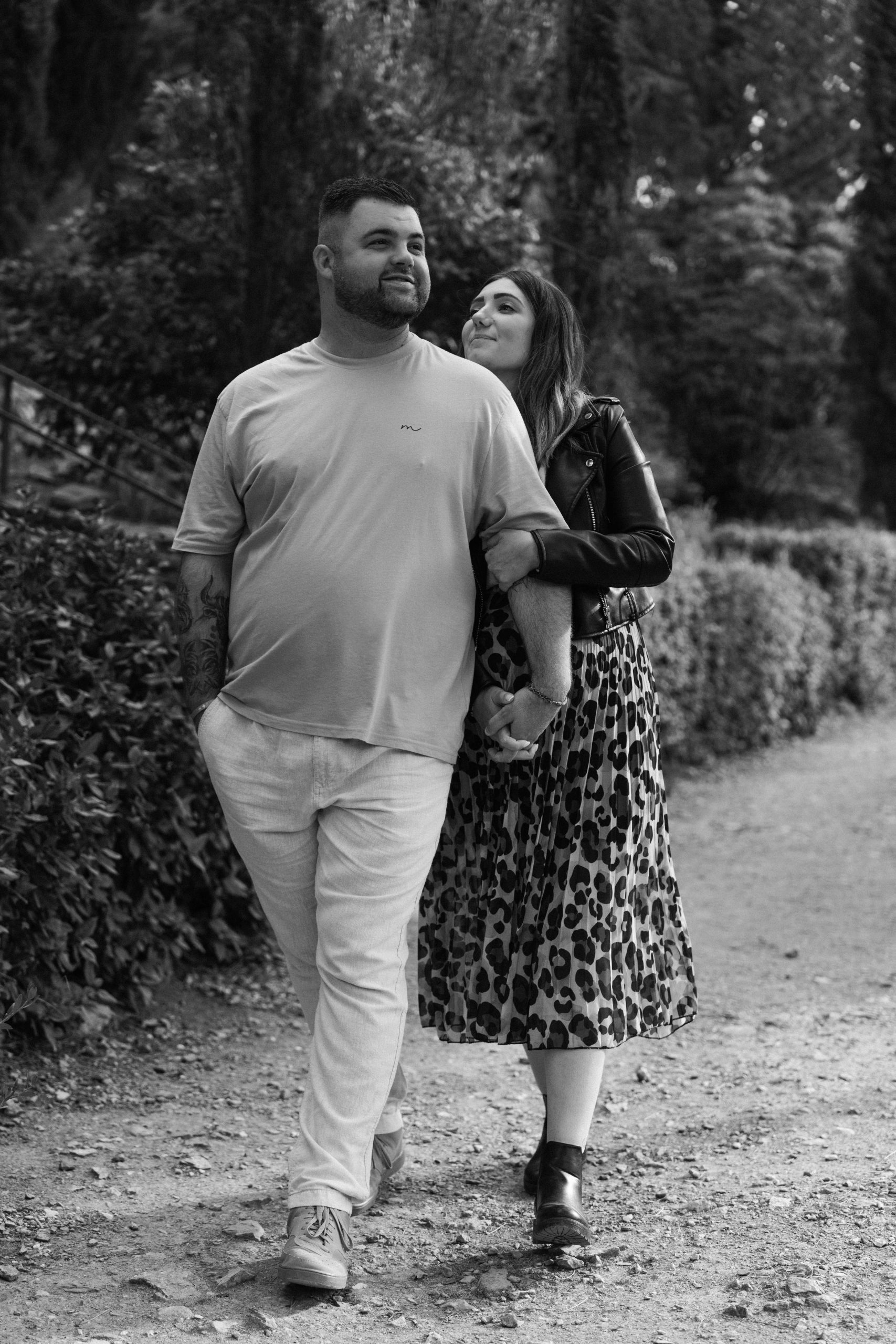 Marie-Ève et Philippe, futurs parents, avançant main dans la main dans une ruelle de Castelnou (66) en noir et blanc, symbolisant leur chemin commun vers l'arrivée de leur bébé avec une élégance intemporelle.