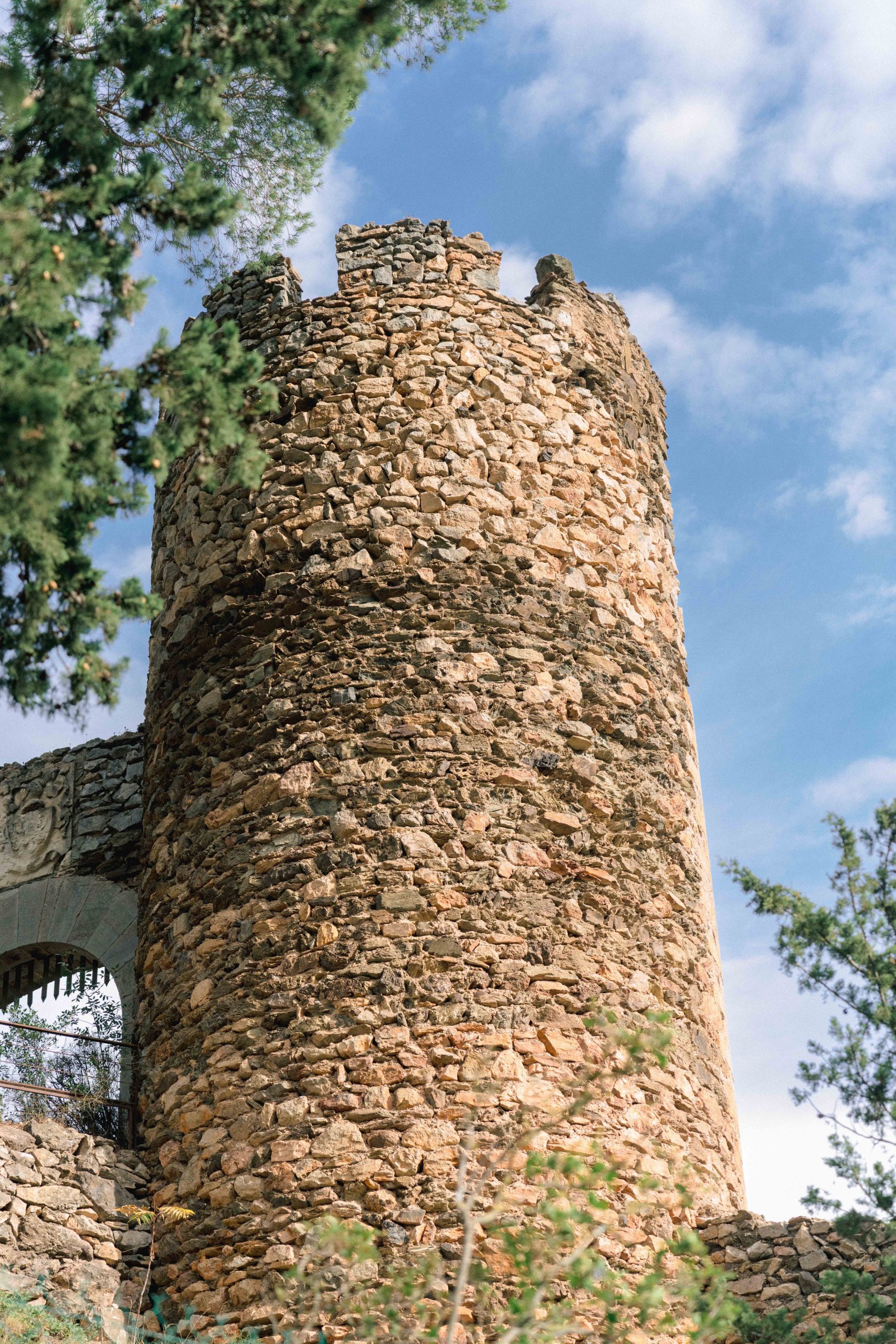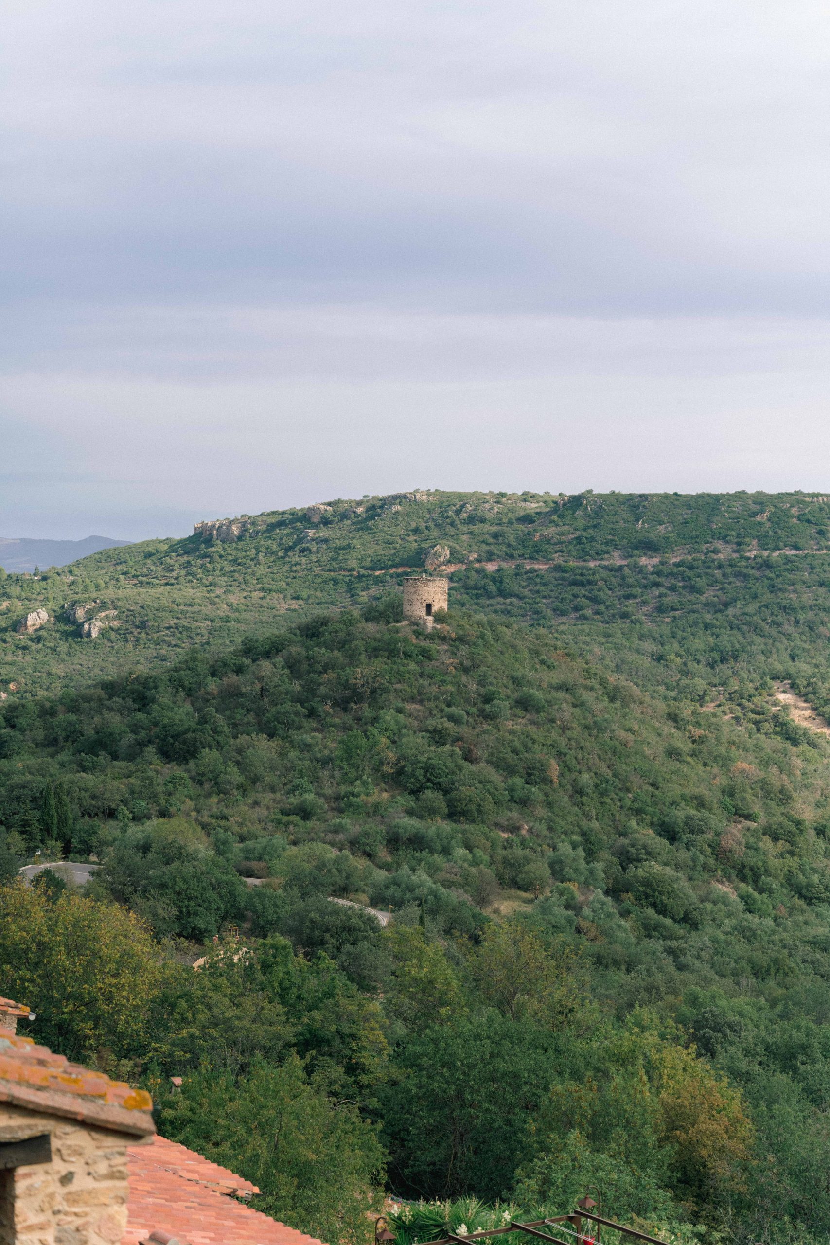 Vue d'une tour emblématique dans le paysage de Castelnou (66), un élément caractéristique du village, capturé lors de la séance photo de grossesse de Marie-Ève et Philippe.
