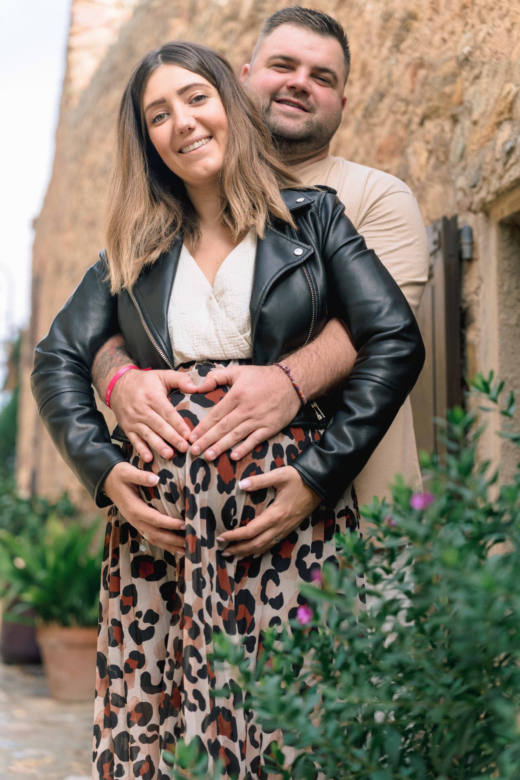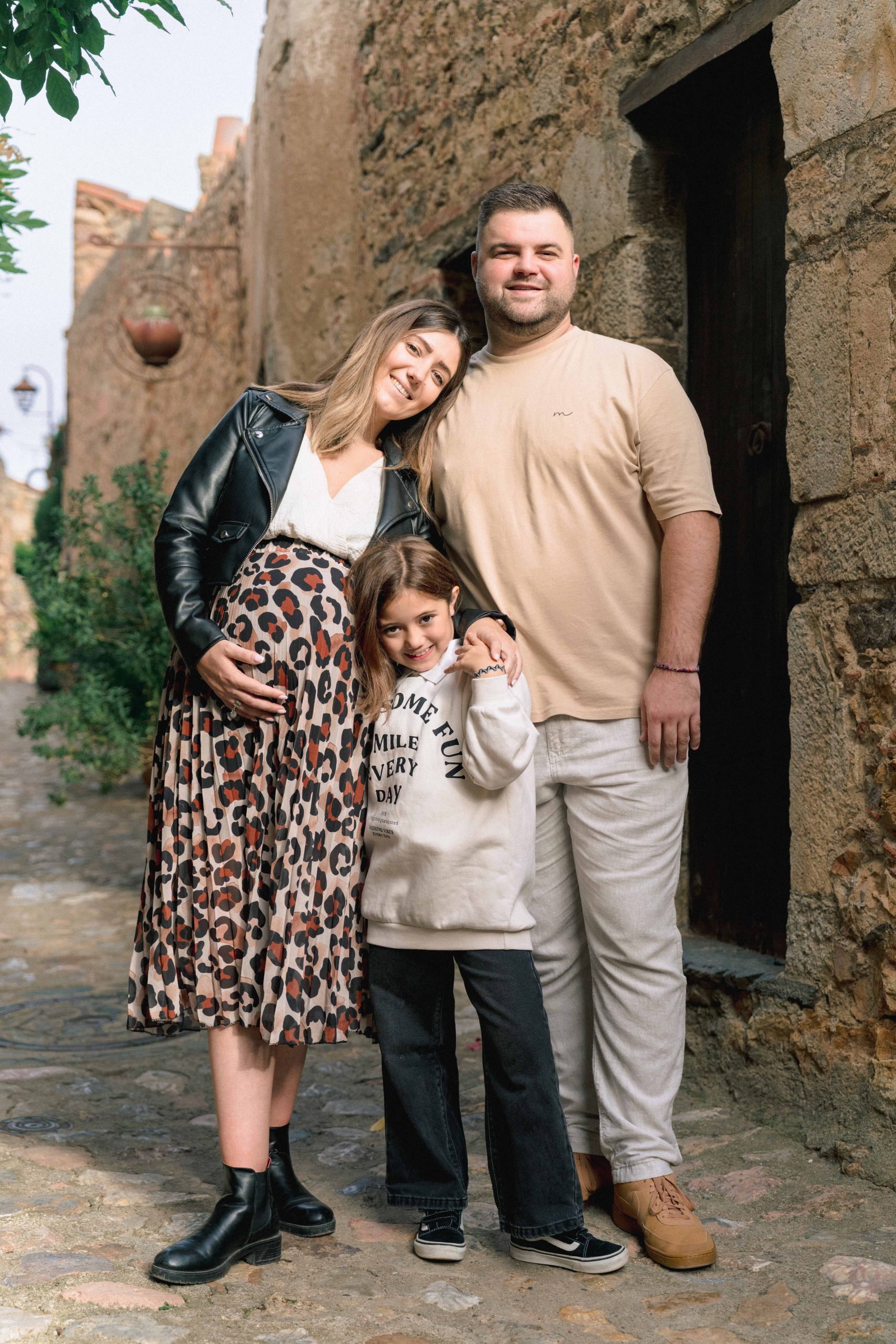 Famille de Marie-Ève, Philippe et Louna en promenade dans une ruelle de Castelnou (66), Philippe tenant le doudou de leur futur bébé, symbolisant l'union et l'attente joyeuse.