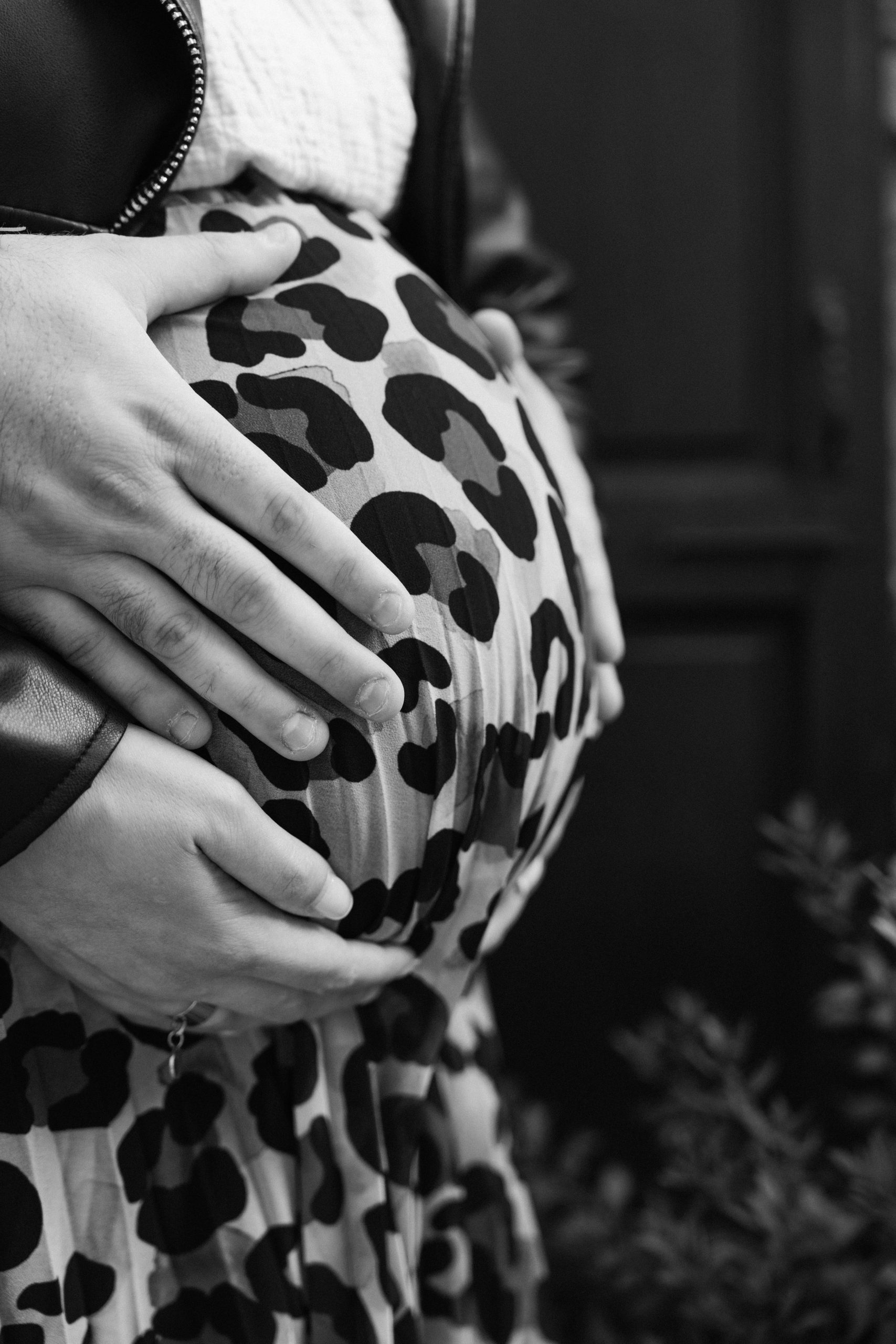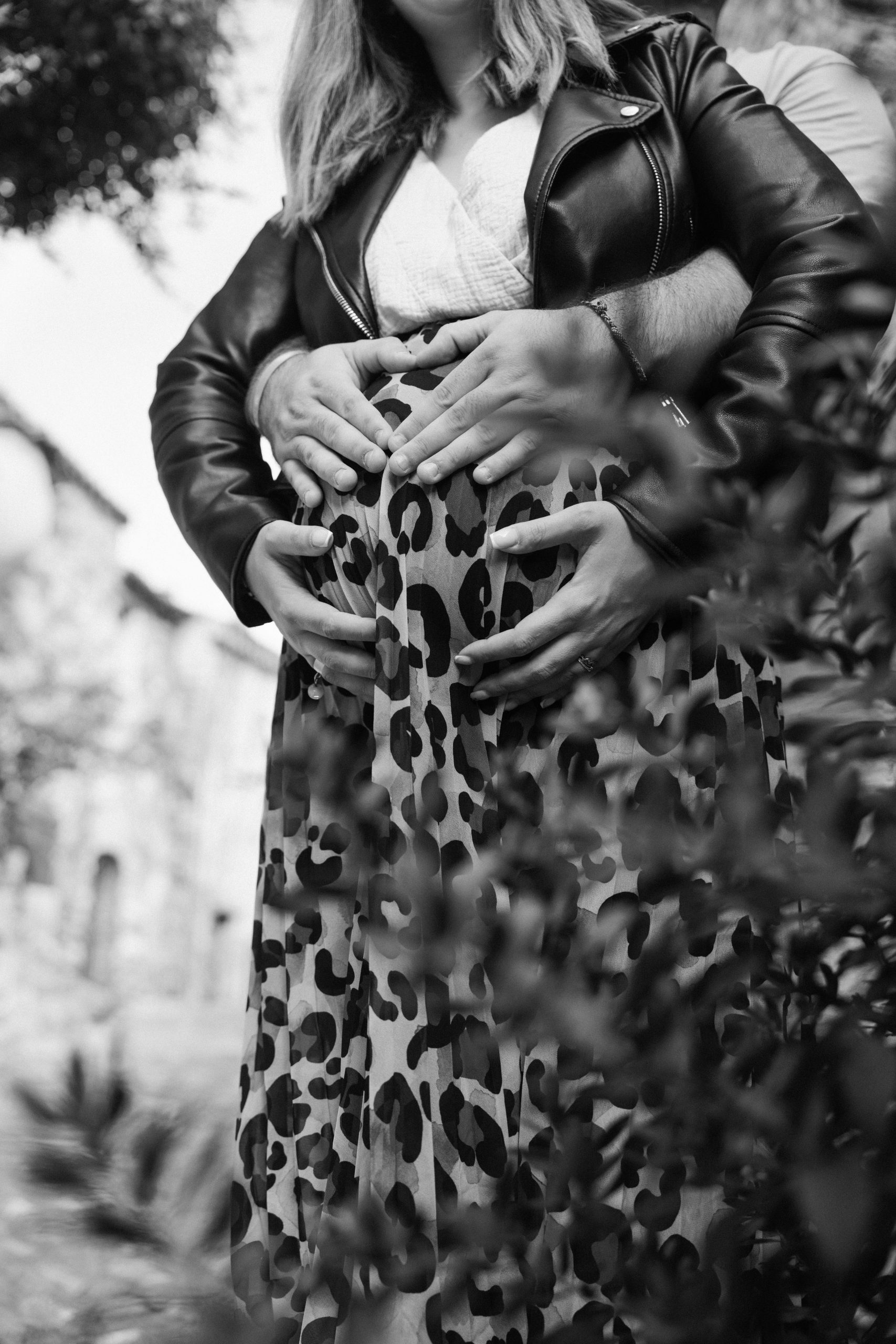 Philippe, futur papa, en noir et blanc, se tenant derrière Marie-Ève et posant tendrement les mains sur son ventre de grossesse, un geste de soutien et d'amour capturé à Castelnou (66).
