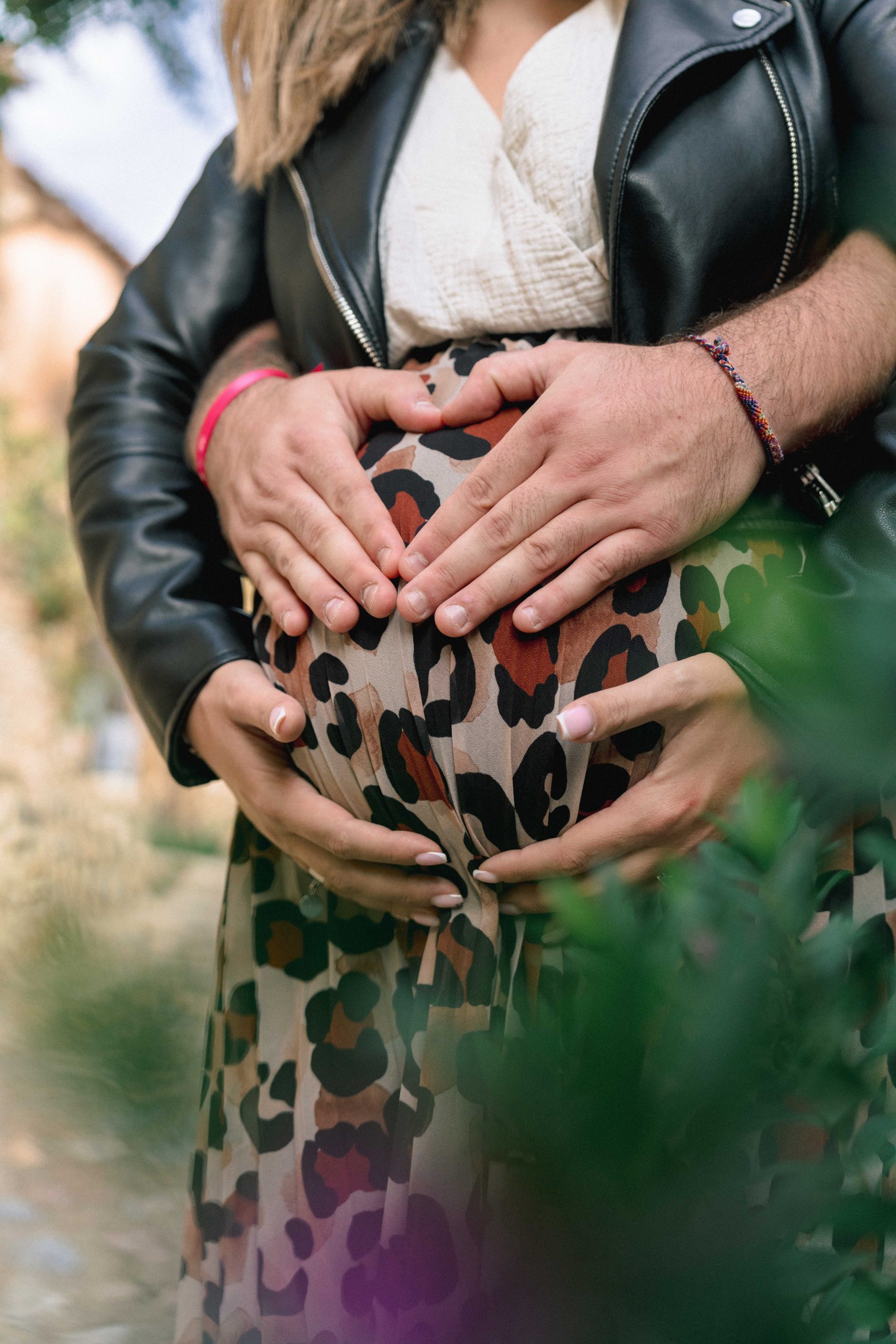 Gros plan des mains de Philippe, futur papa, formant un cœur sur le ventre de Marie-Ève, un geste d'amour et de protection pour leur bébé, capturé à Castelnou (66).