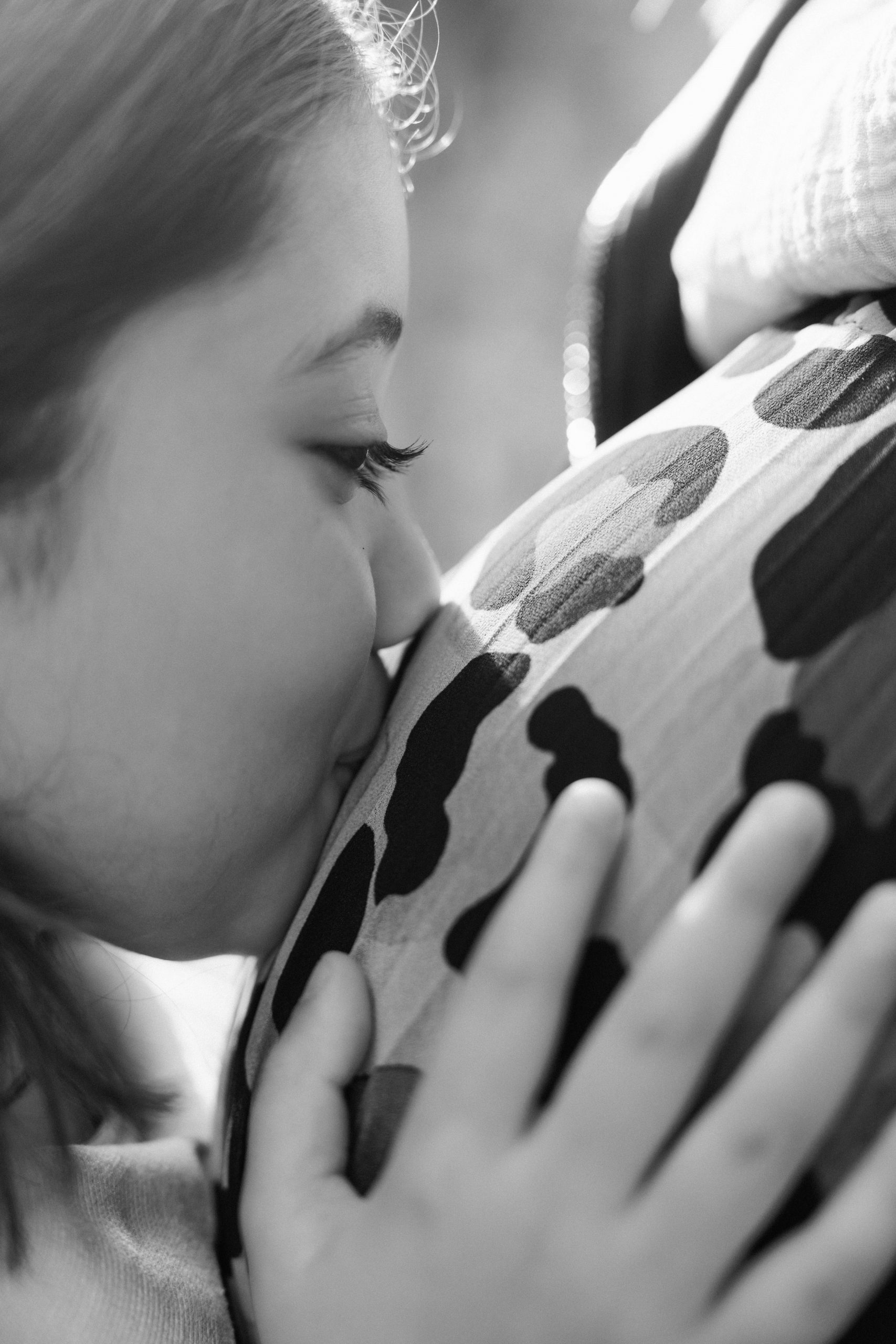 Gros plan en noir et blanc de Louna embrassant tendrement le ventre de sa mère Marie-Ève à Castelnou (66), un moment d'anticipation et de connexion fraternelle.