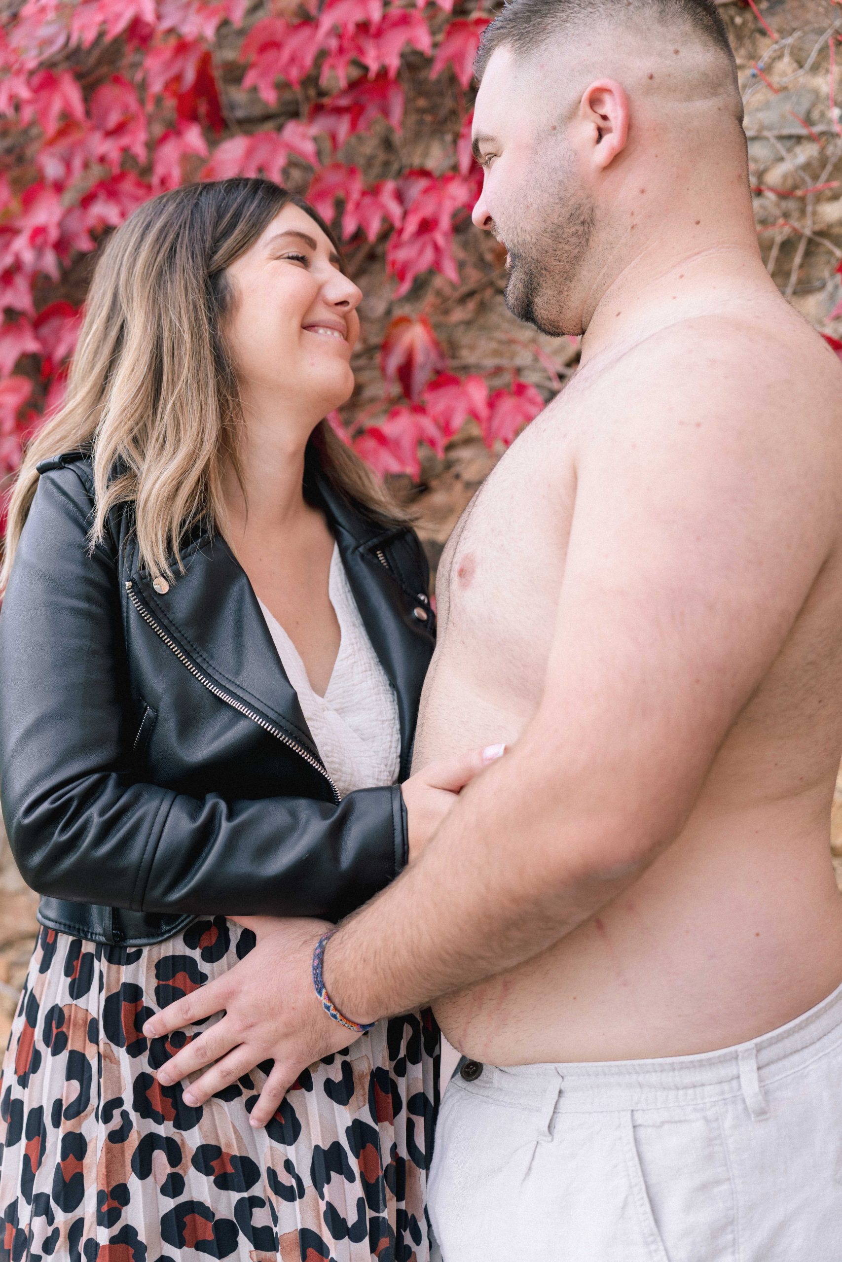 Philippe, torse nu, posant tendrement à côté de Marie-Ève lors de leur séance photo de grossesse à Castelnou (66), illustrant la complicité et l'intimité du couple.