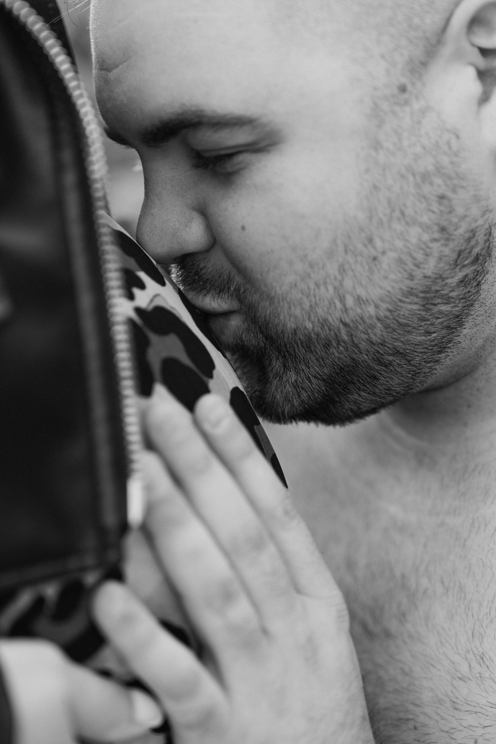 Portrait en noir et blanc de Philippe, futur papa, capturé lors de sa séance photo de grossesse à Castelnou (66), reflétant sa sérénité et son anticipation.