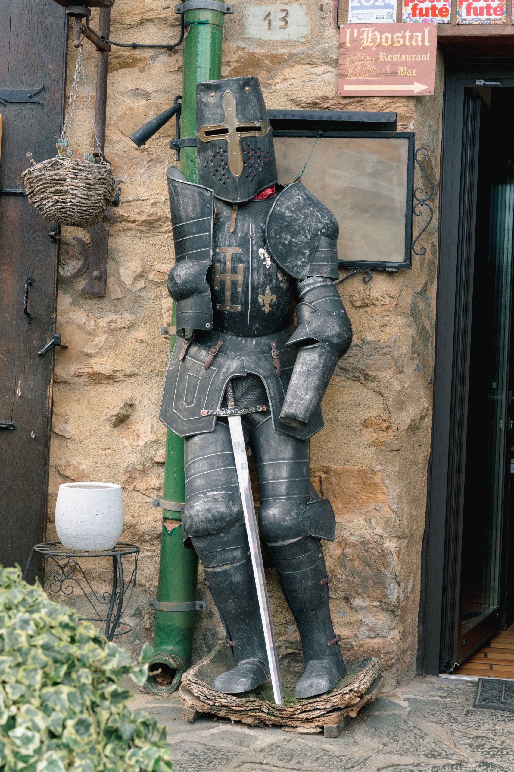 Armure de chevalier médiévale à Castelnou (66), un symbole de l'histoire du village, capturée lors de la séance photo de grossesse de Marie-Ève et Philippe.