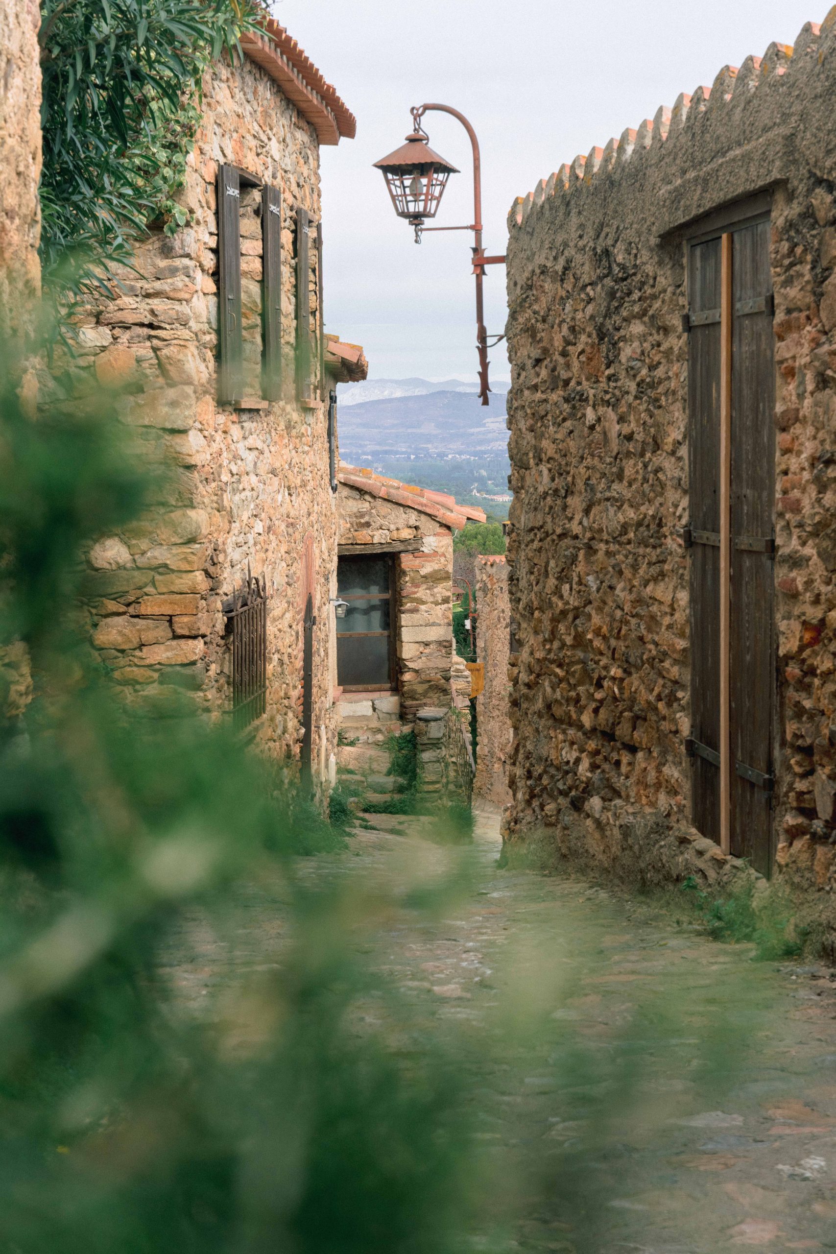 Vue d'une ruelle typique de Castelnou (66), avec ses maisons en pierre et son charme médiéval, capturée lors de la séance photo de grossesse de Marie-Ève et Philippe.