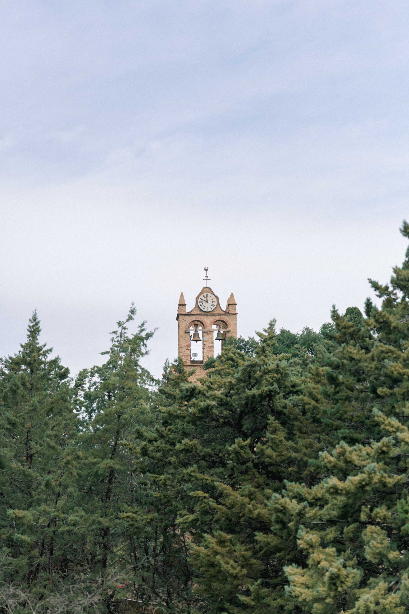 Un clocher en pierre, typique de Castelnou (66), se dresse au milieu d'une forêt verdoyante, capturé lors de la séance photo de grossesse de Marie-Ève et Philippe.