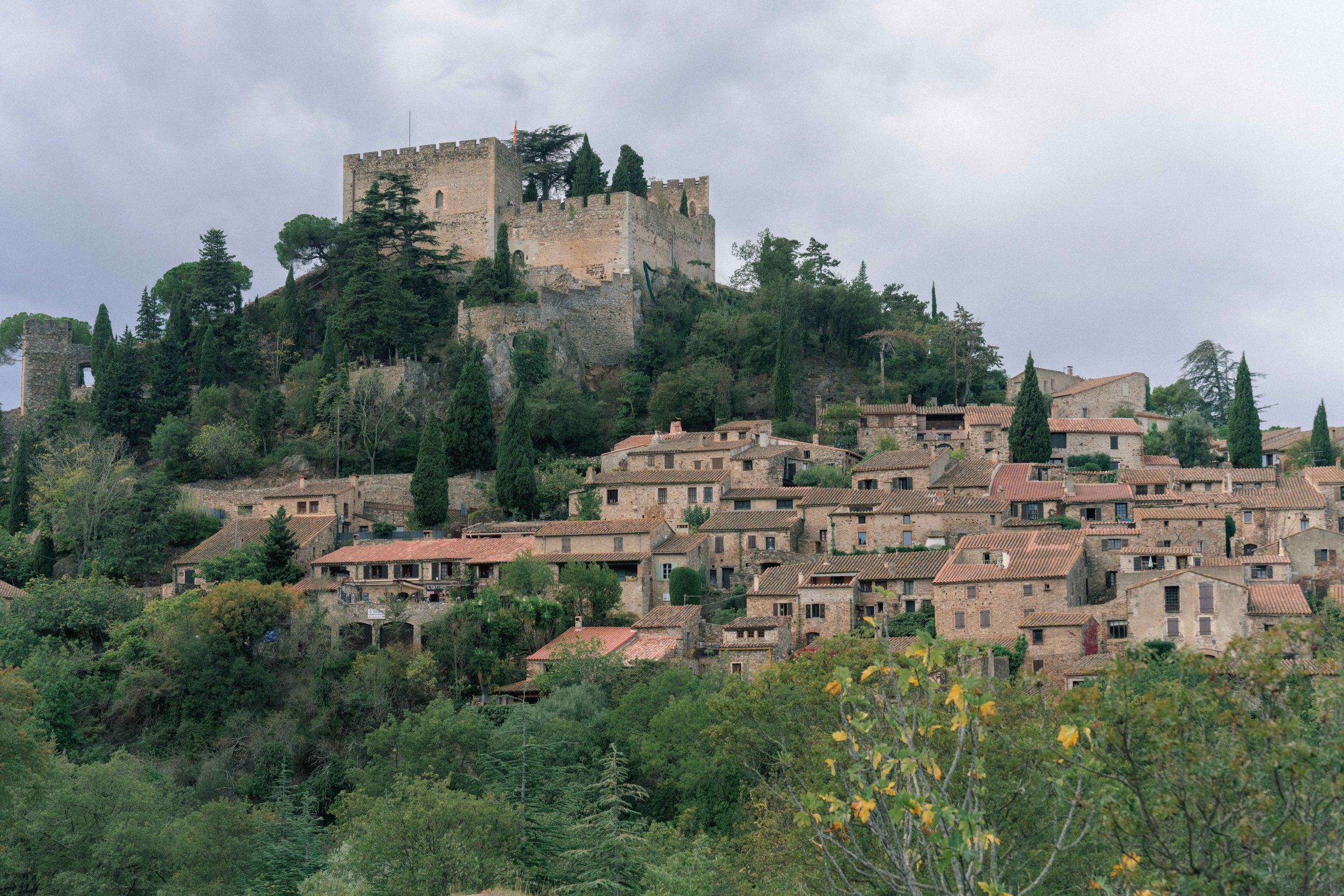 Vue pittoresque de Castelnou (66) avec son château médiéval dominant le paysage, capturée lors de la séance photo de grossesse de Marie-Ève et Philippe.