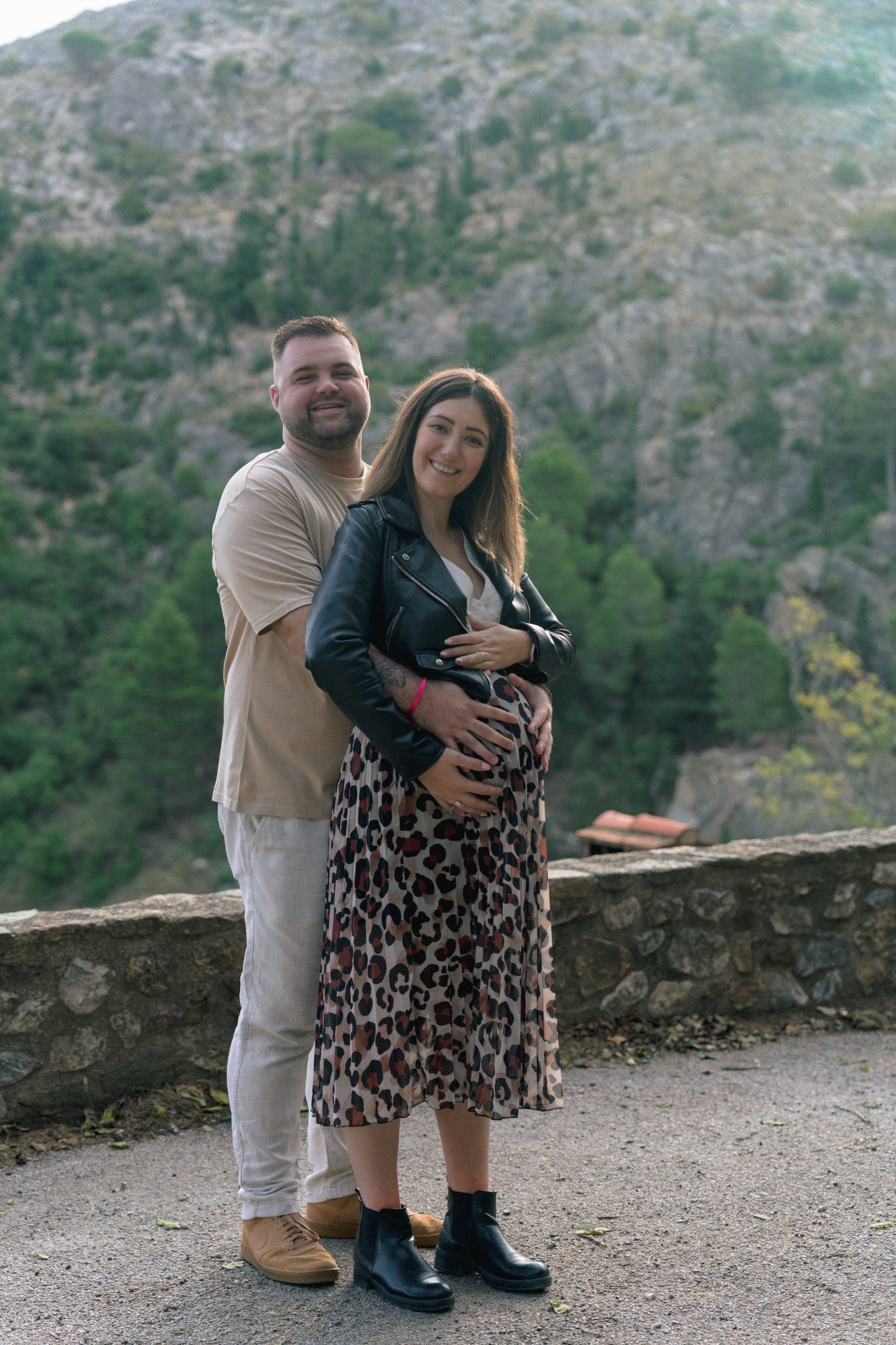 Marie-Ève et Philippe, futurs parents, regardant au loin depuis une vue en contrebas à Castelnou (66), un moment de contemplation et de rêve pour l'arrivée de bébé Léon.