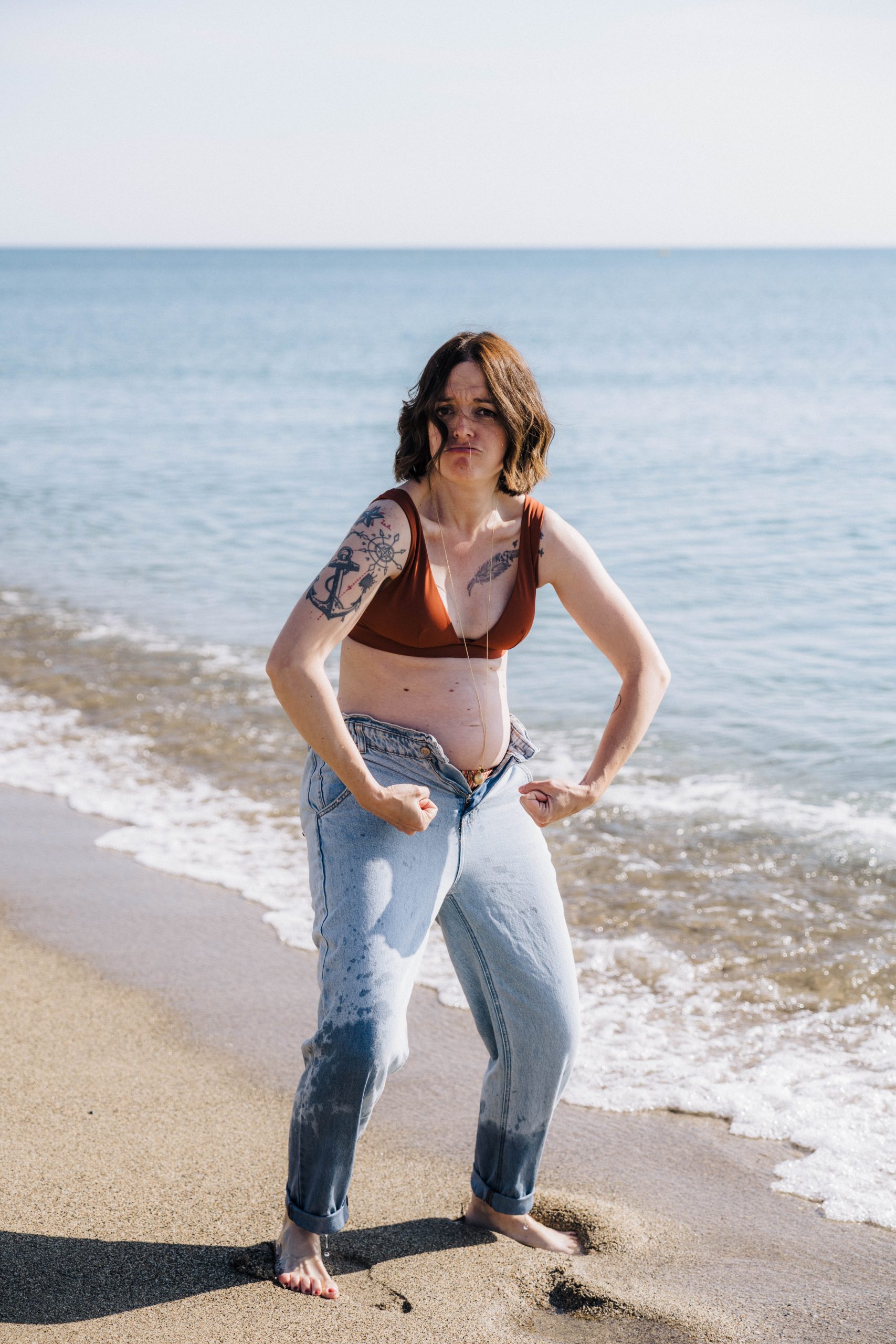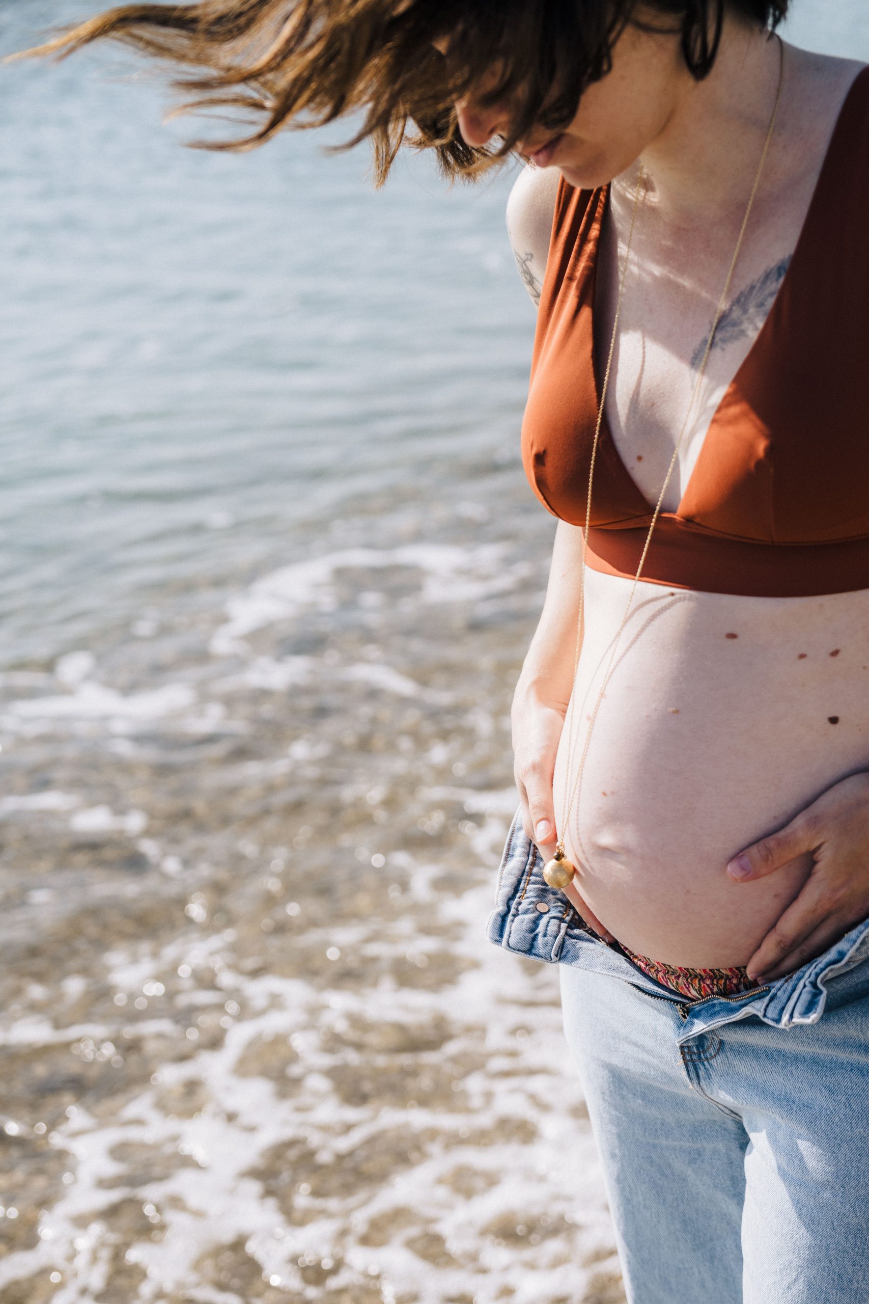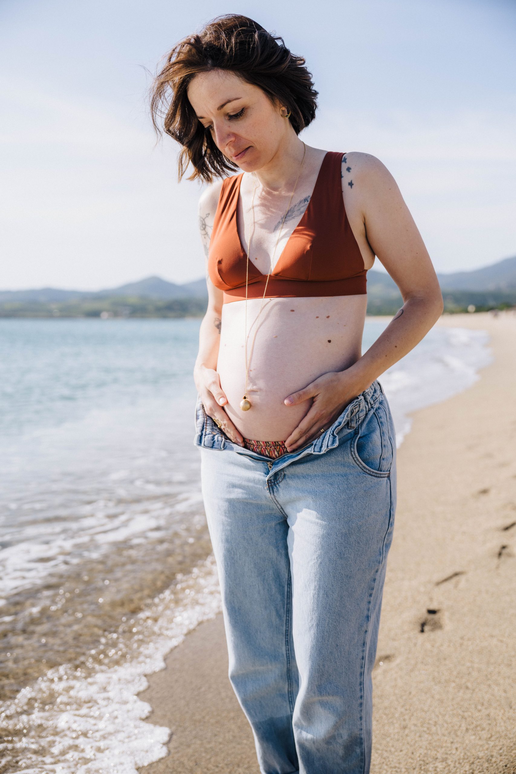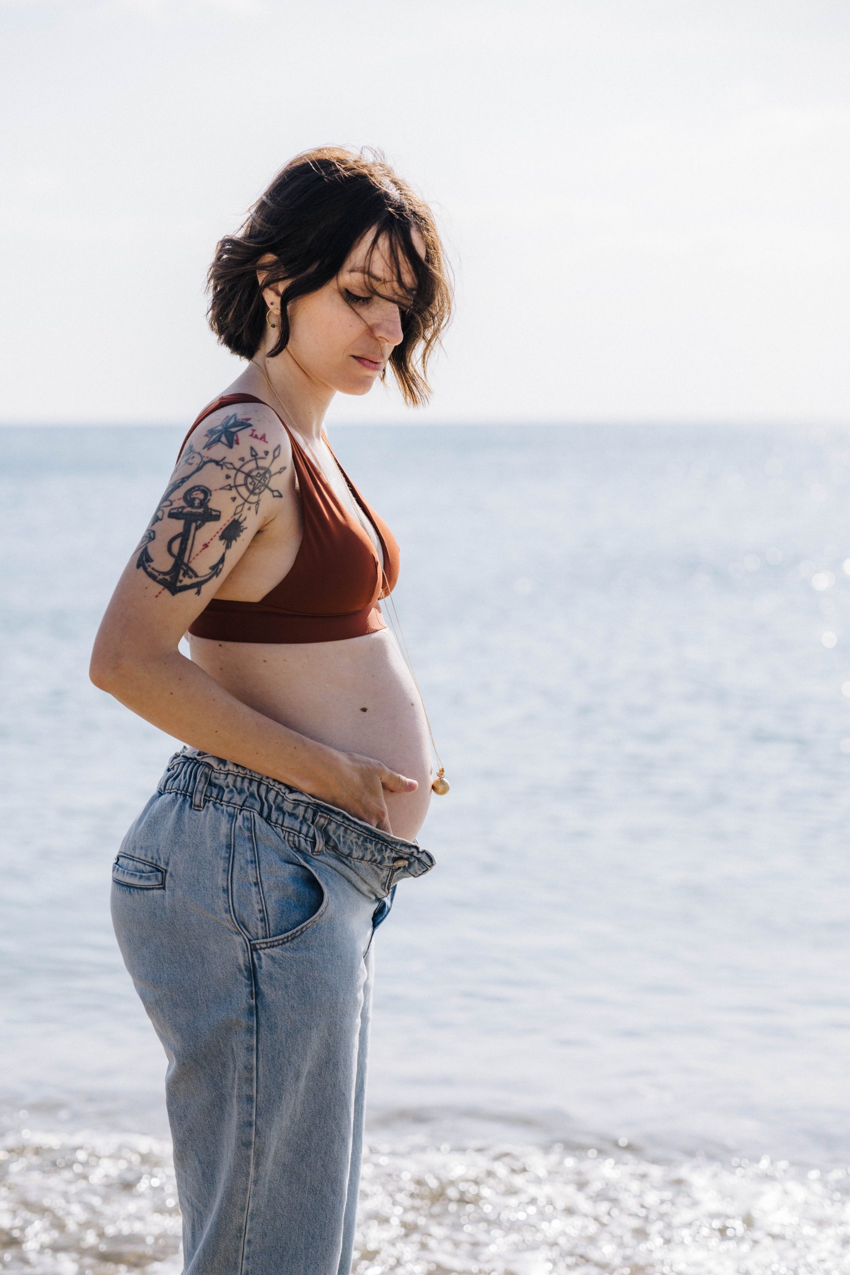 Nelly de profil, les mains posées sur son ventre de grossesse exposé, portant un haut de maillot de bain et un jean, avec ses tatouages sur le bras droit, sur la plage d'Argelès-sur-Mer.