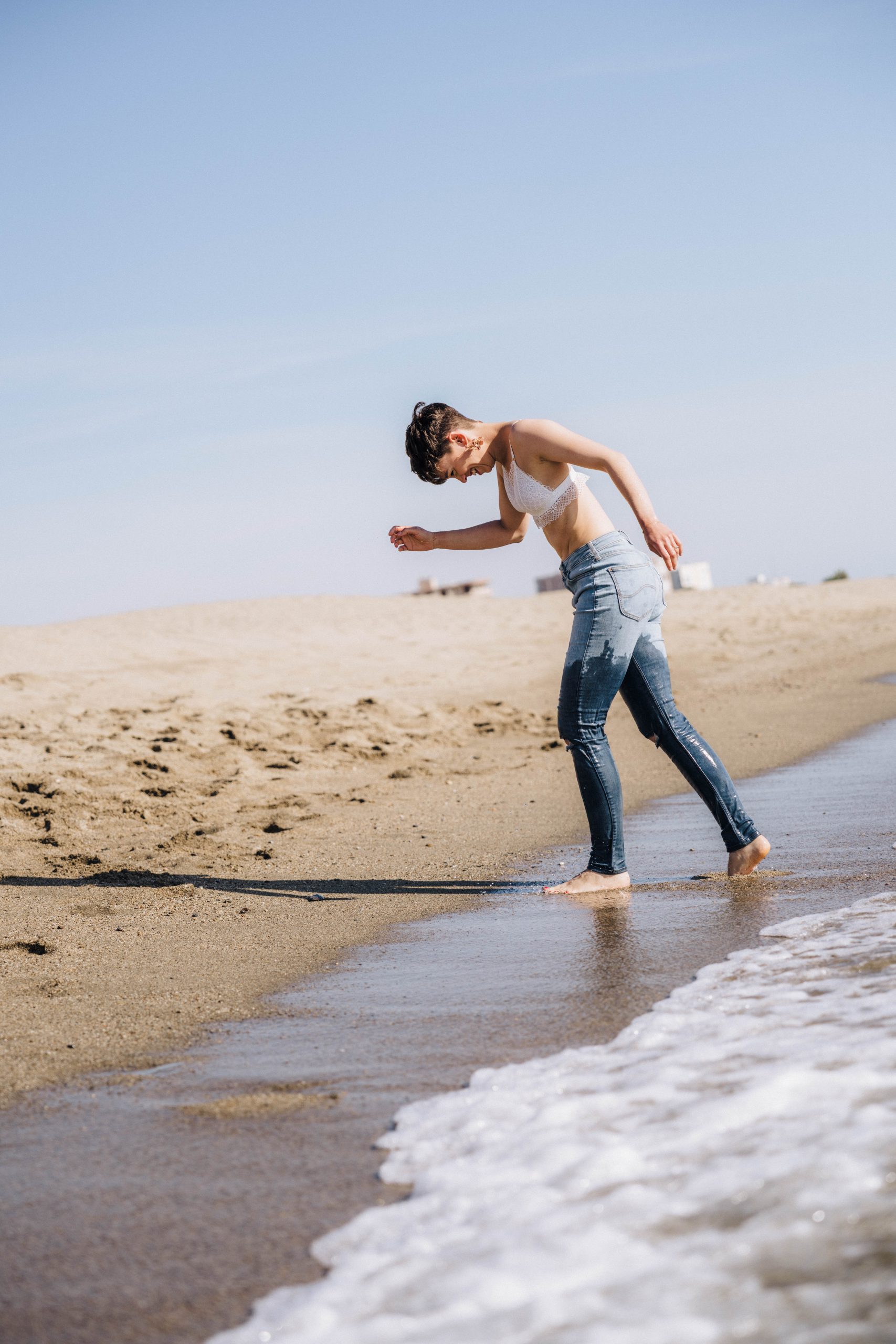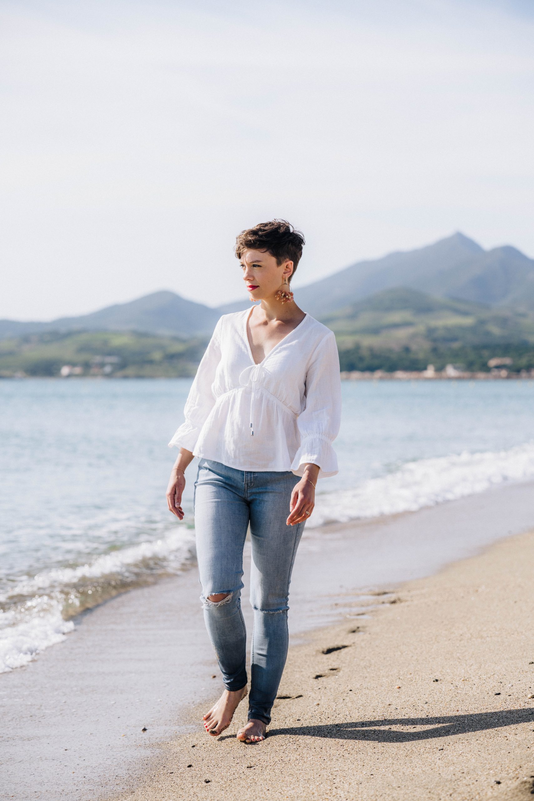 Audrey marchant sur le sable de la plage d'Argelès-sur-Mer, portant un haut blanc et un jean déchiré, avec la mer et les montagnes en arrière-plan, lors de la séance grossesse.