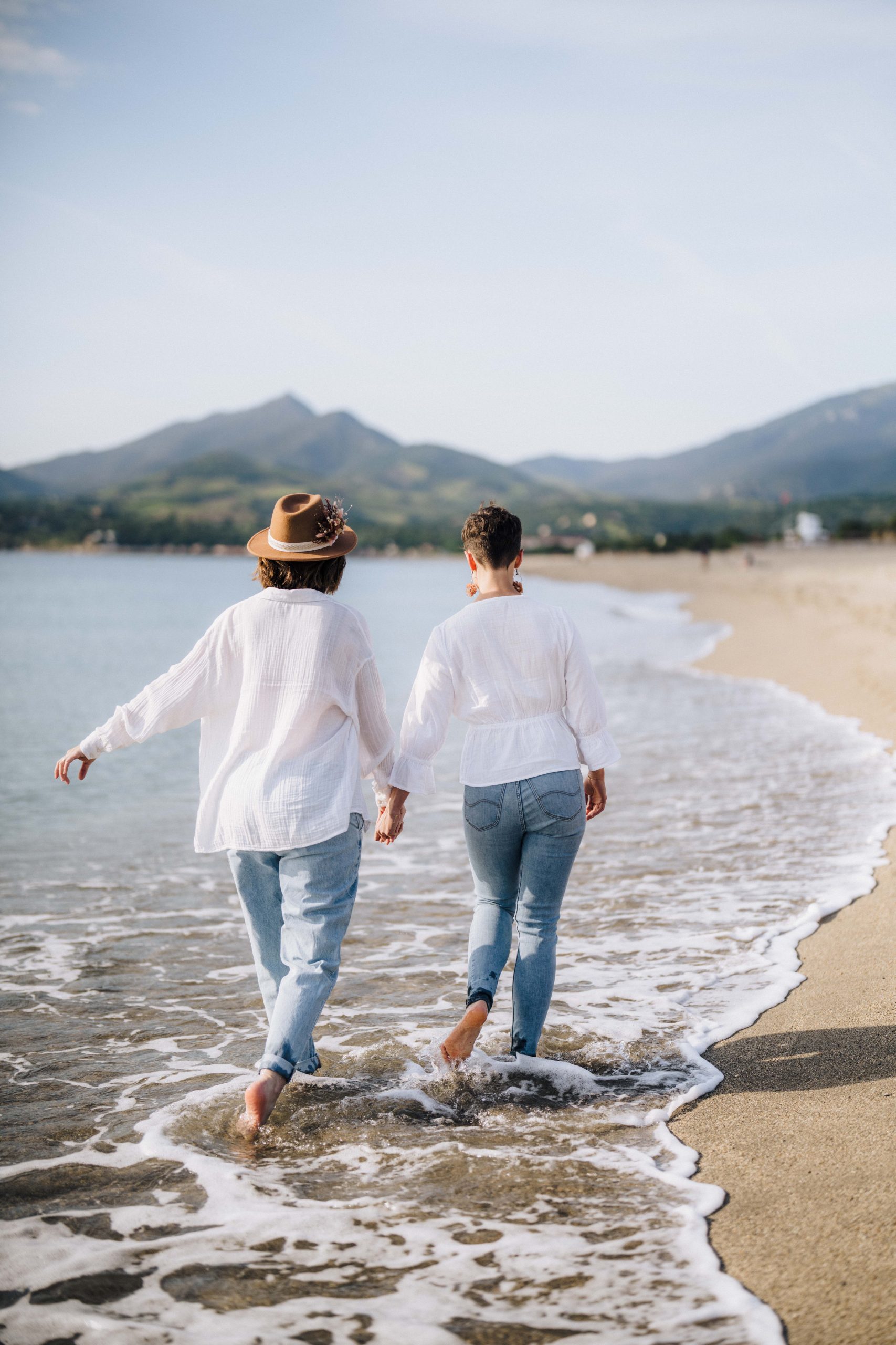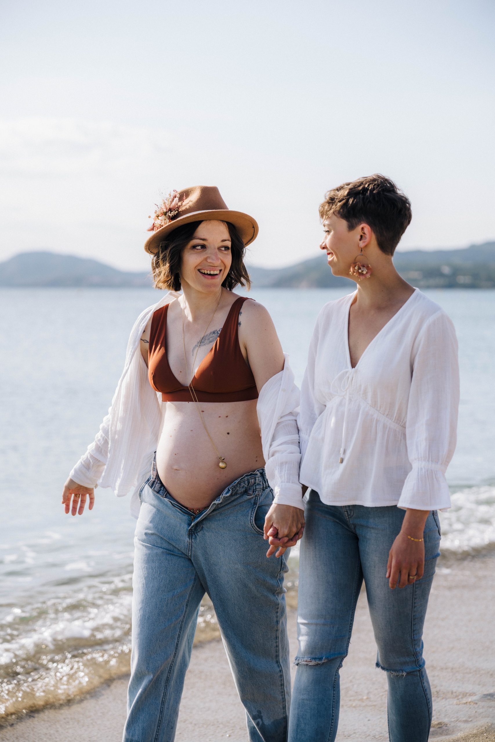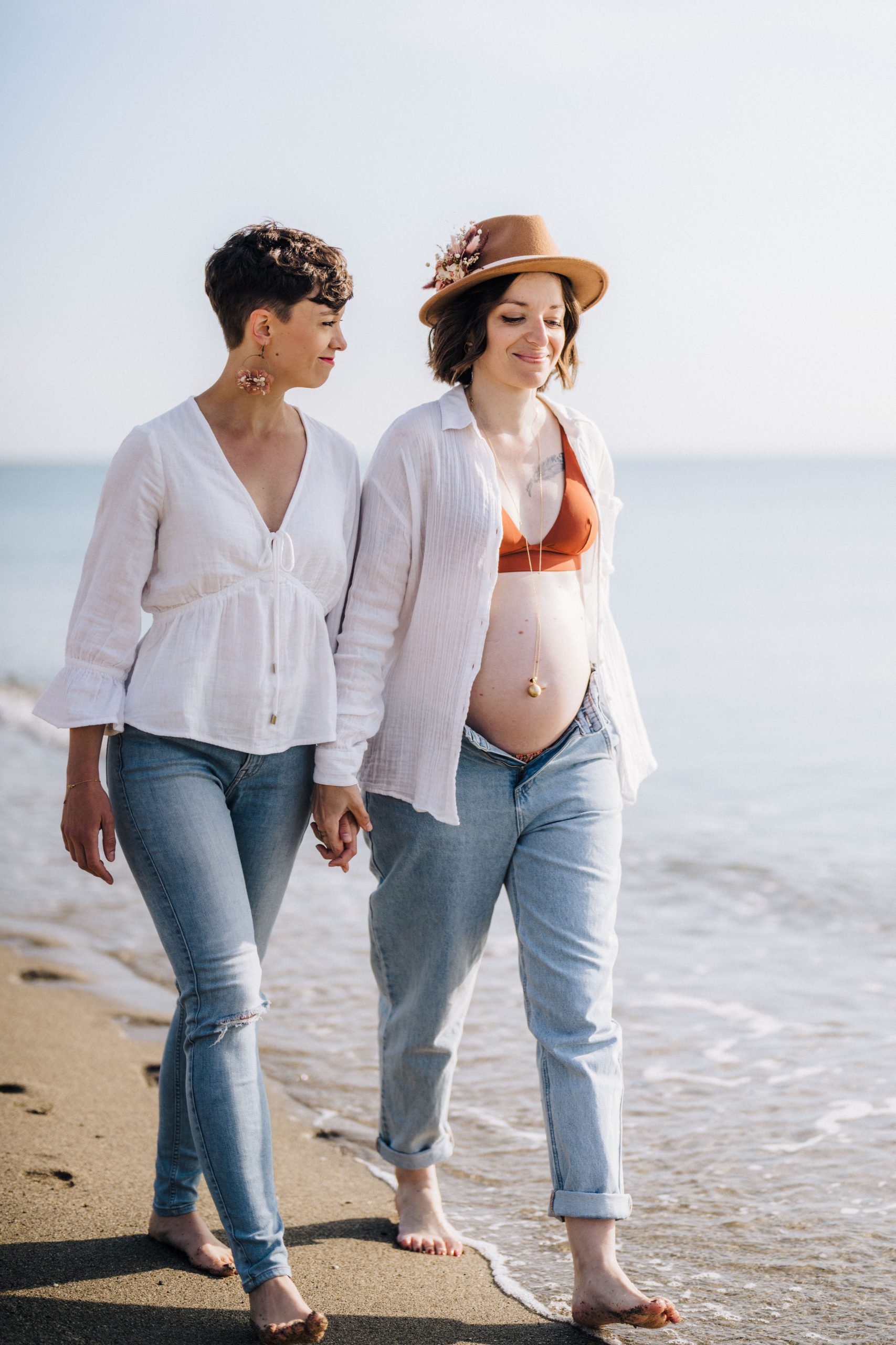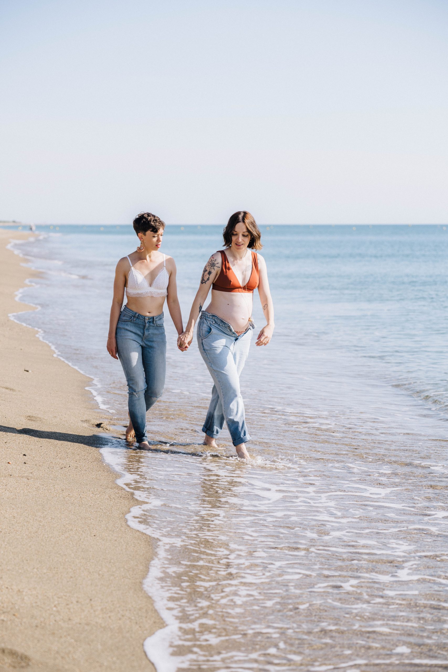 Nelly et Audrey marchant main dans la main le long de la plage d'Argelès-sur-Mer, le ventre de grossesse de Nelly étant mis en valeur.