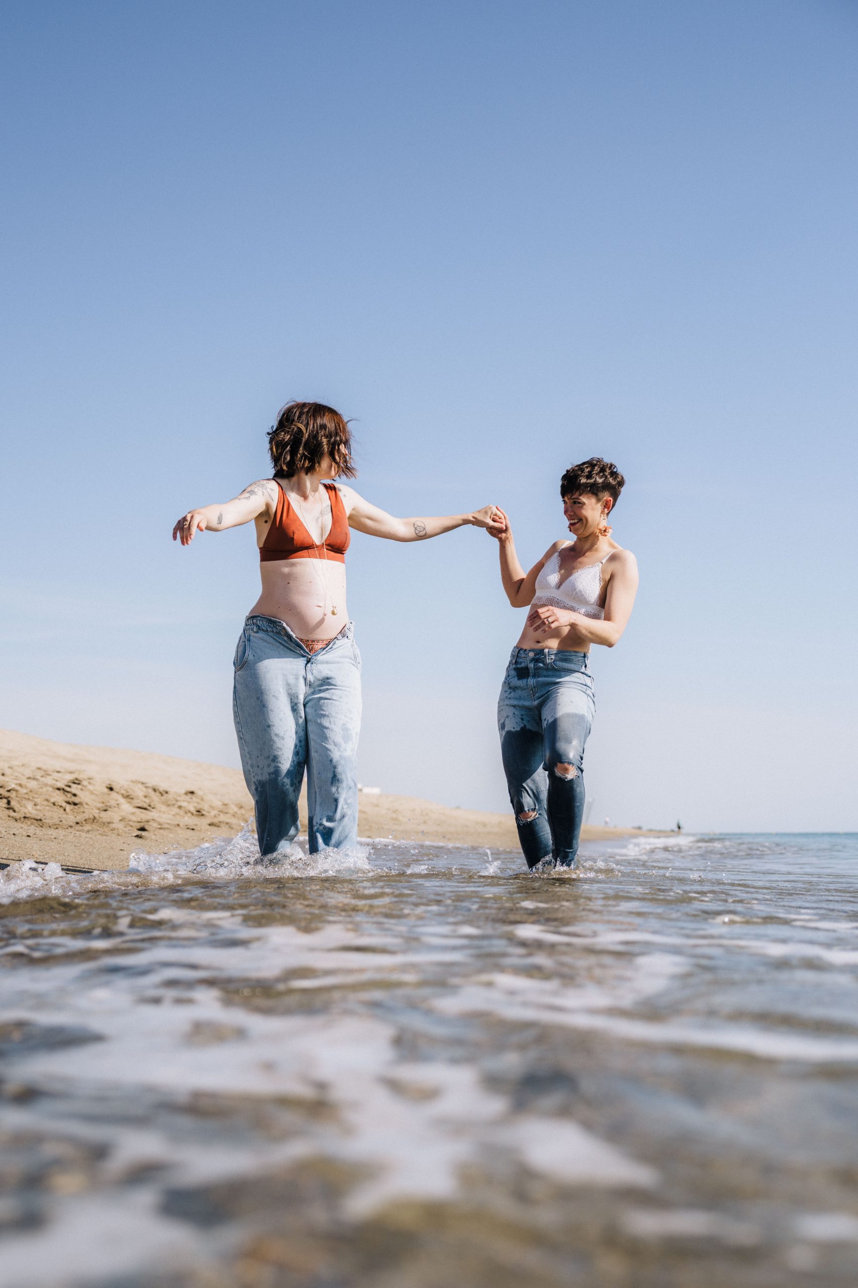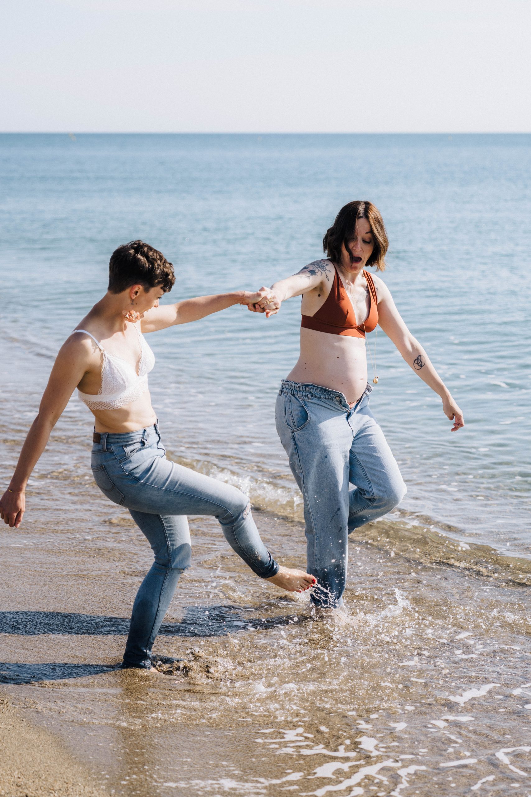 Nelly et Audrey se tenant la main et riant dans l'eau sur la plage d'Argelès-sur-Mer, Nelly avec son ventre de grossesse exposé, partageant un moment de pure joie.