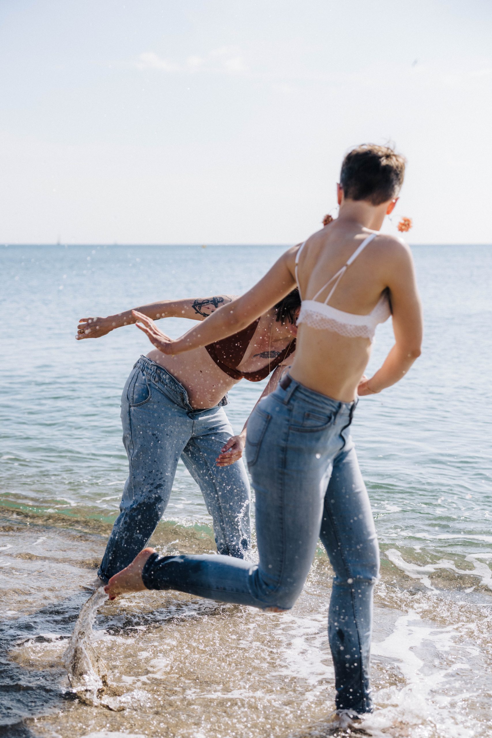 Nelly et Audrey s'éclaboussant joyeusement dans l'eau sur la plage d'Argelès-sur-Mer, Nelly avec son ventre de grossesse exposé, partageant un moment ludique et insouciant.
