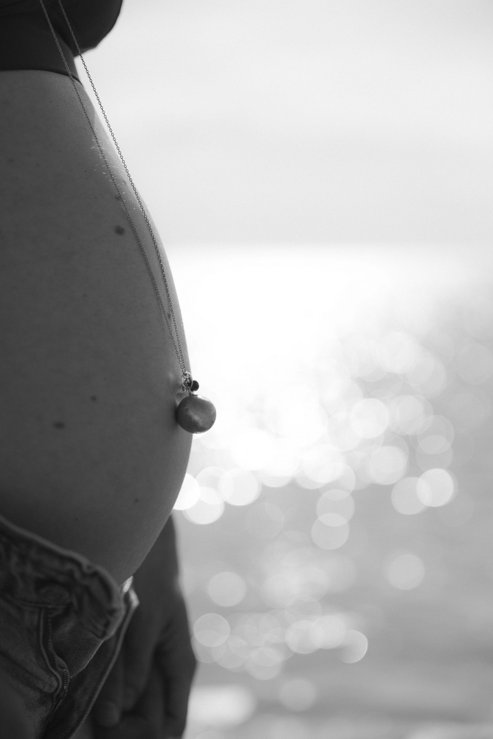 Gros plan en noir et blanc sur le ventre de grossesse de Nelly, avec un bola de grossesse pendant, et des reflets lumineux de la mer en arrière-plan flou, lors de la séance à Argelès-sur-Mer.