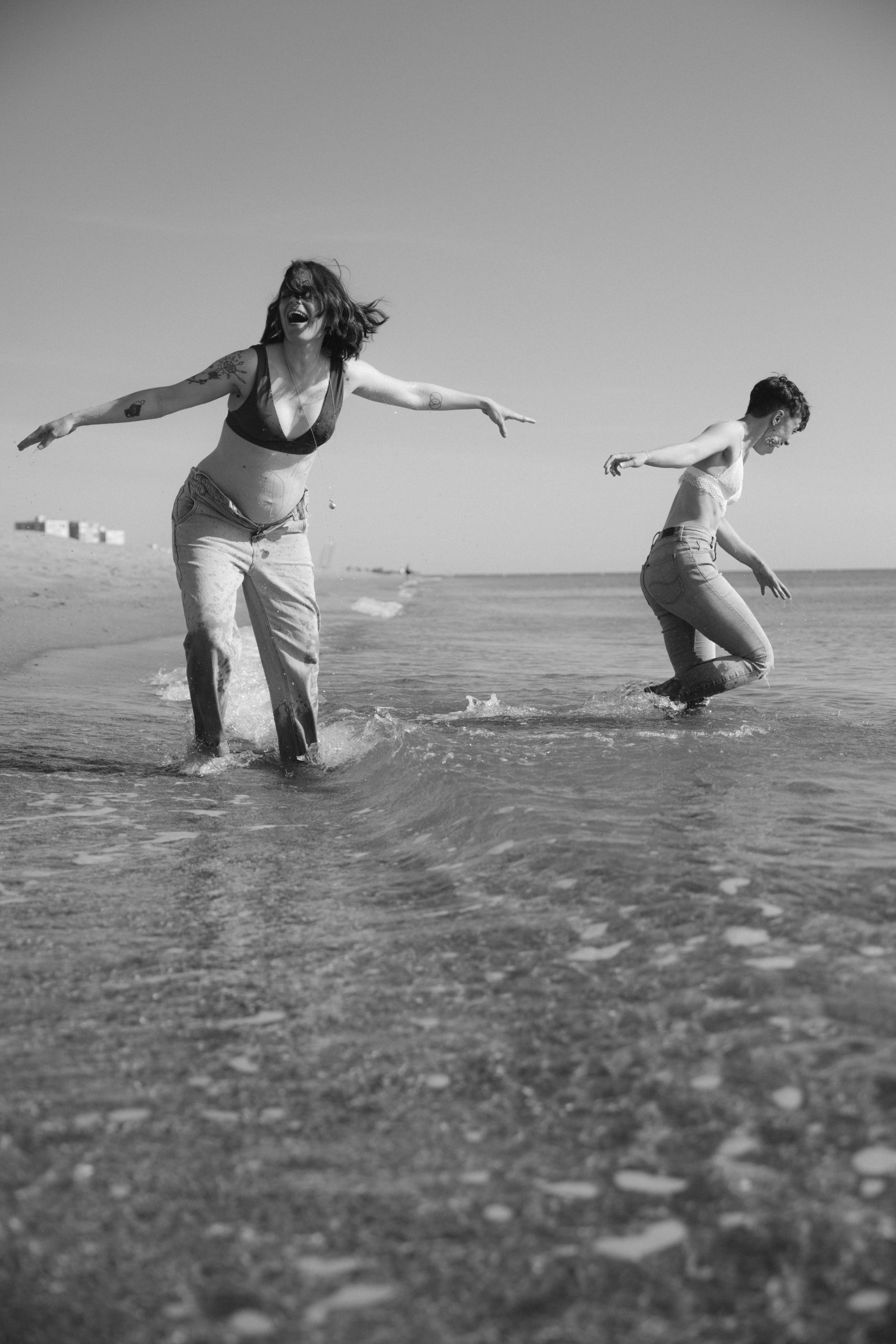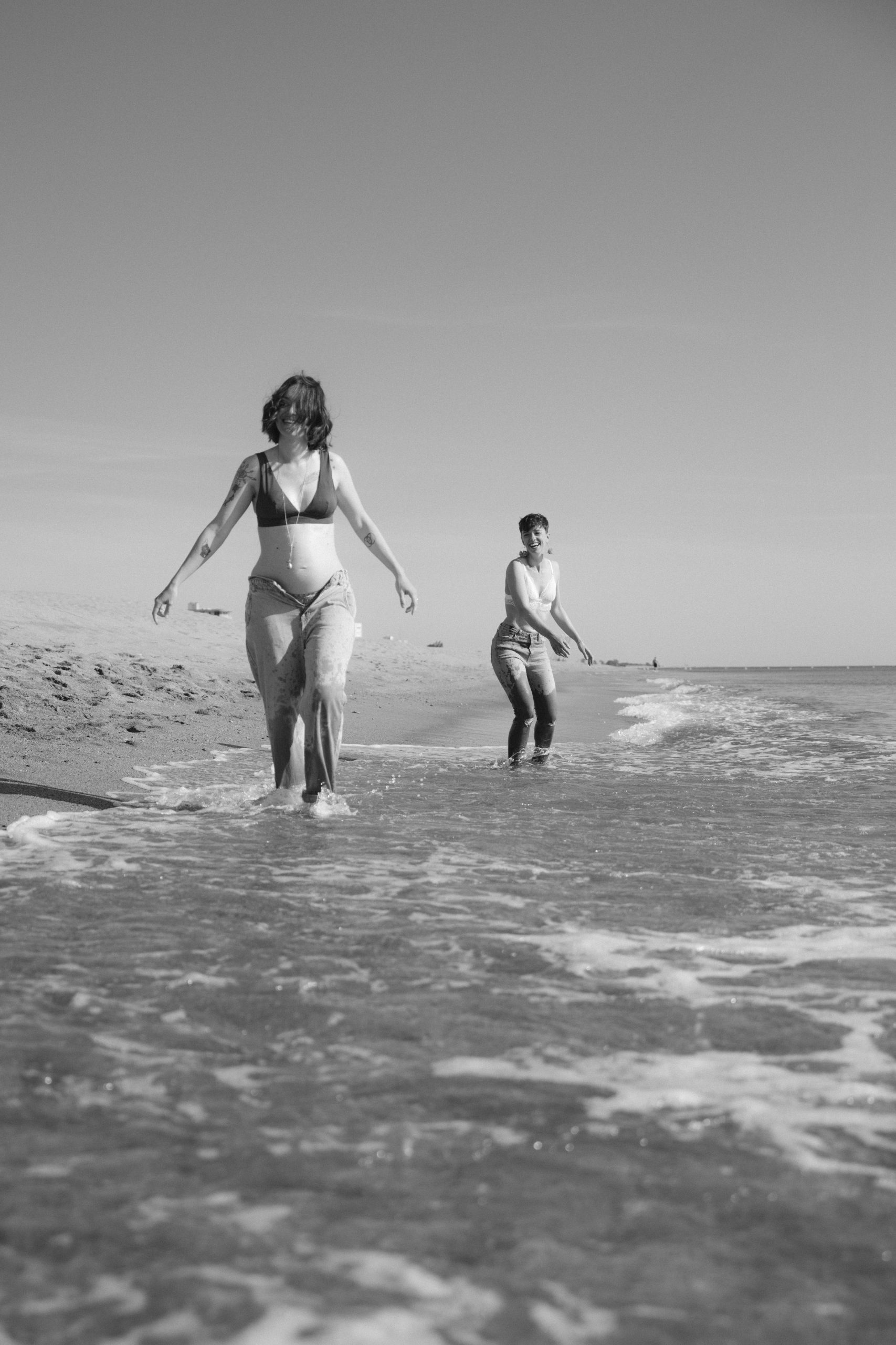 Nelly et Audrey en noir et blanc, marchant dans l'eau peu profonde sur la plage d'Argelès-sur-Mer, Nelly avec son ventre de grossesse exposé, un moment de complicité et de sérénité.