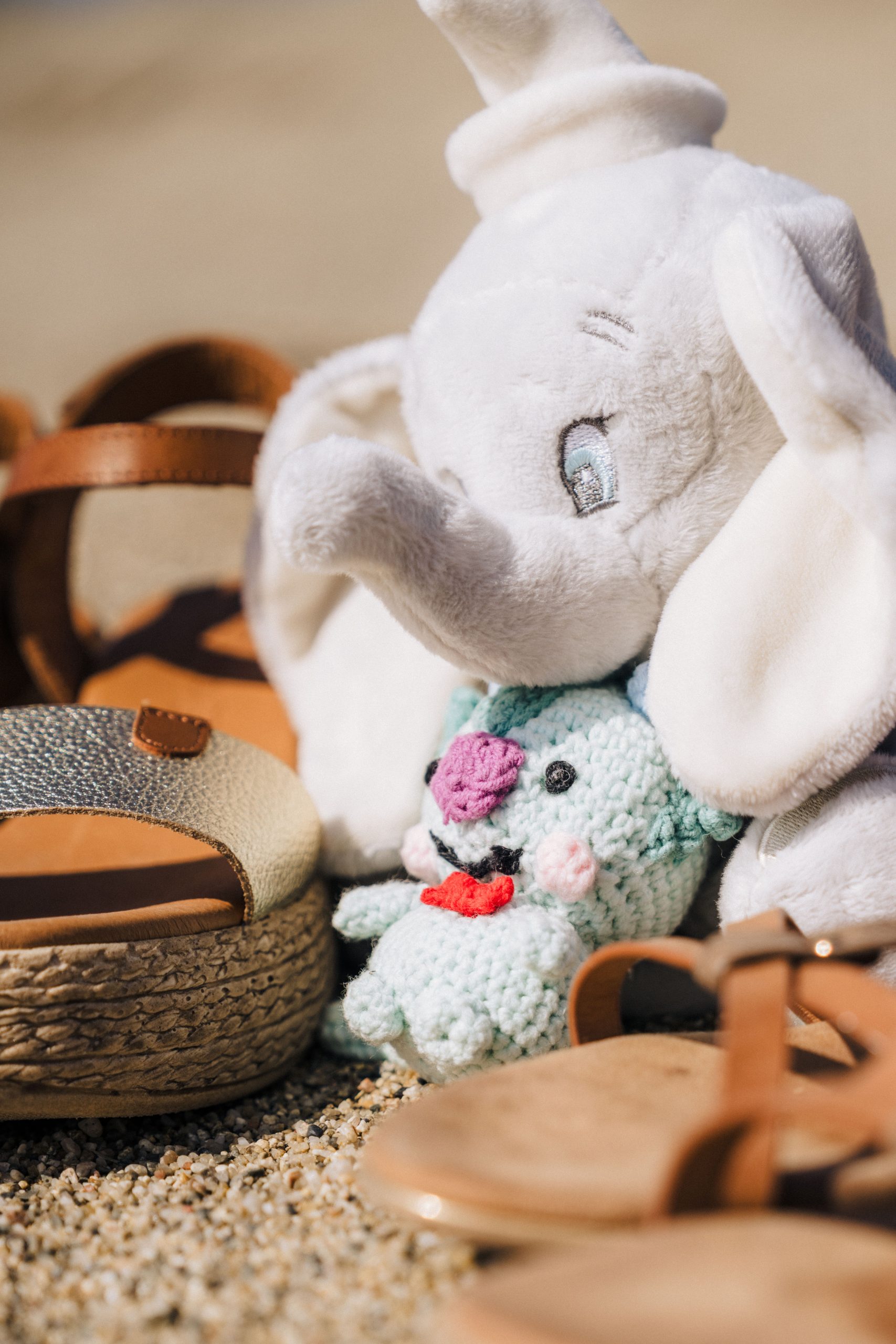 Gros plan sur un éléphant en peluche blanc et une petite créature turquoise au crochet, posés sur le sable, entourés de sandales en cuir, symbolisant l'attente du bébé lors de la séance grossesse.