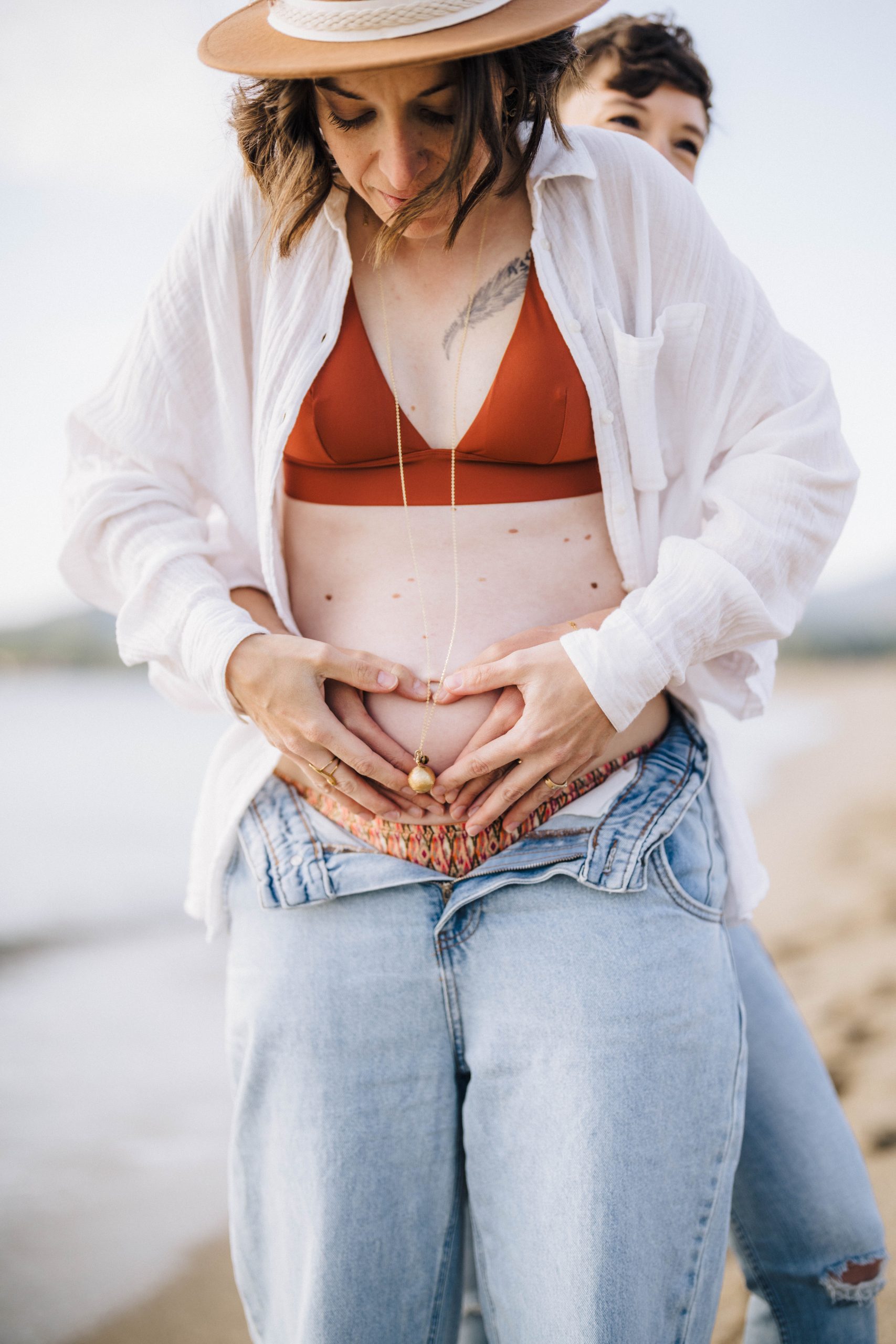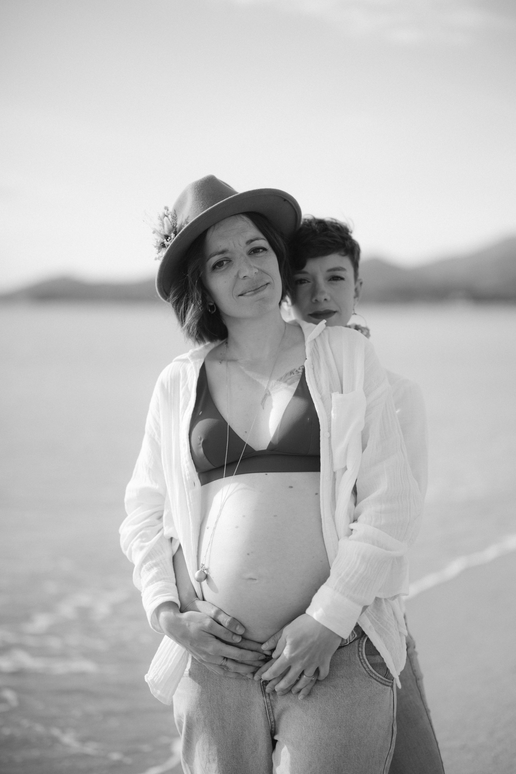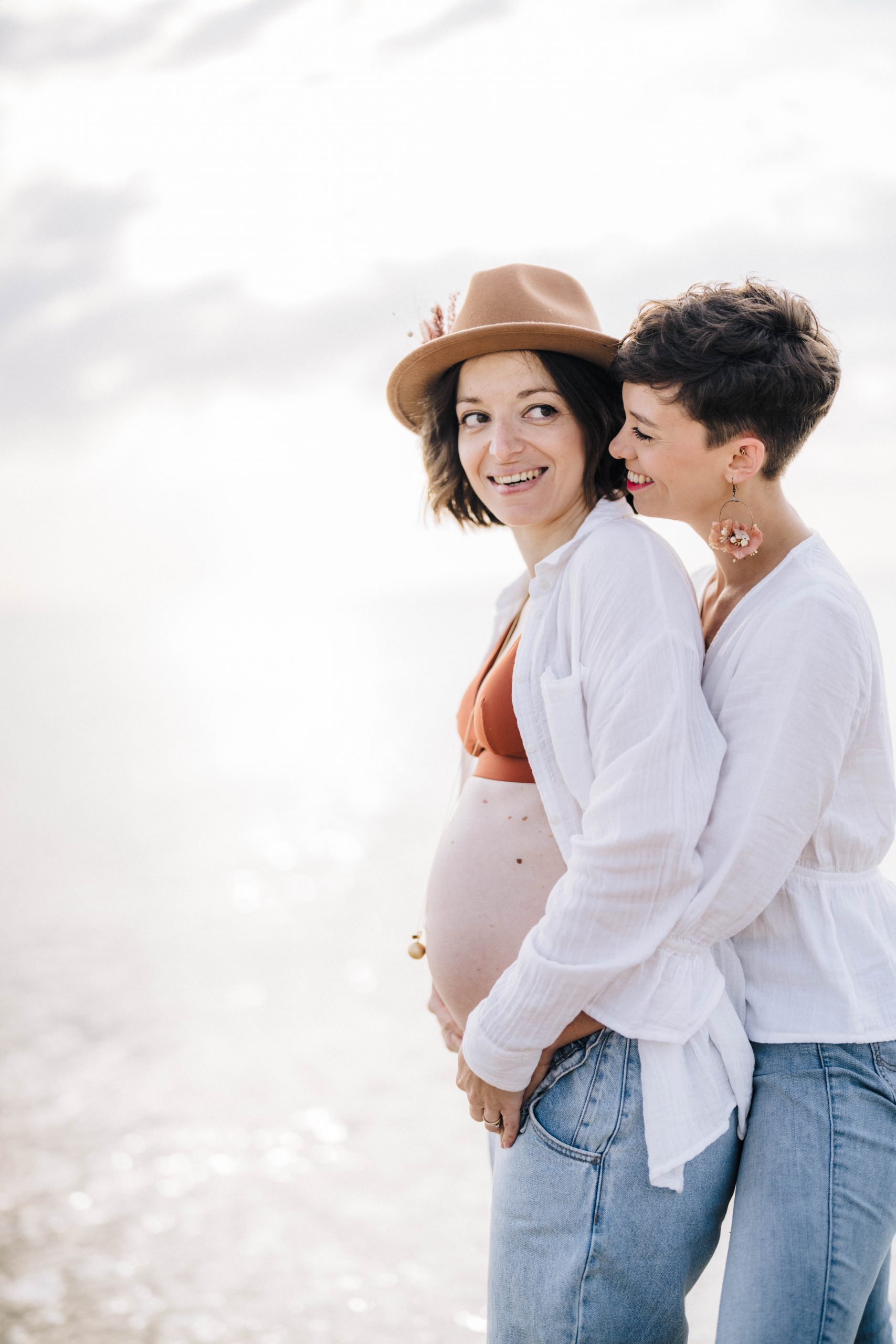 Nelly et Audrey, un couple souriant, posant sur la plage d'Argelès-sur-Mer durant leur séance photo de grossesse, la main sur le ventre.