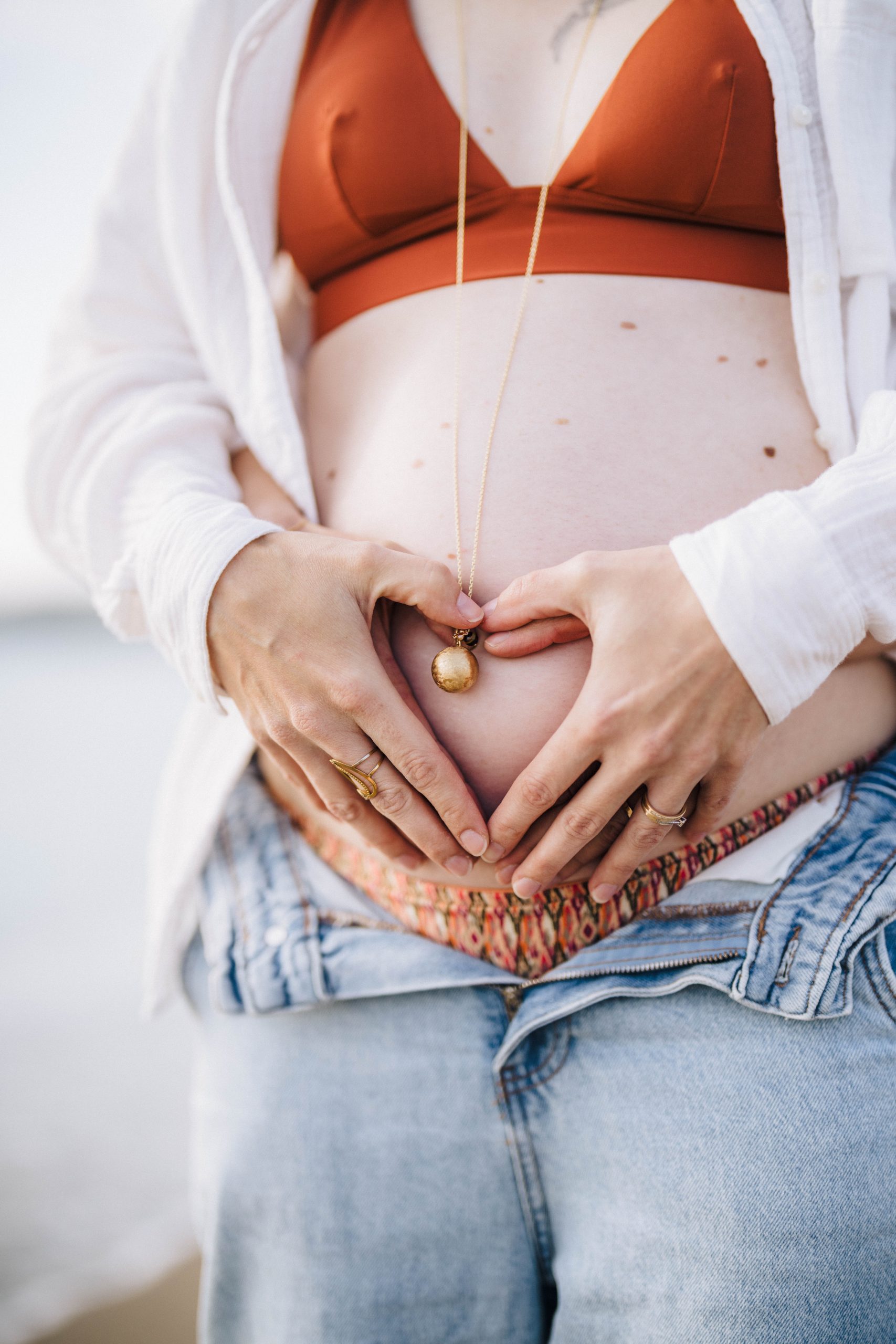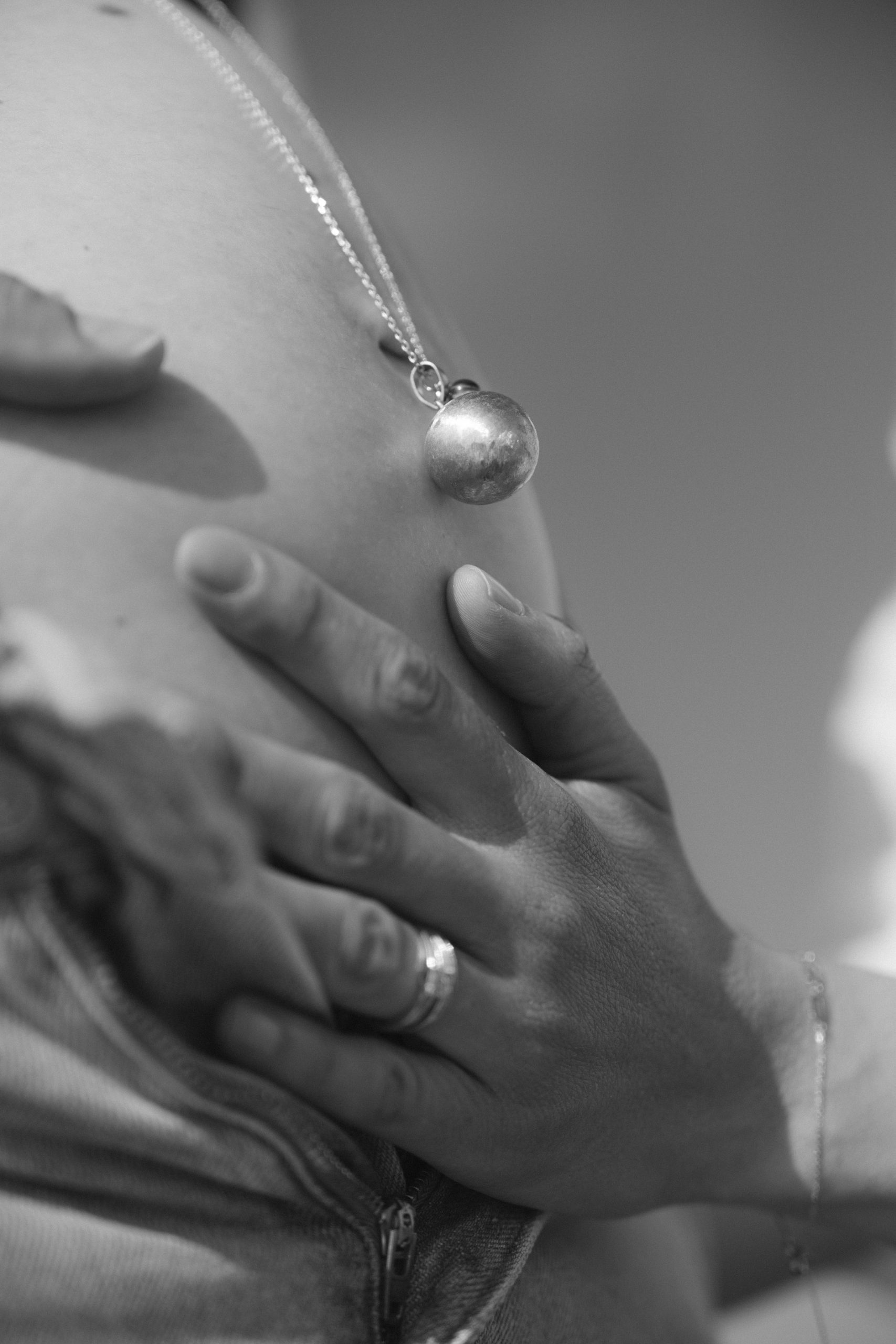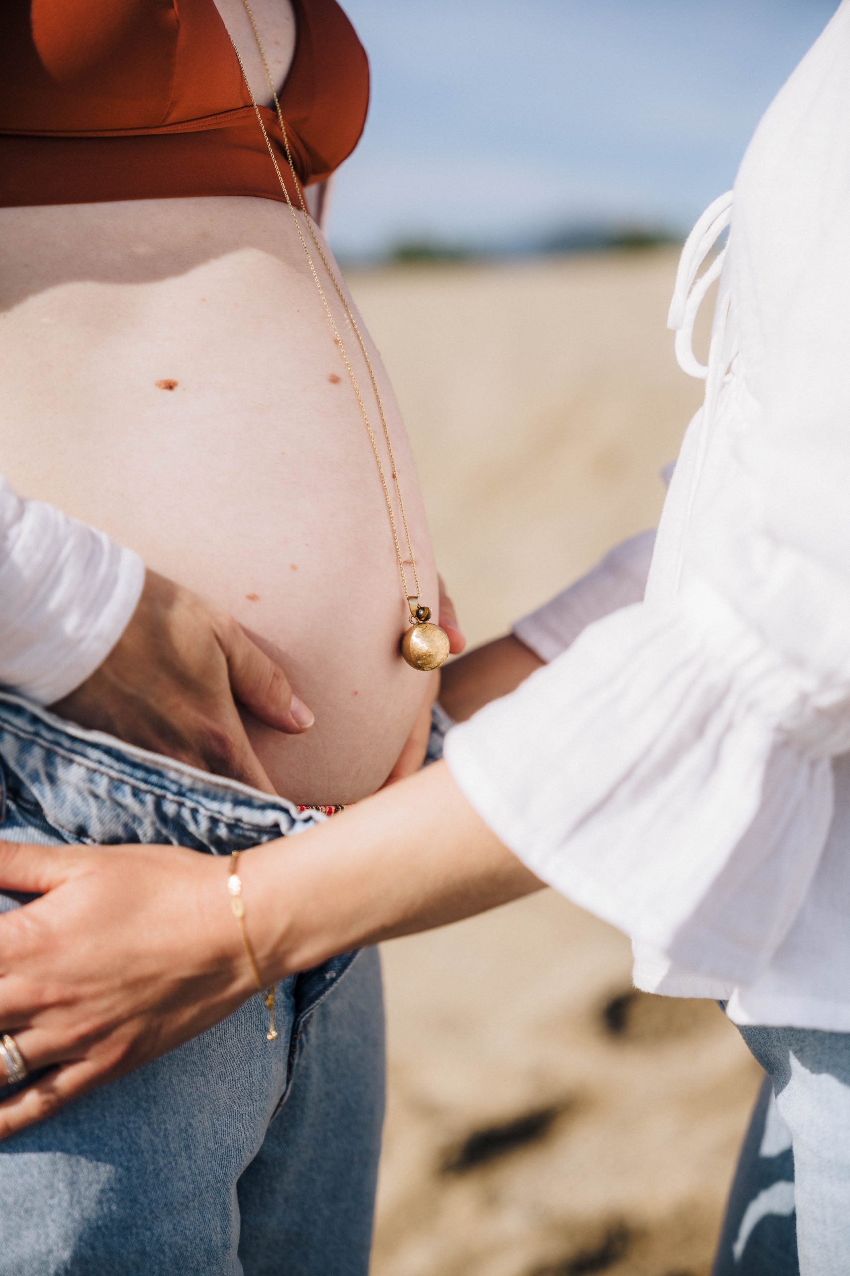 Gros plan sur le ventre de grossesse de Nelly, avec les mains d'Audrey et de Nelly posées dessus, et un bola de grossesse doré, pendant leur séance à Argelès-sur-Mer.