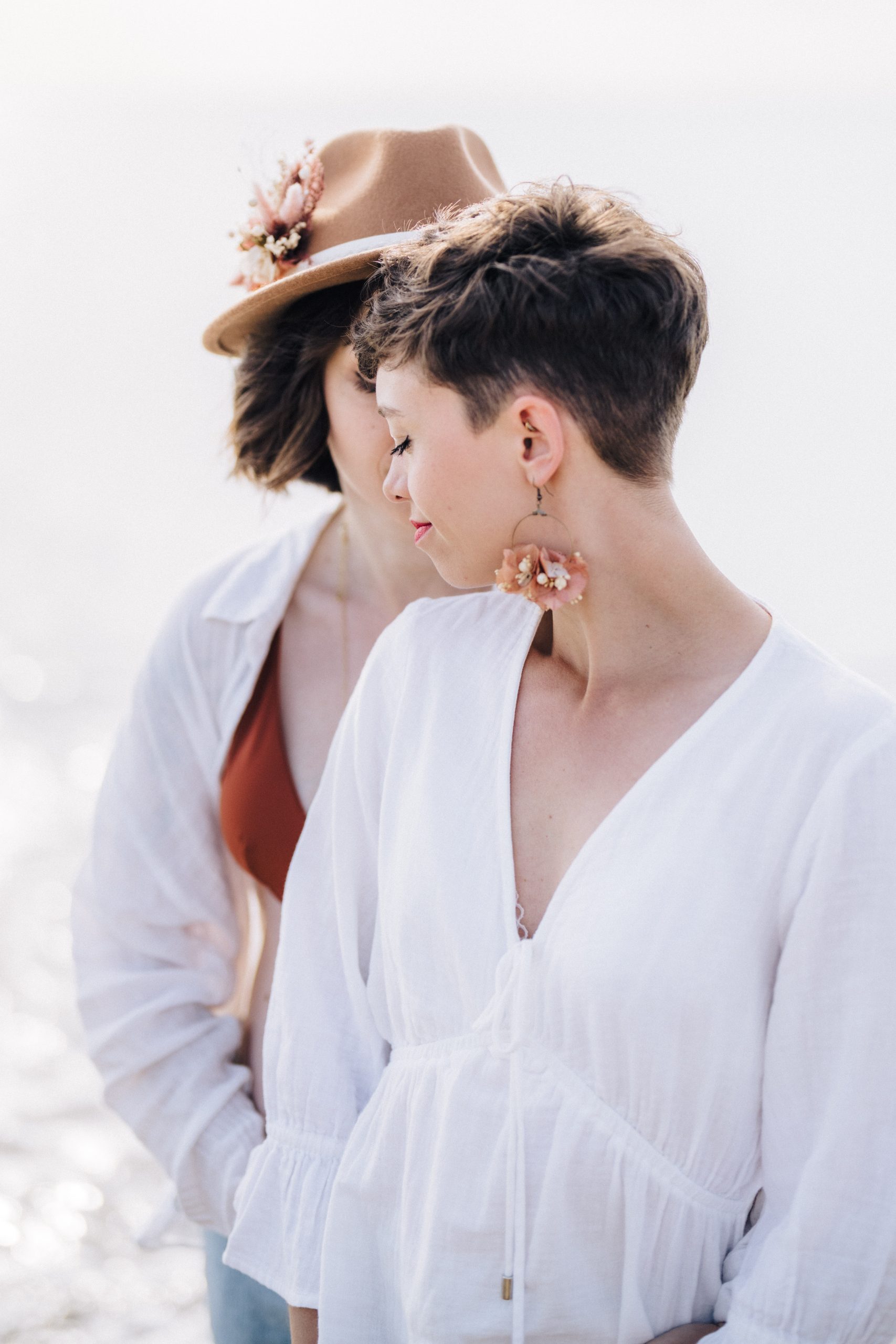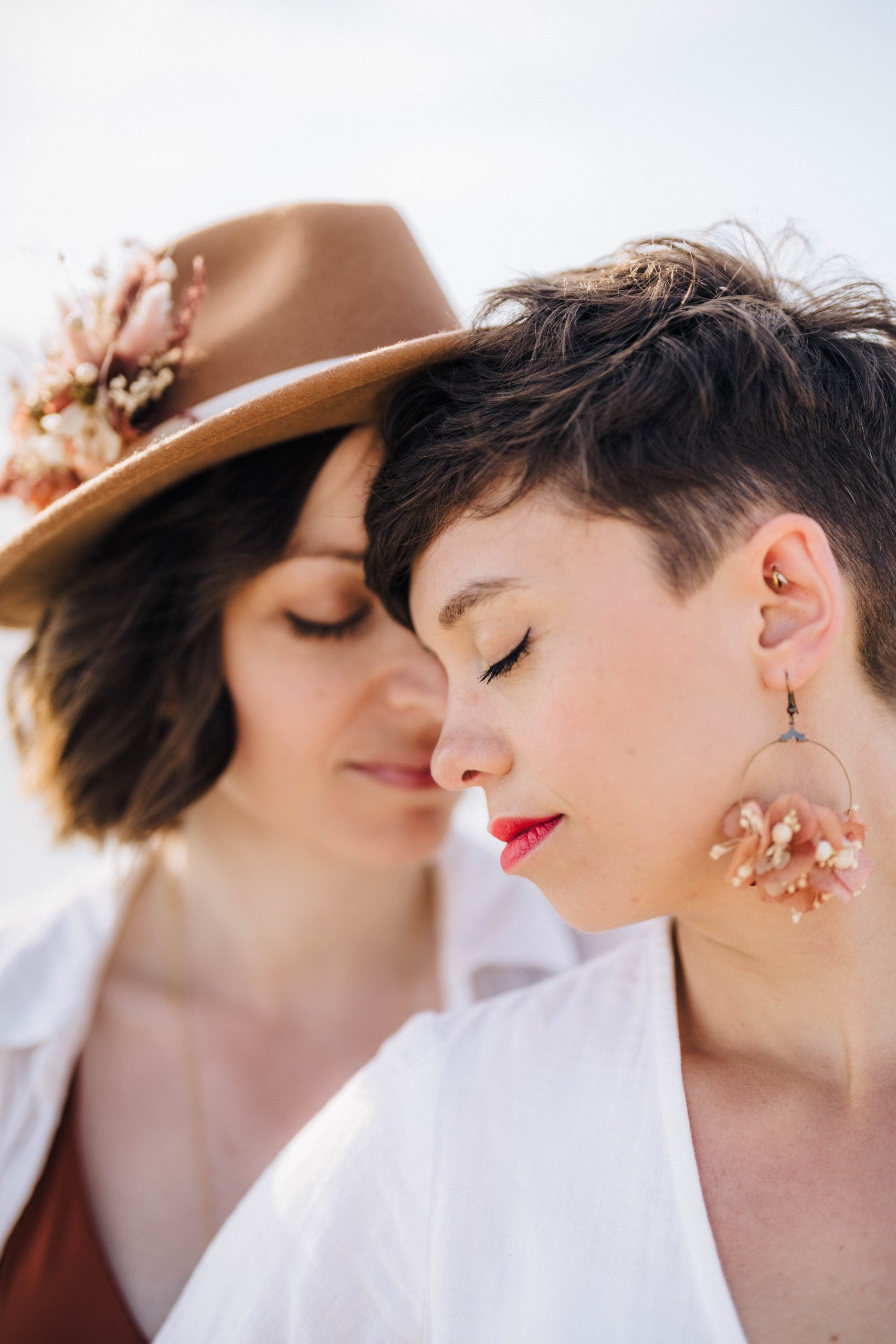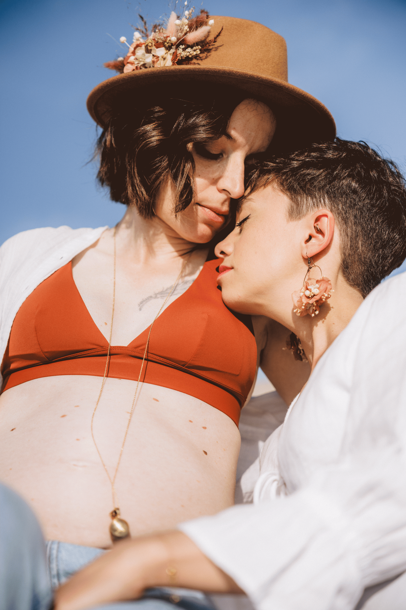Portraits intimes de Nelly et Audrey partageant un moment de tendresse durant leur séance grossesse à Argelès-sur-Mer.
