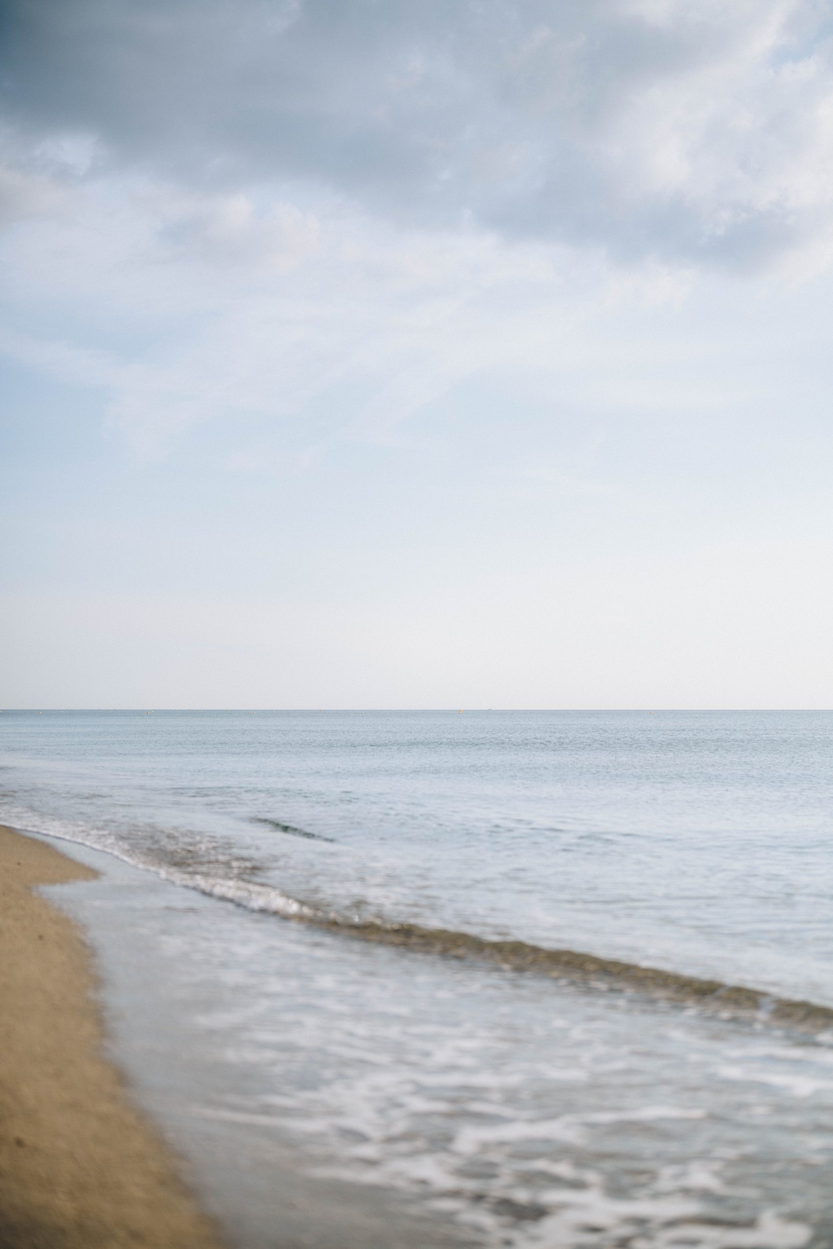 Vue d'une plage calme et de la mer Méditerranée à Argelès-sur-Mer, sous un ciel légèrement nuageux.