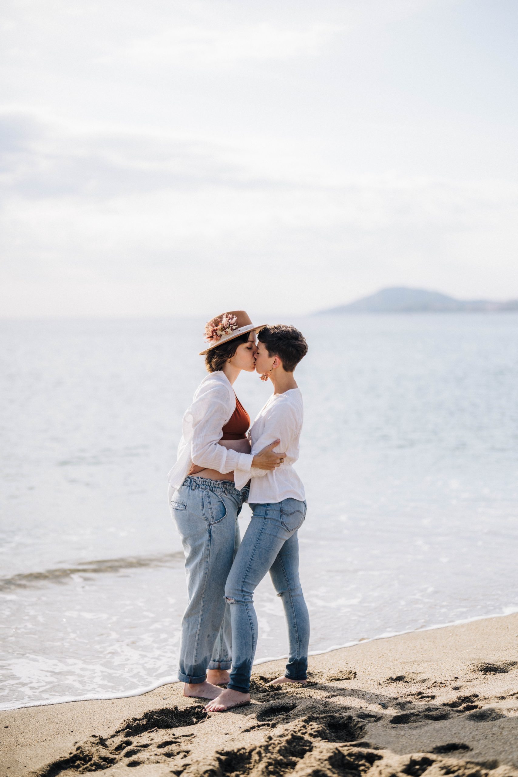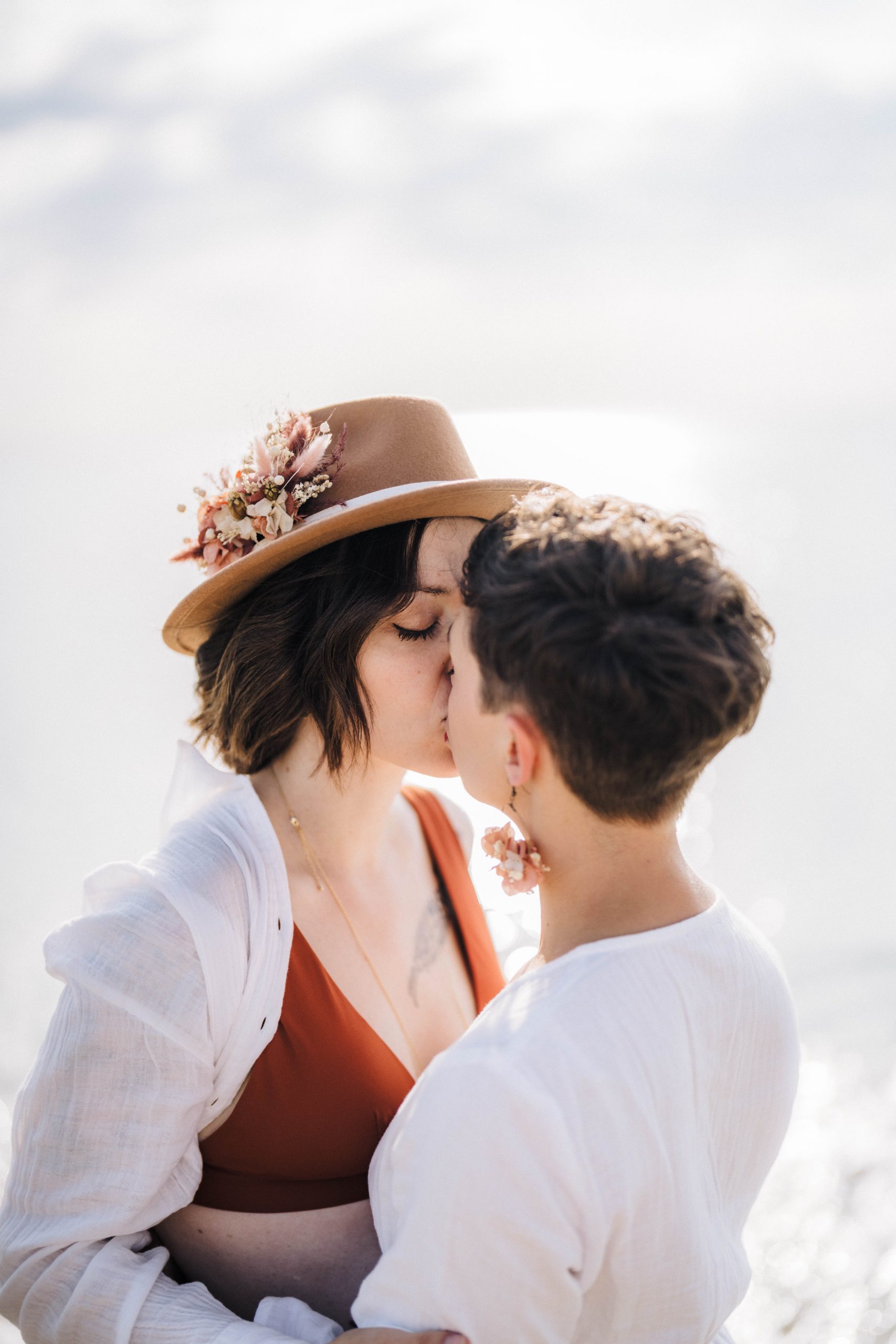 Nelly et Audrey s'embrassant en gros plan sur la plage d'Argelès-sur-Mer, exprimant leur amour durant leur séance grossesse.