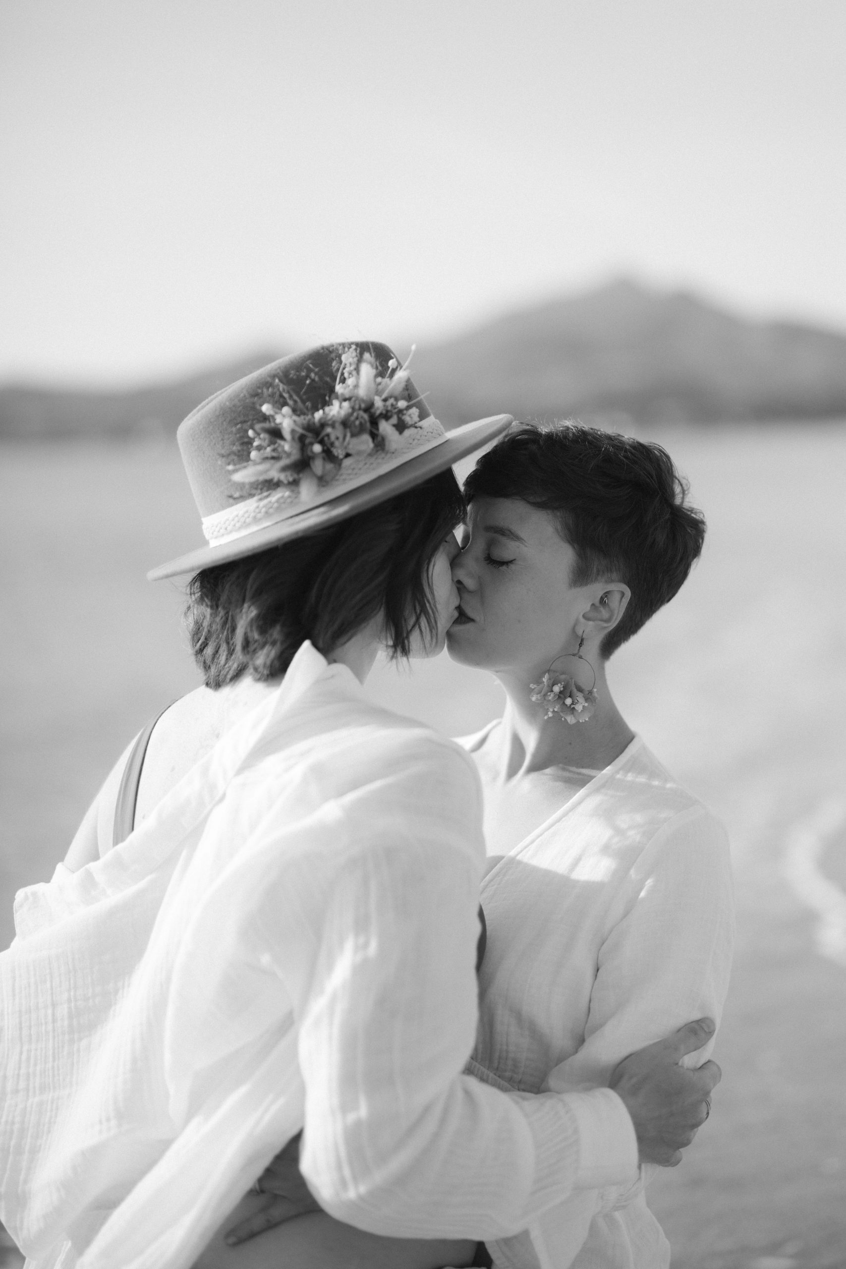 Photo en noir et blanc de Nelly et Audrey s'embrassant tendrement en gros plan sur la plage d'Argelès-sur-Mer, pendant leur séance grossesse.