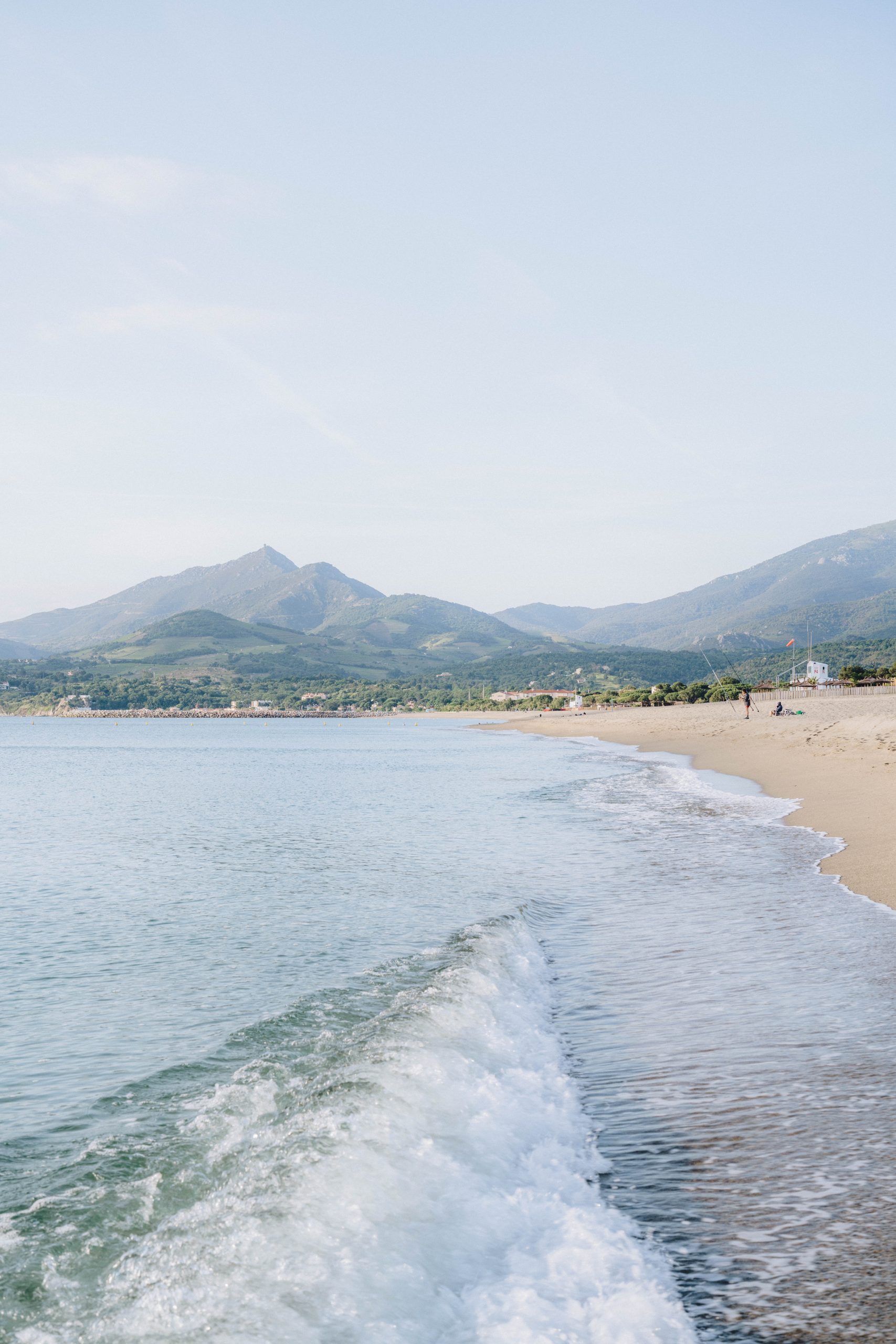Vue panoramique de la plage d'Argelès-sur-Mer avec la mer et les montagnes en arrière-plan, idéale pour une séance photo de grossesse.