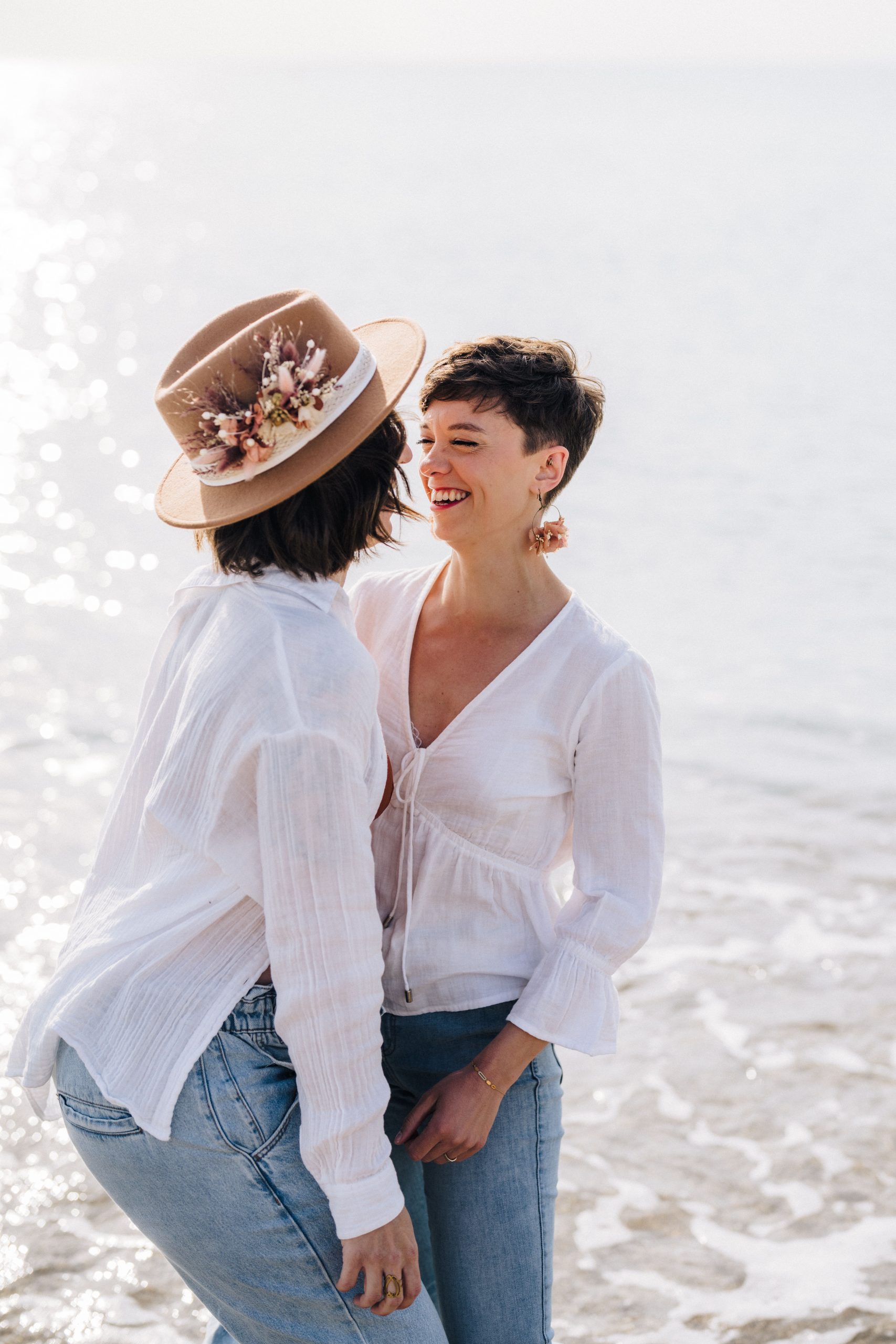 Nelly et Audrey, un couple souriant et complice, se regardent tendrement lors de leur séance photo de grossesse à Argelès-sur-Mer.